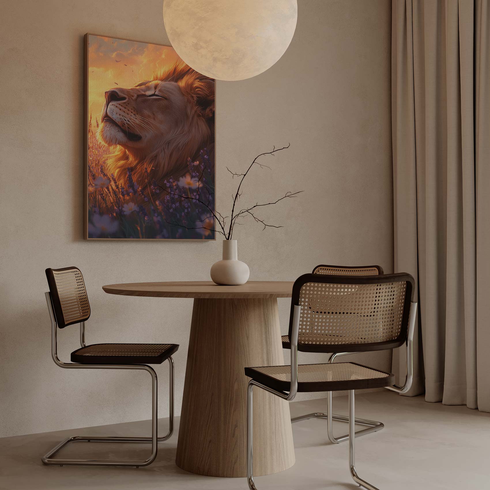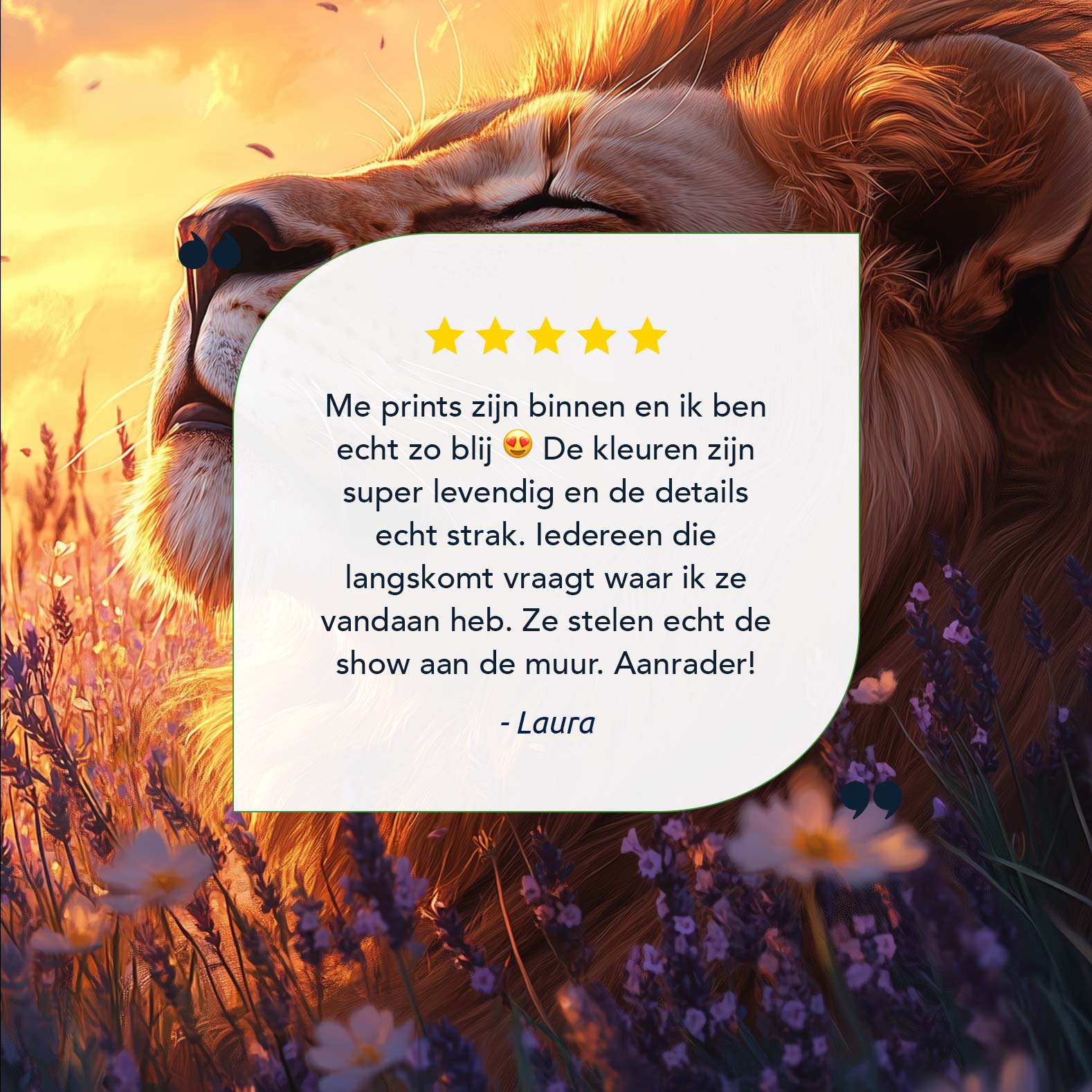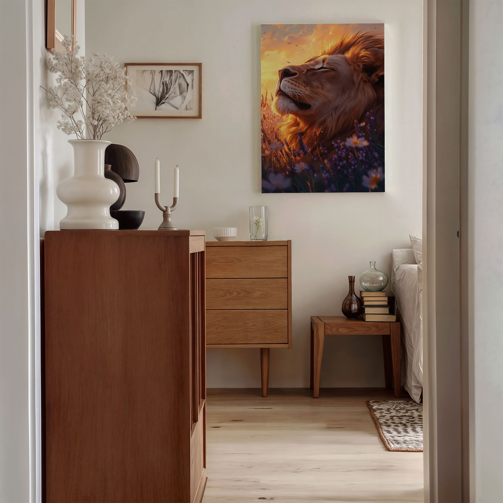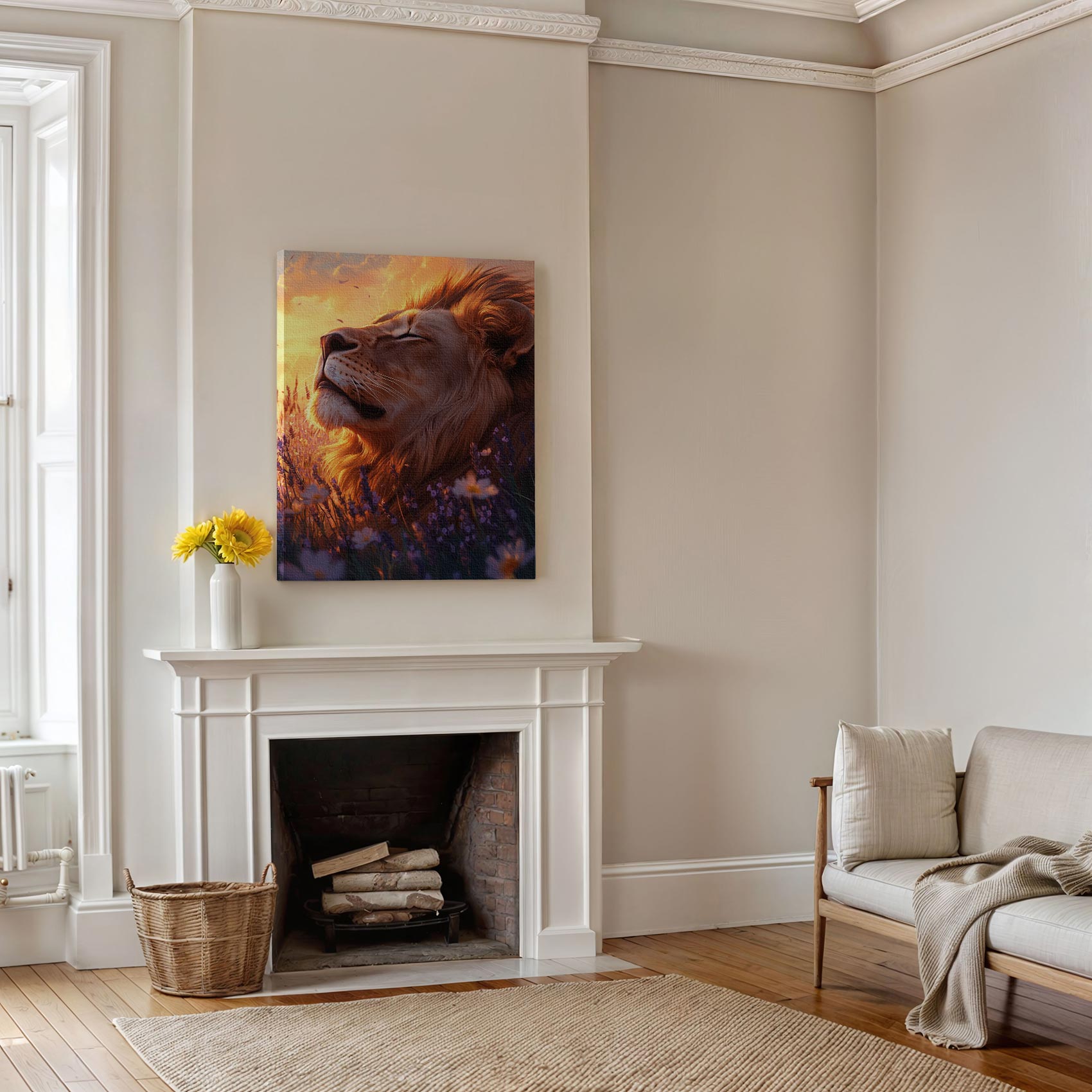 Terug naar collectie / Schilderijen / Bloemen Schilderij / Rustende leeuw in paarse bloemen