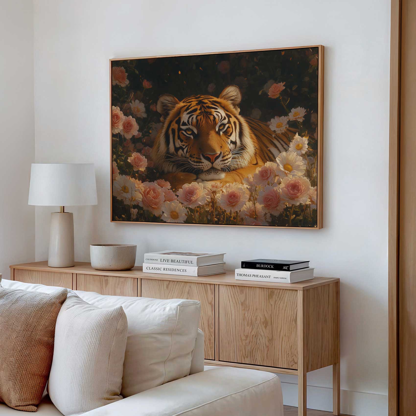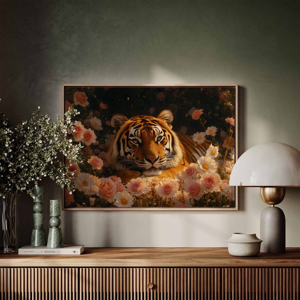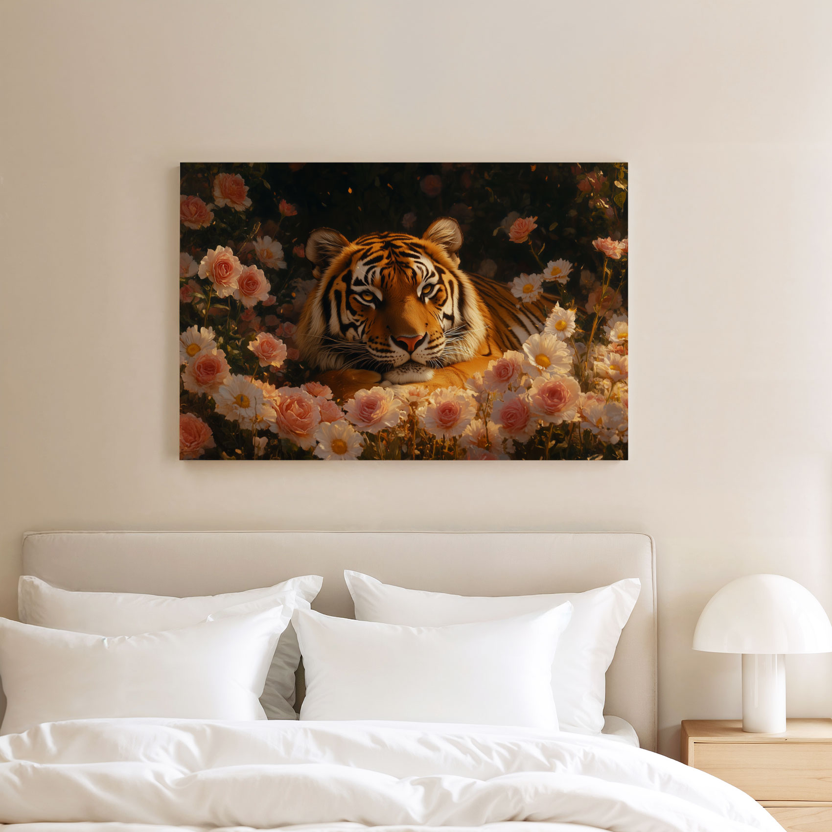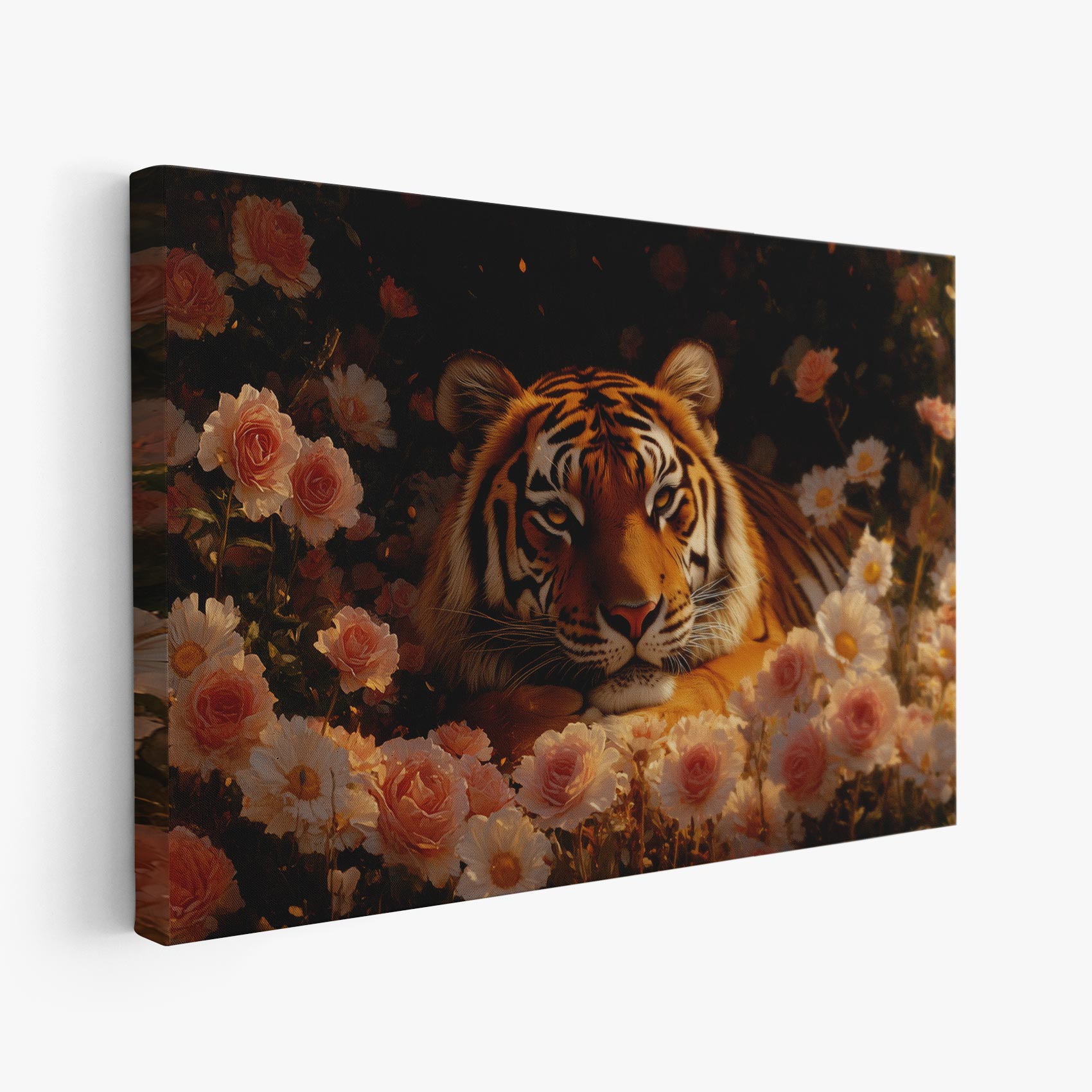 Terug naar collectie / Schilderijen / Bloemen Schilderij / Rustende tijger in bloemenveld