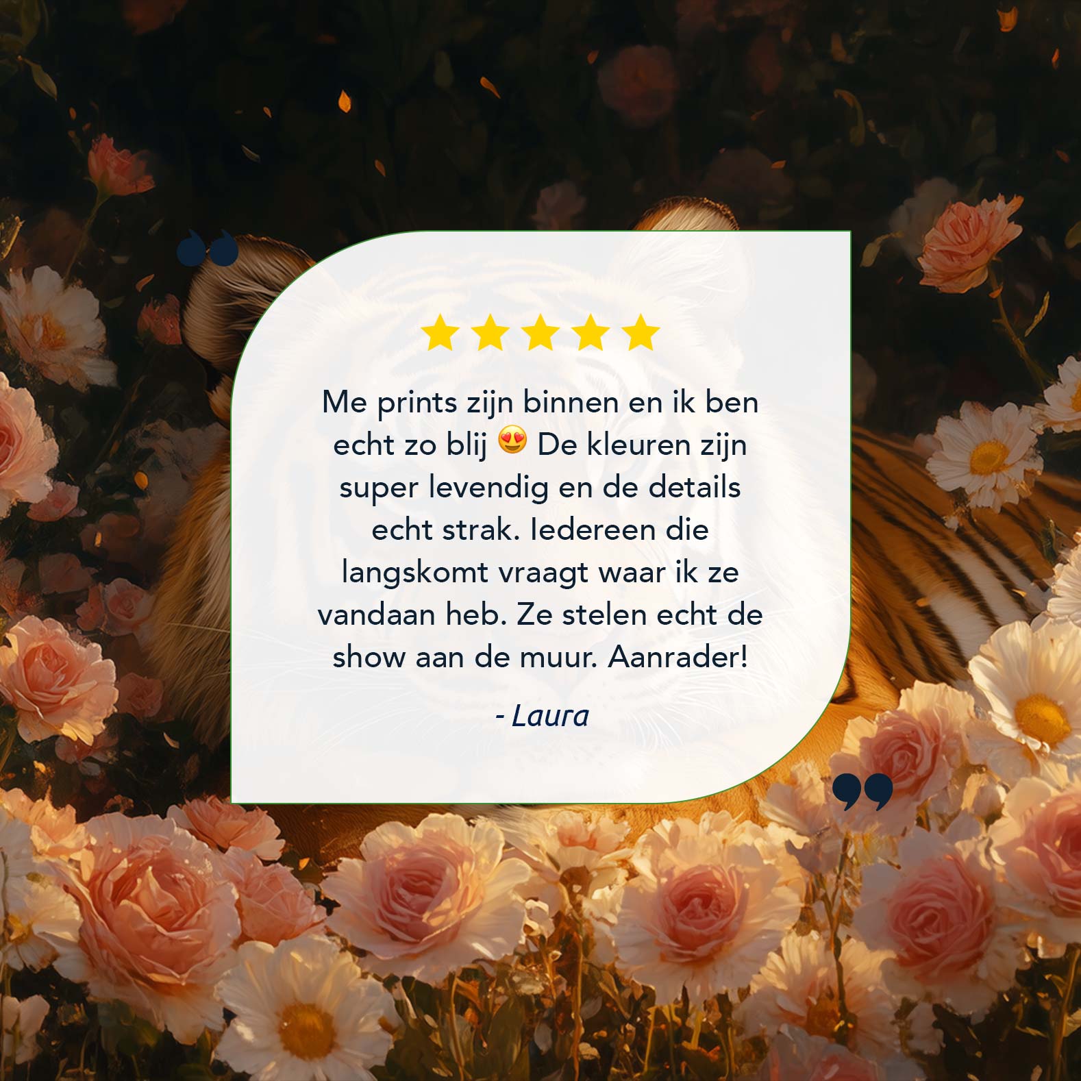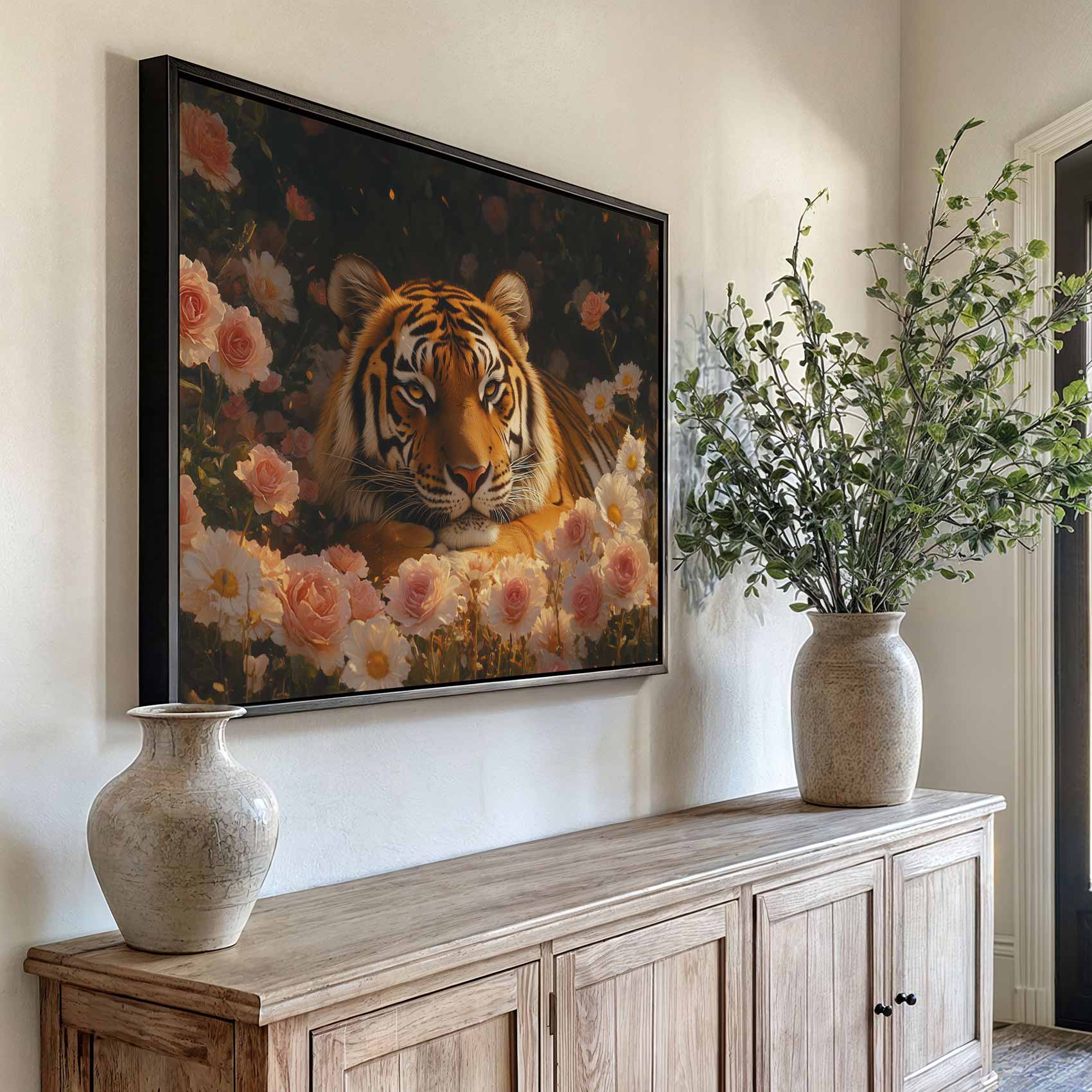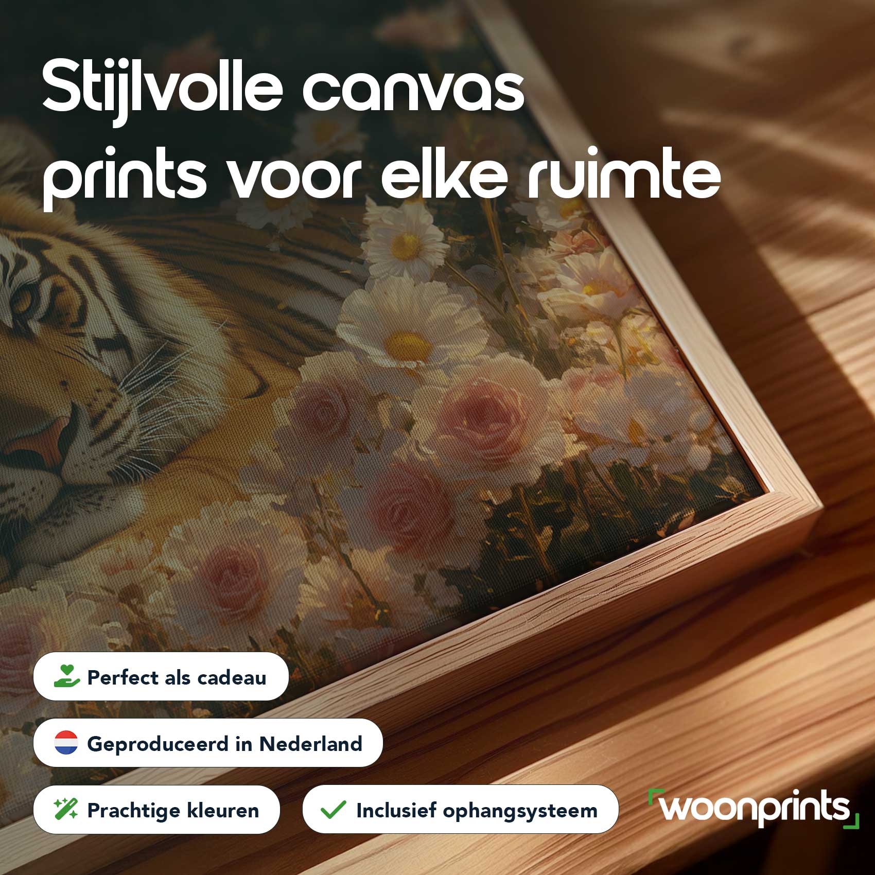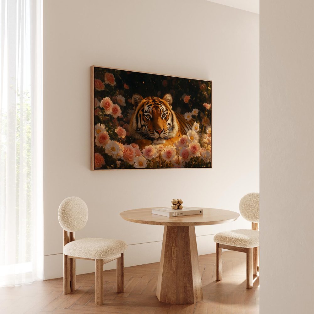 Terug naar collectie / Schilderijen / Bloemen Schilderij / Rustende tijger in bloemenveld