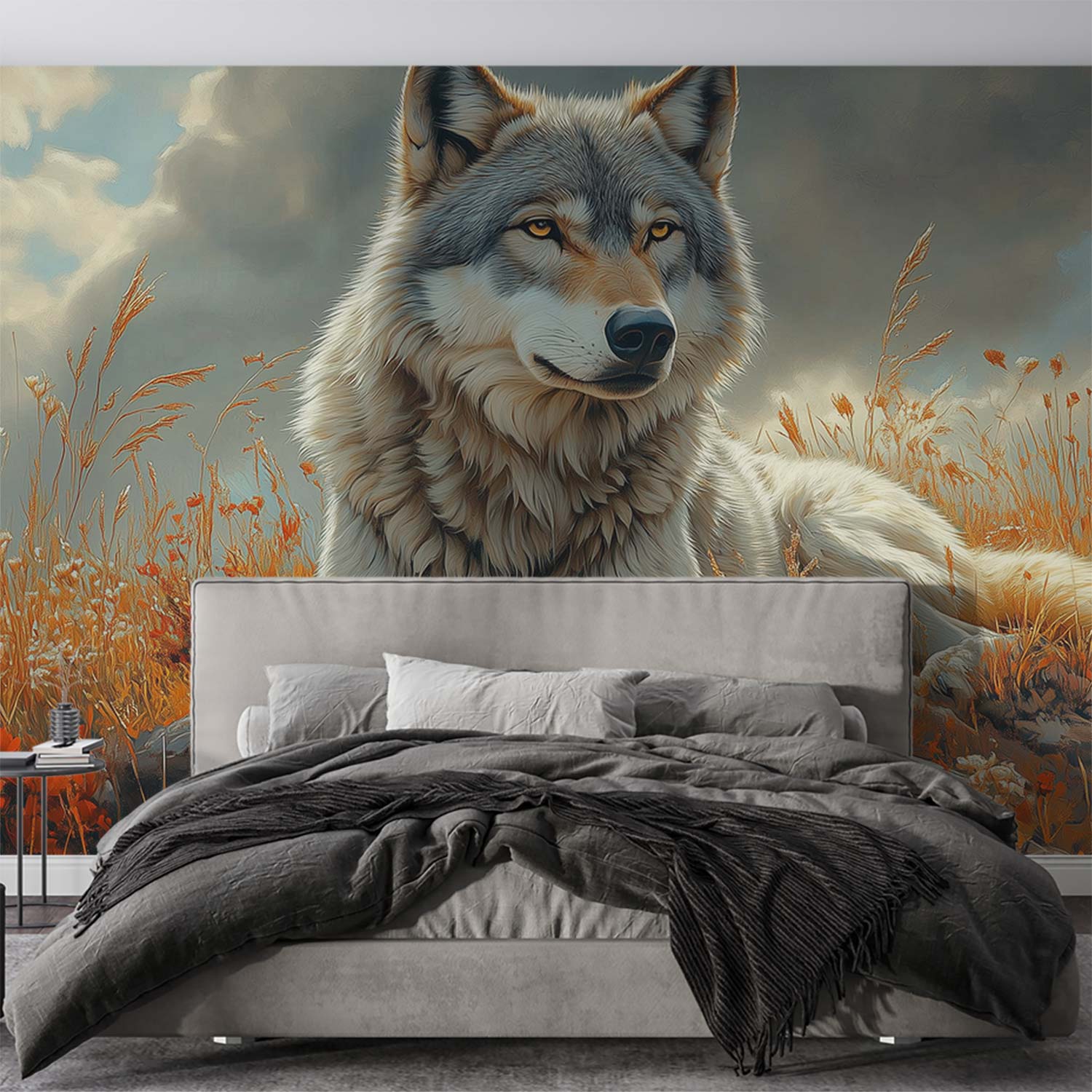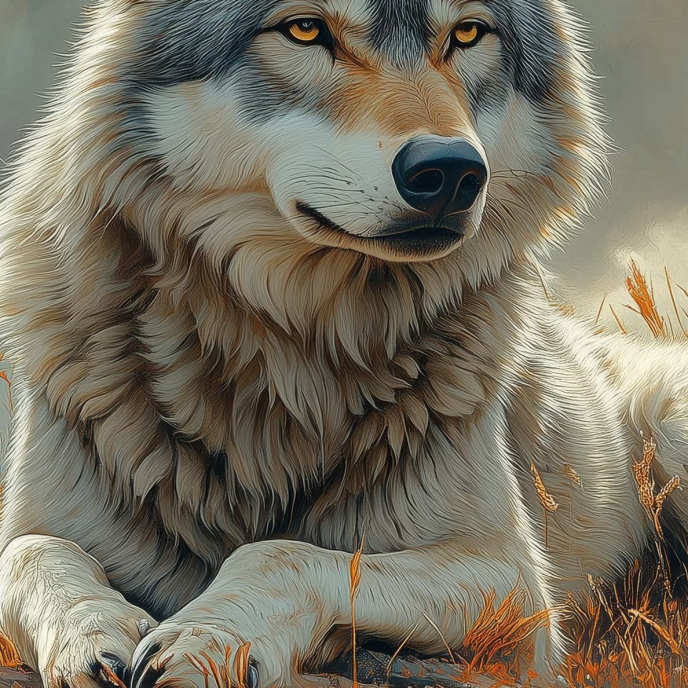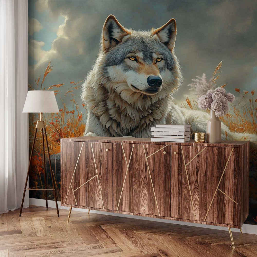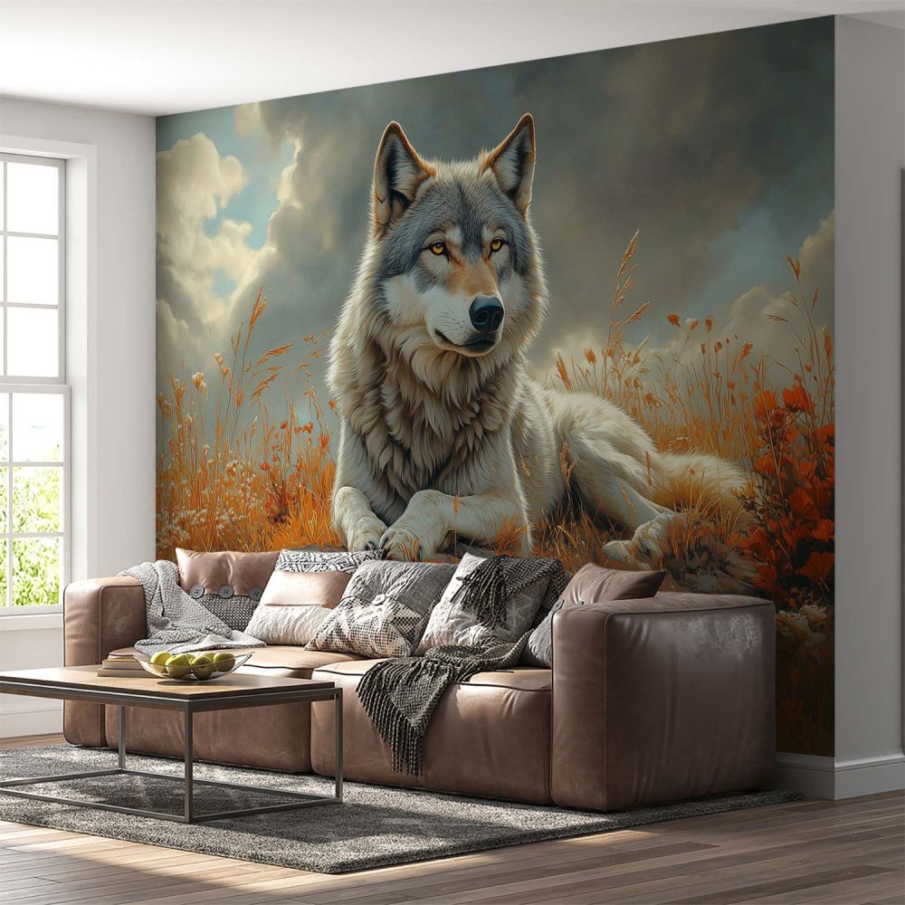 Terug naar collectie / Behang / Rustende wolf in bloemenveld behang