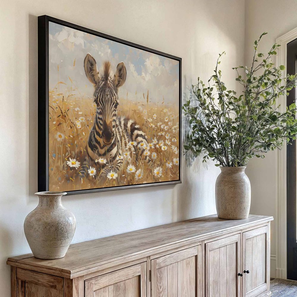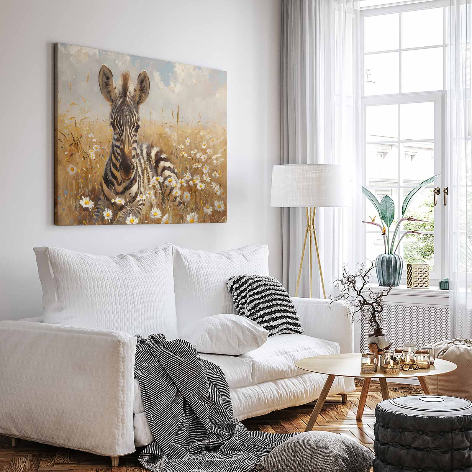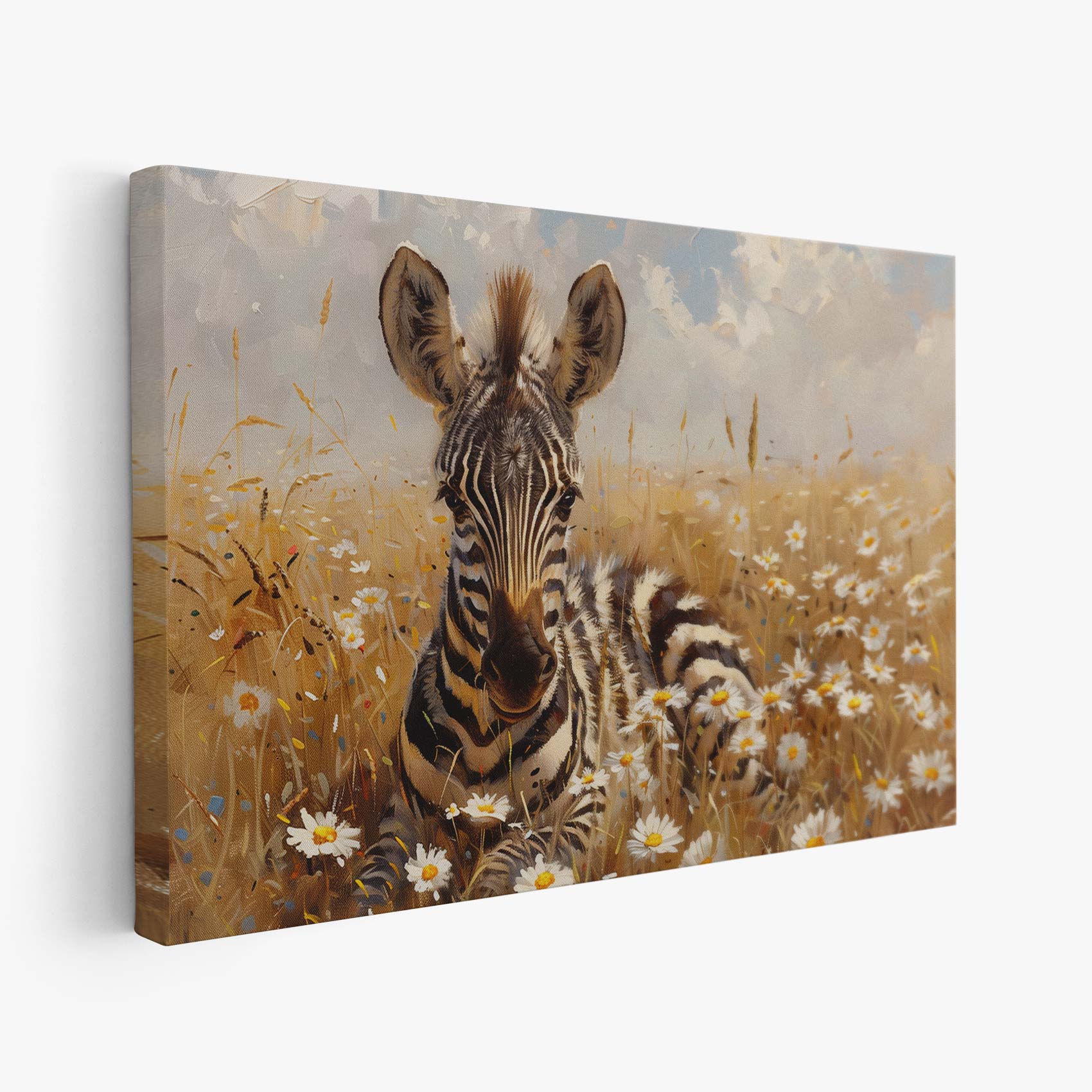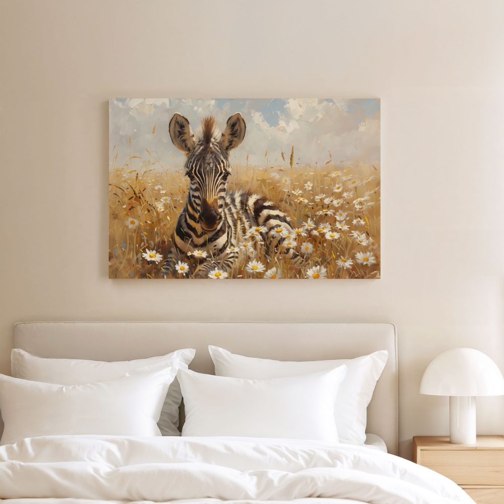 Terug naar collectie / Schilderijen / Bloemen Schilderij / Rustende zebra in bloemenveld