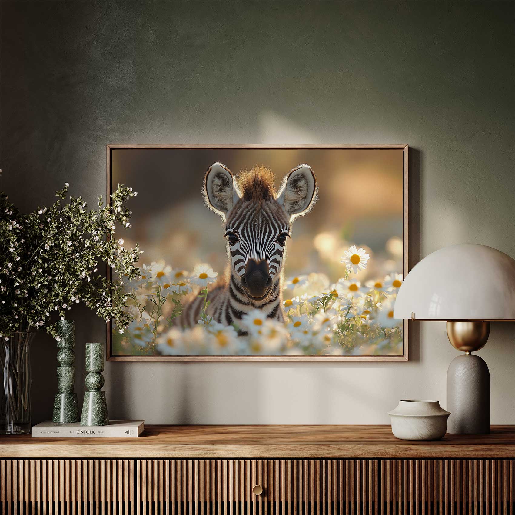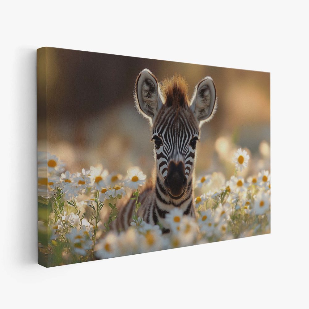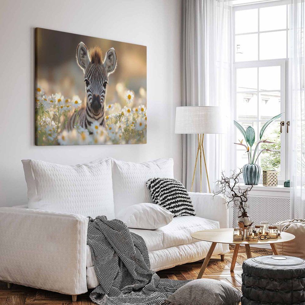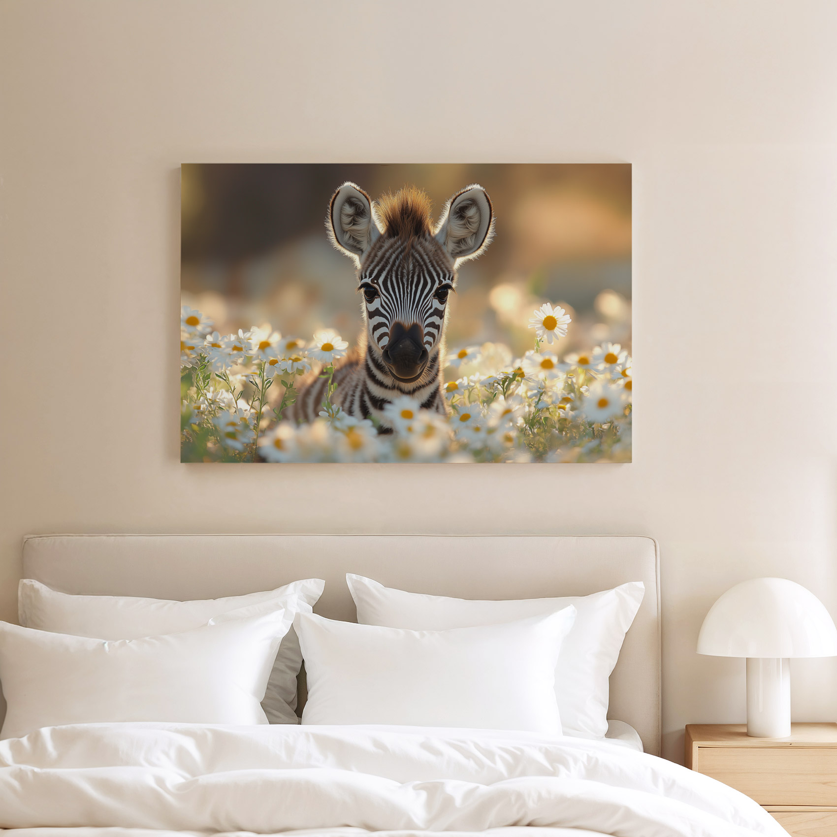 Terug naar collectie / Schilderijen / Bloemen Schilderij / Rustende zebra tussen madeliefjes