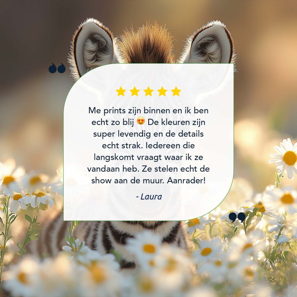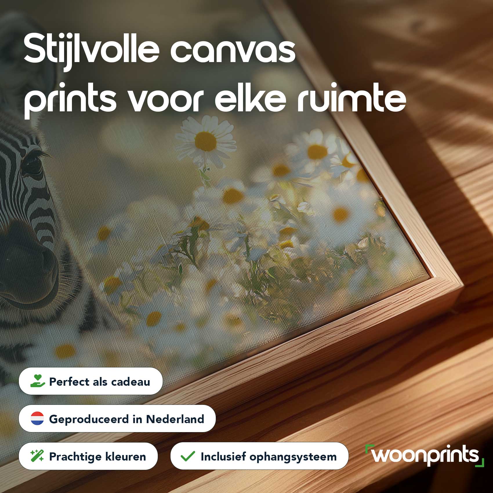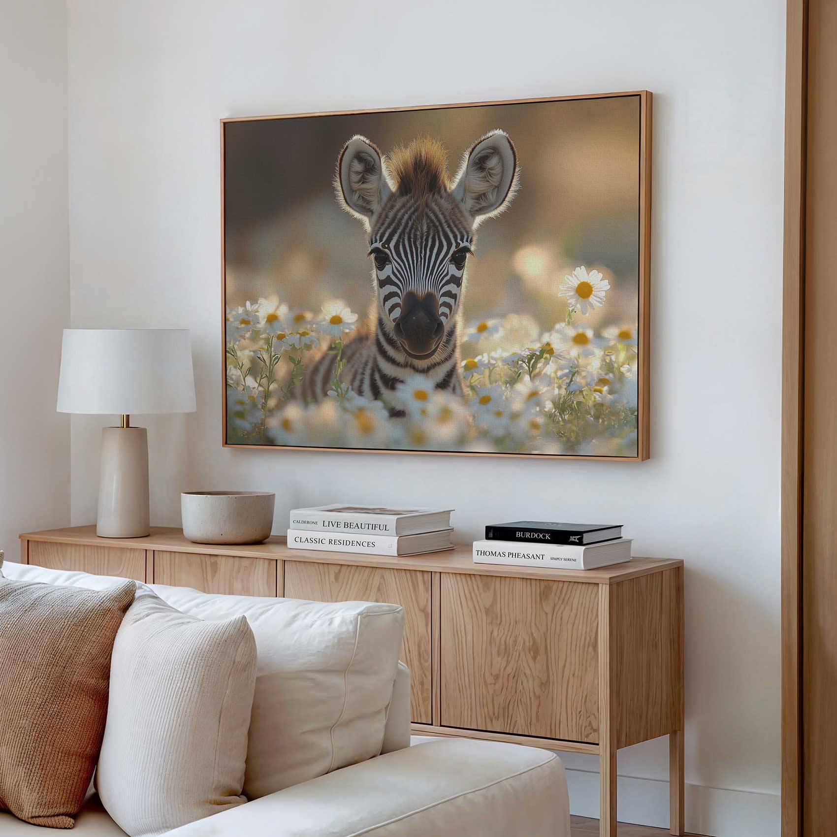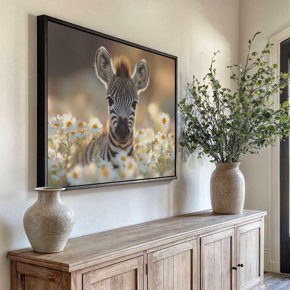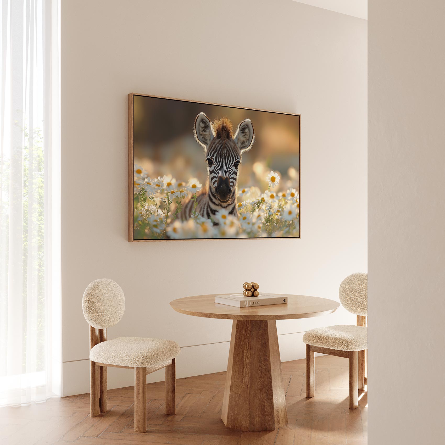 Terug naar collectie / Schilderijen / Bloemen Schilderij / Rustende zebra tussen madeliefjes