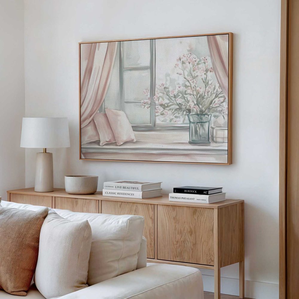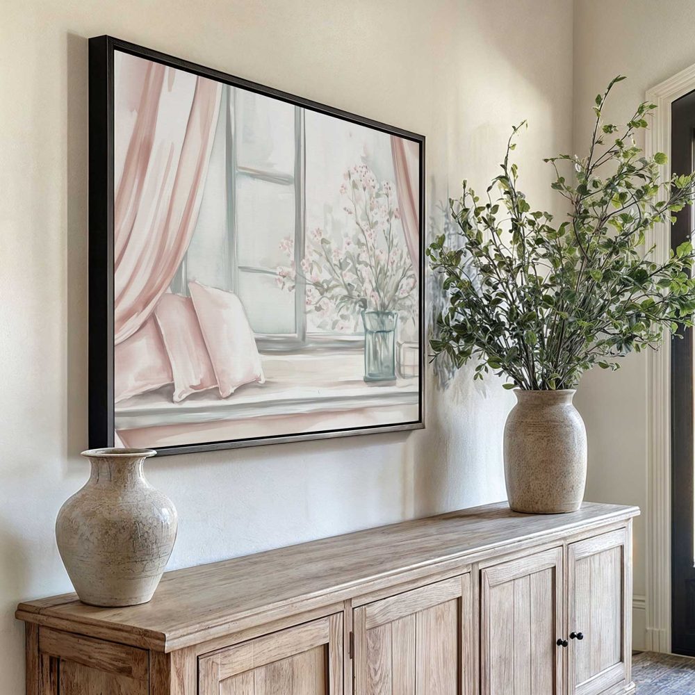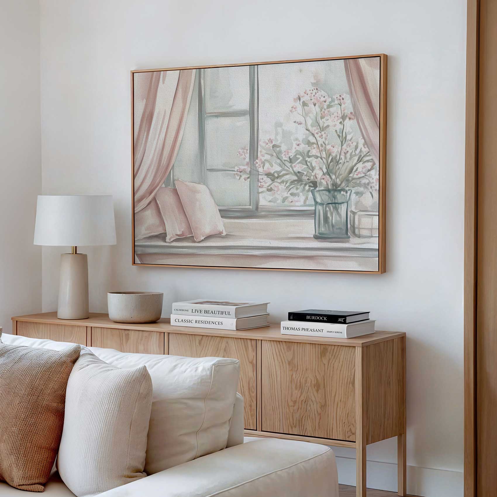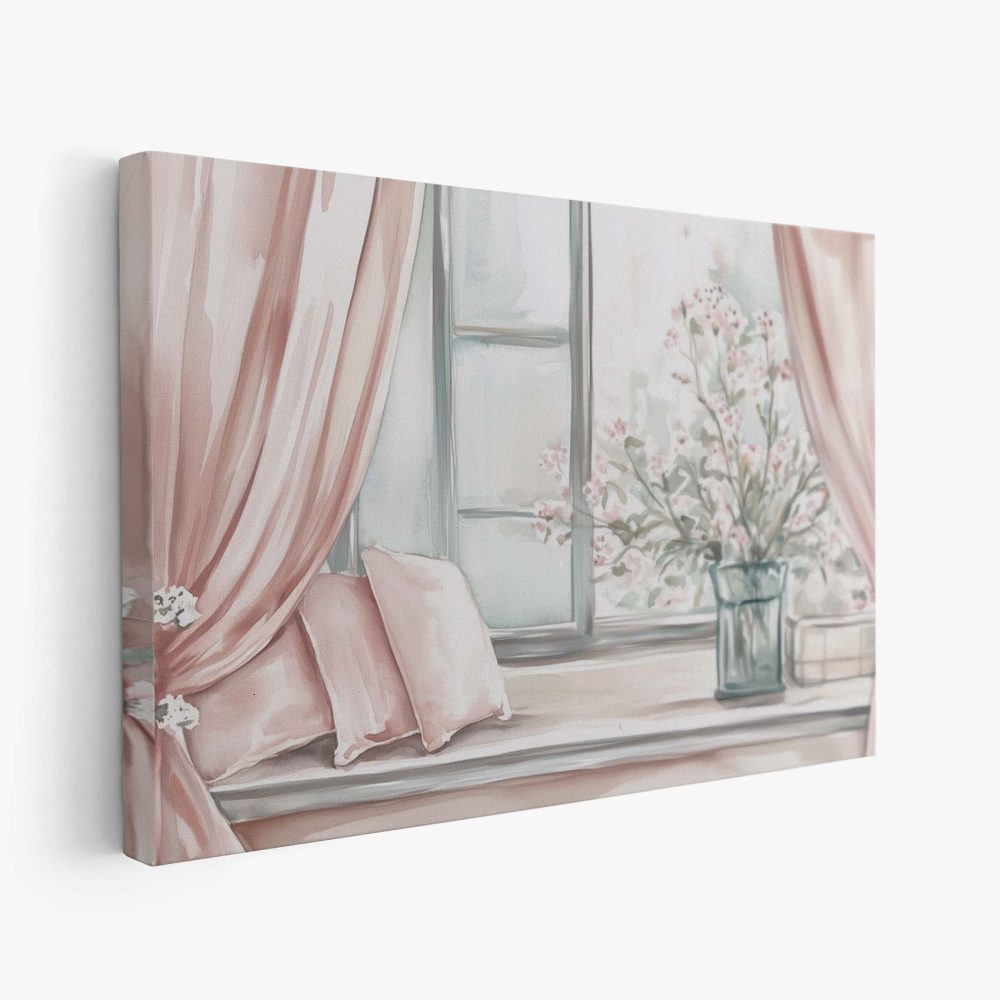Terug naar collectie / Schilderijen / Bloemen Schilderij / Rustig raam met roze bloemen
