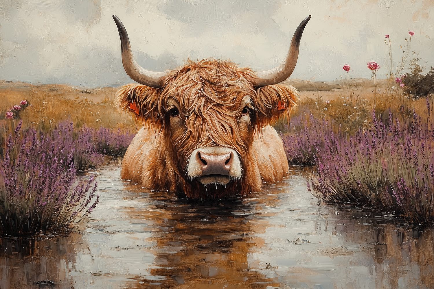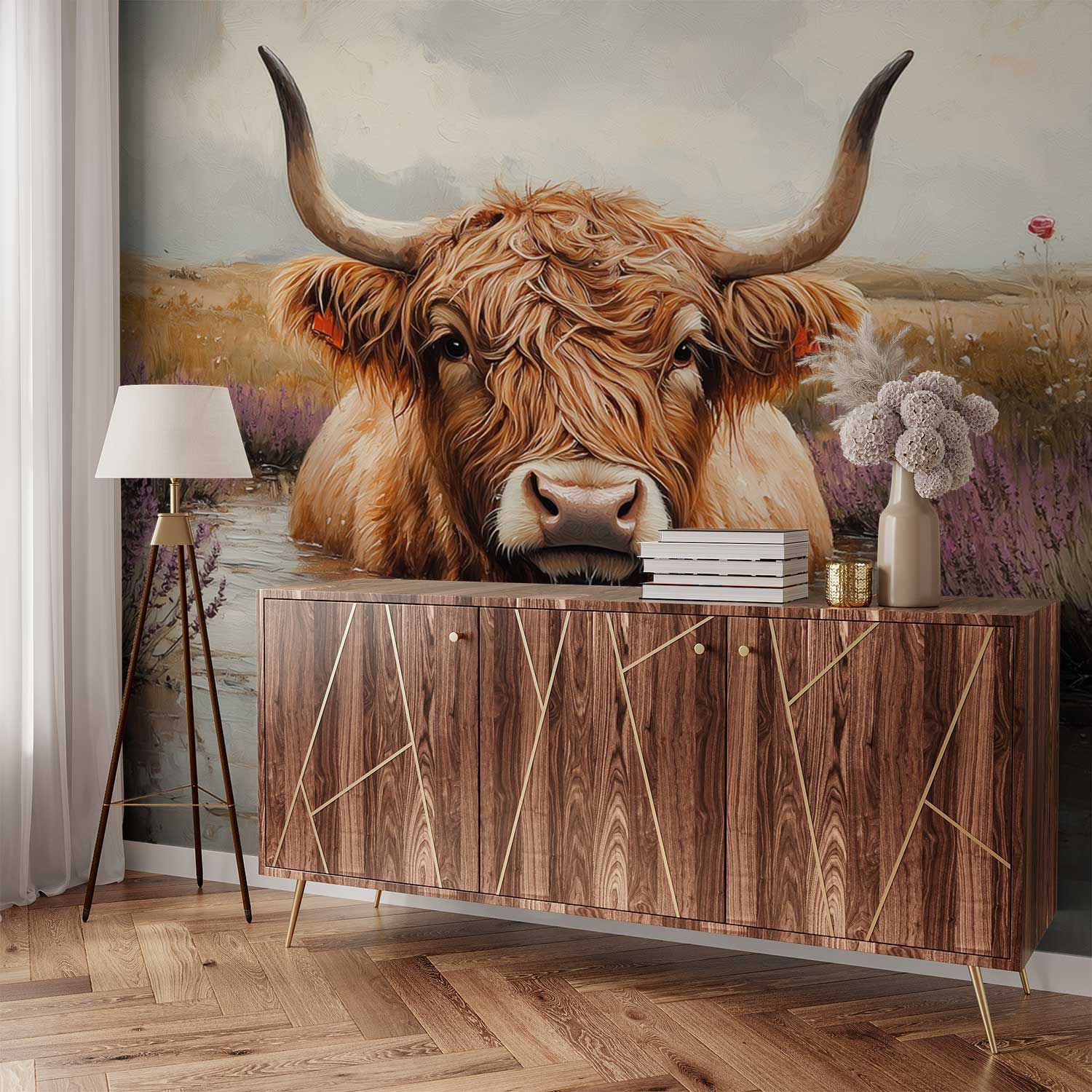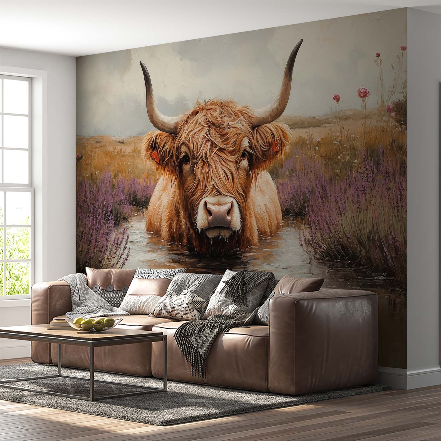 Terug naar collectie / Behang / Rustige koe in bloemenwater behang
