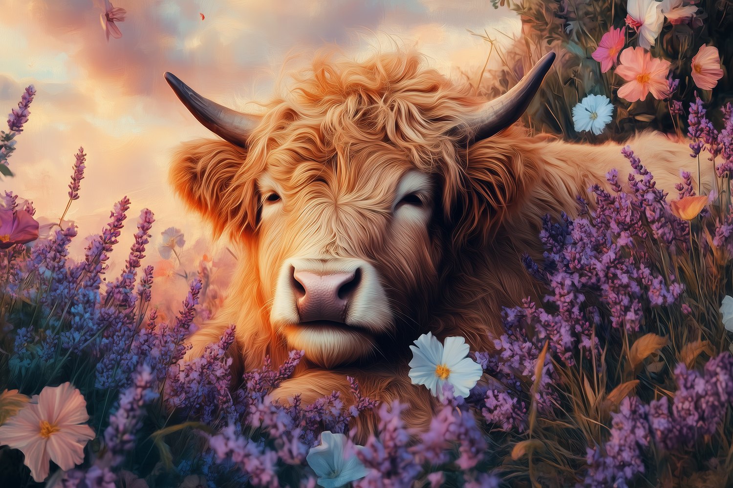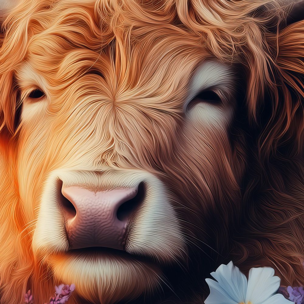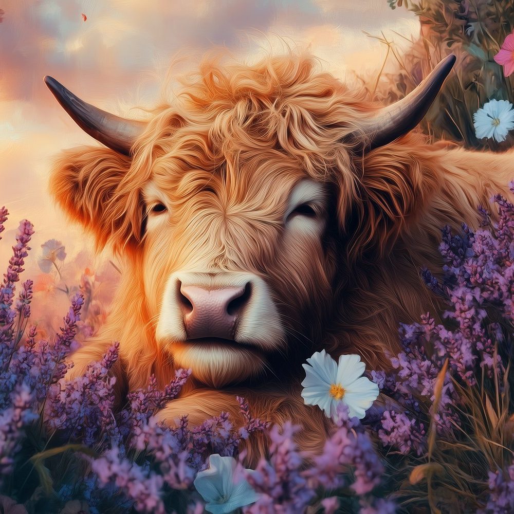 Terug naar collectie / Behang / Rustige koe in paarse bloemen behang