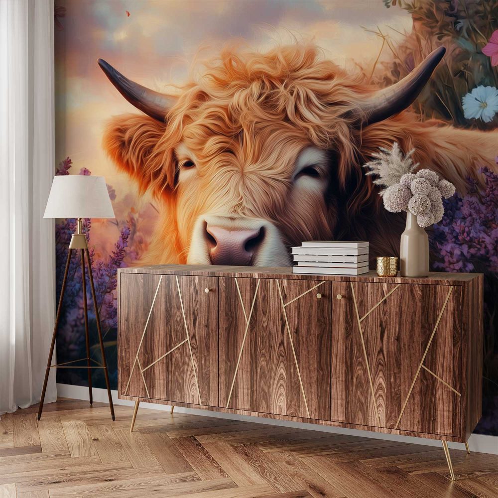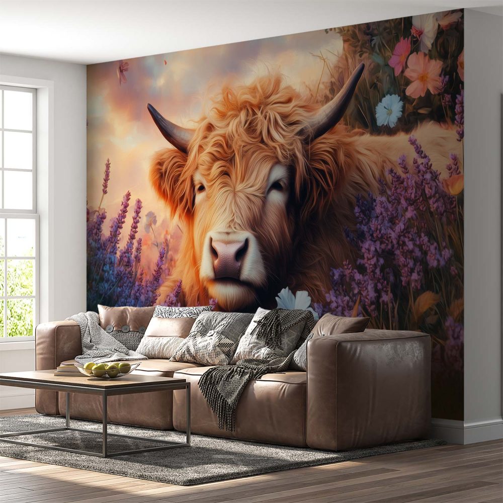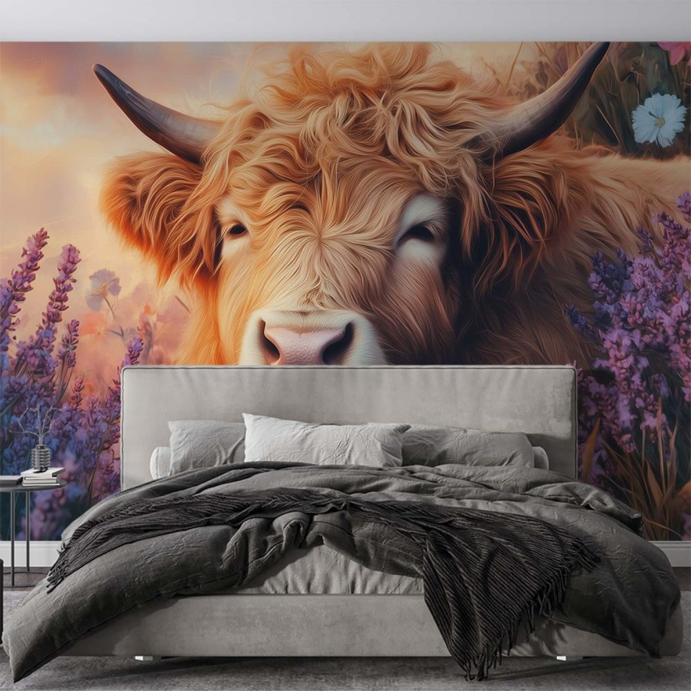 Rustige koe in paarse bloemen behang