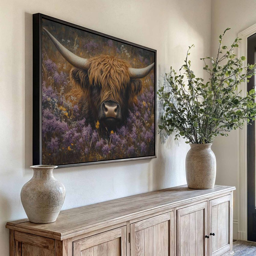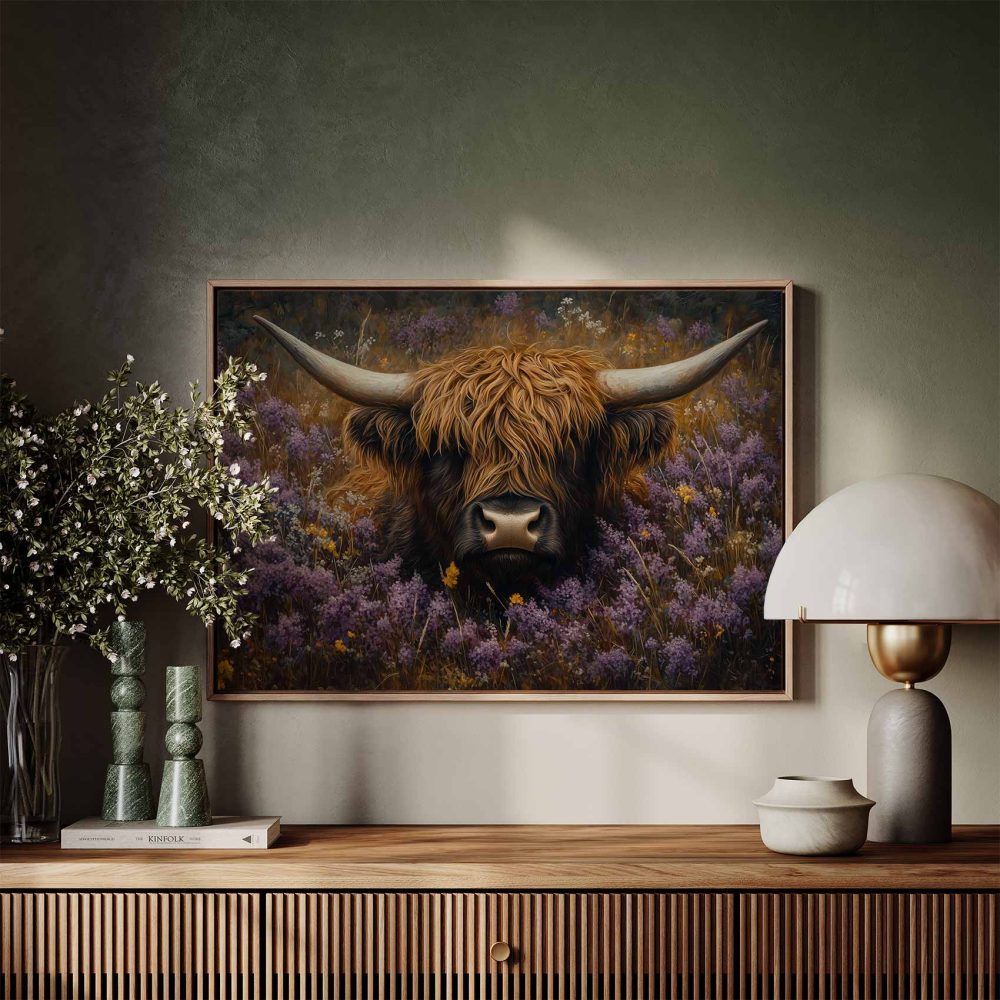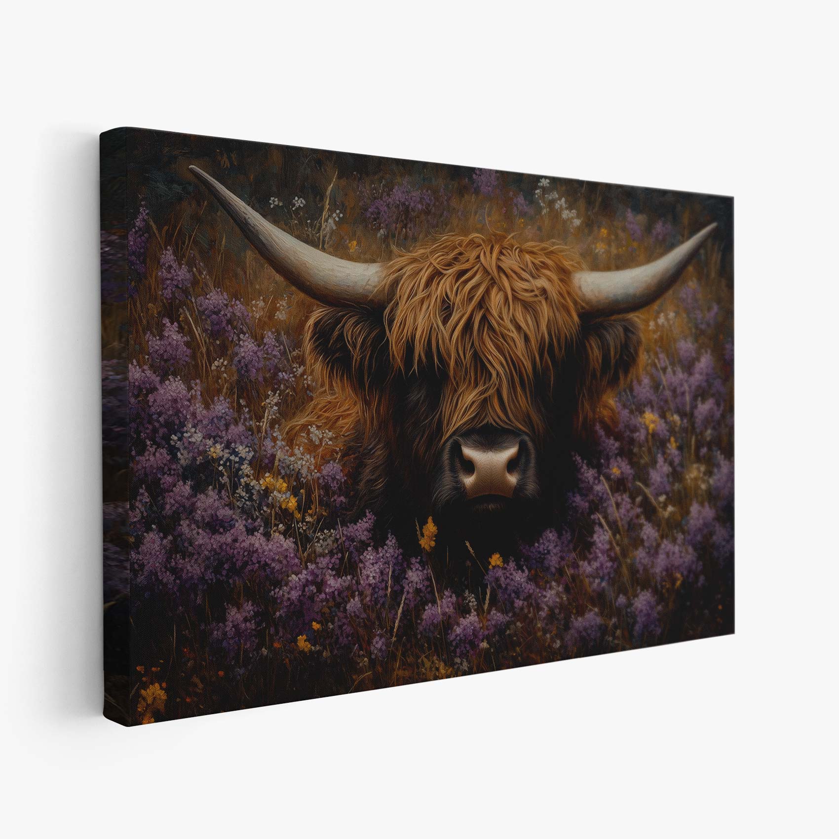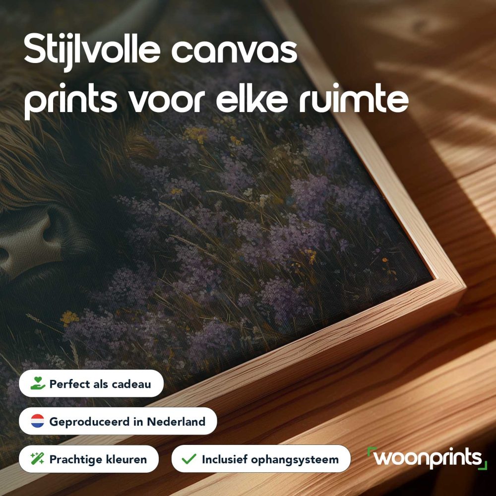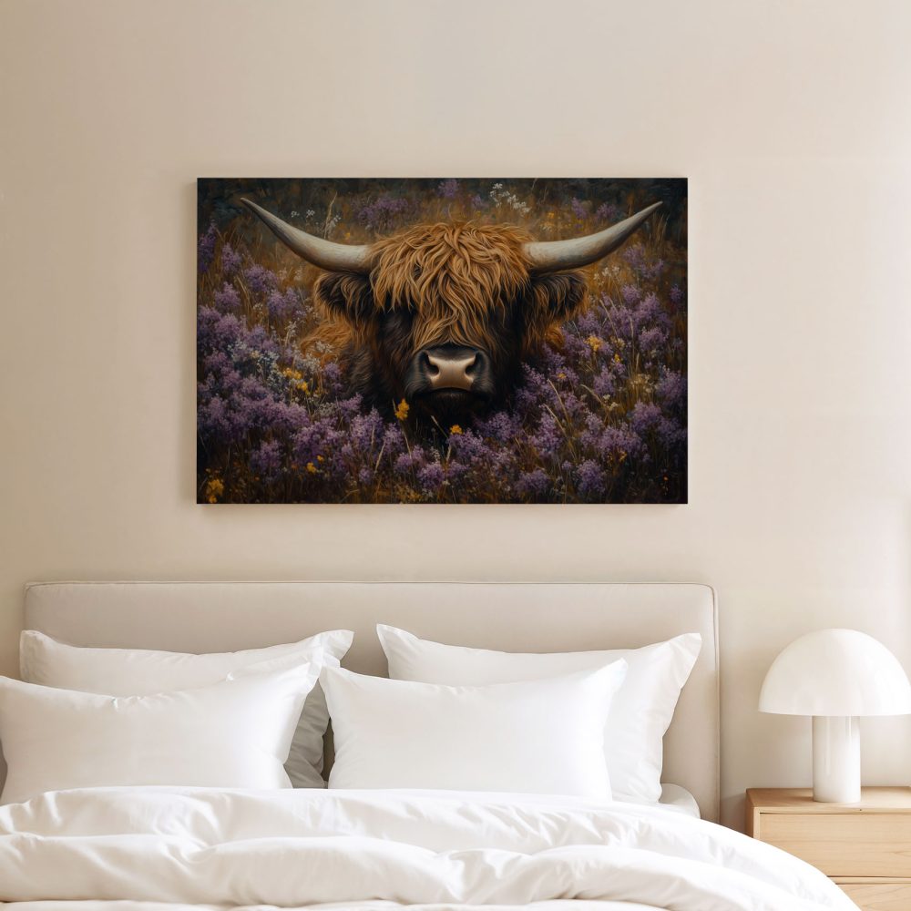 Terug naar collectie / Schilderijen / Bloemen Schilderij / Rustige koe in paarse bloemen