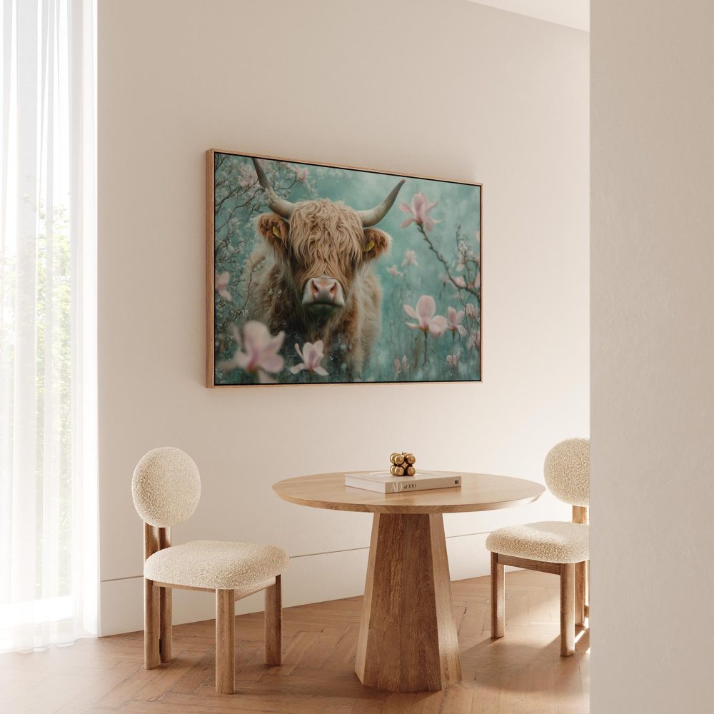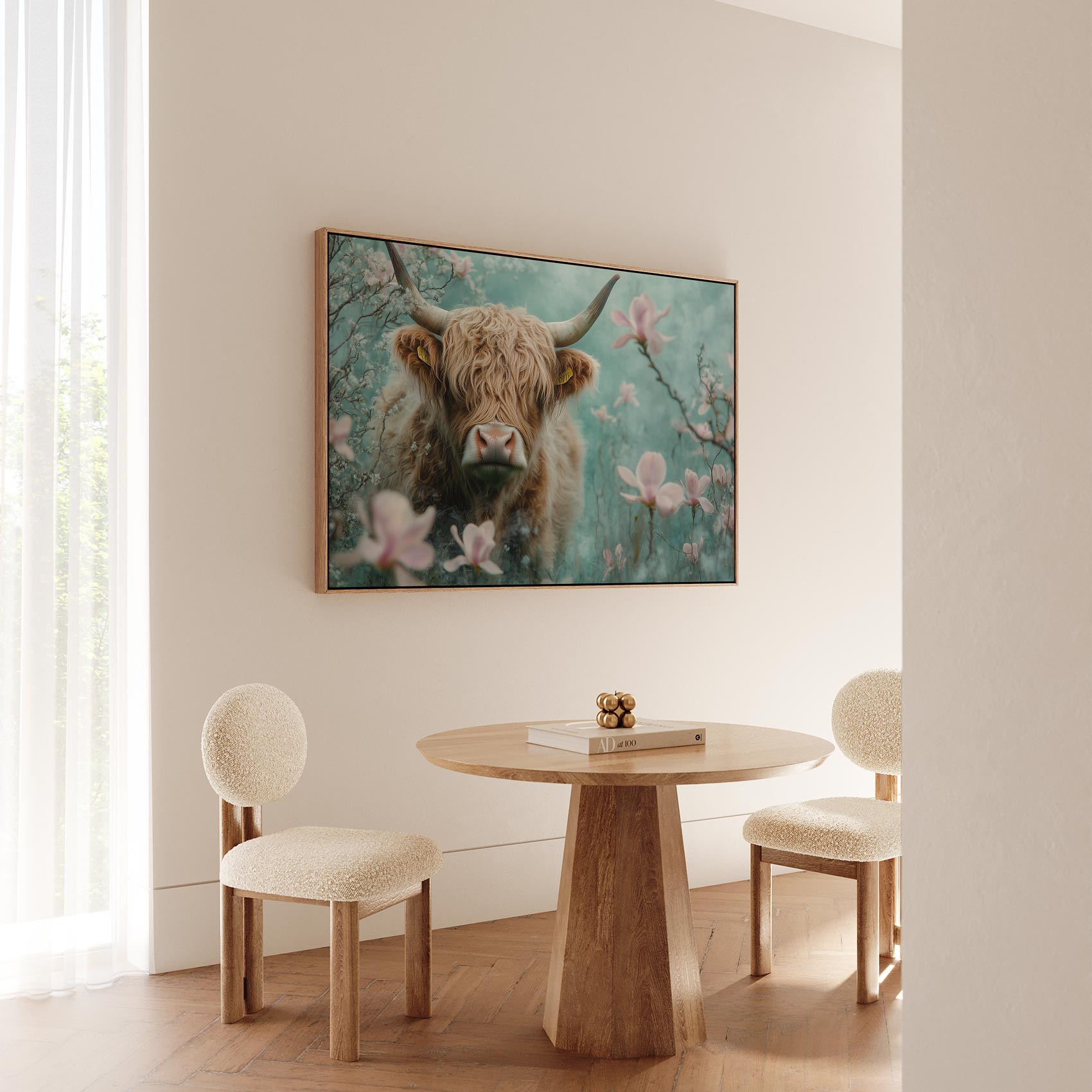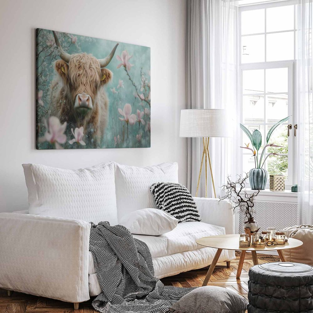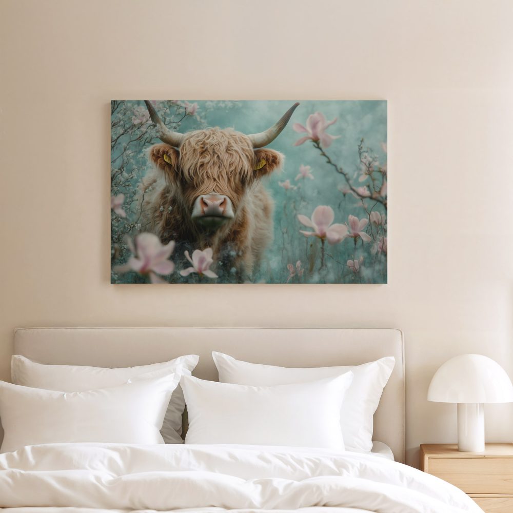 Terug naar collectie / Schilderijen / Bloemen Schilderij / Rustige koe in roze bloemenveld