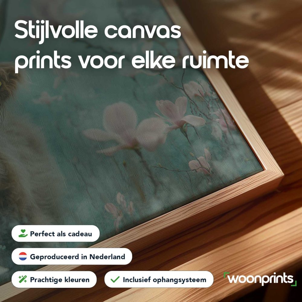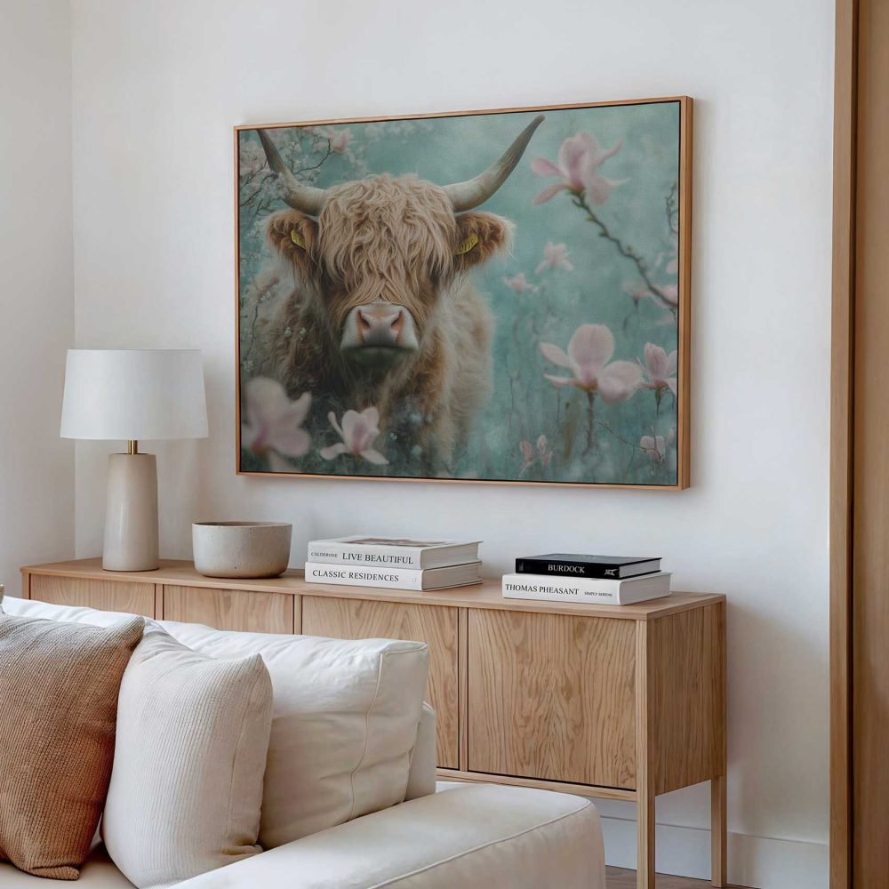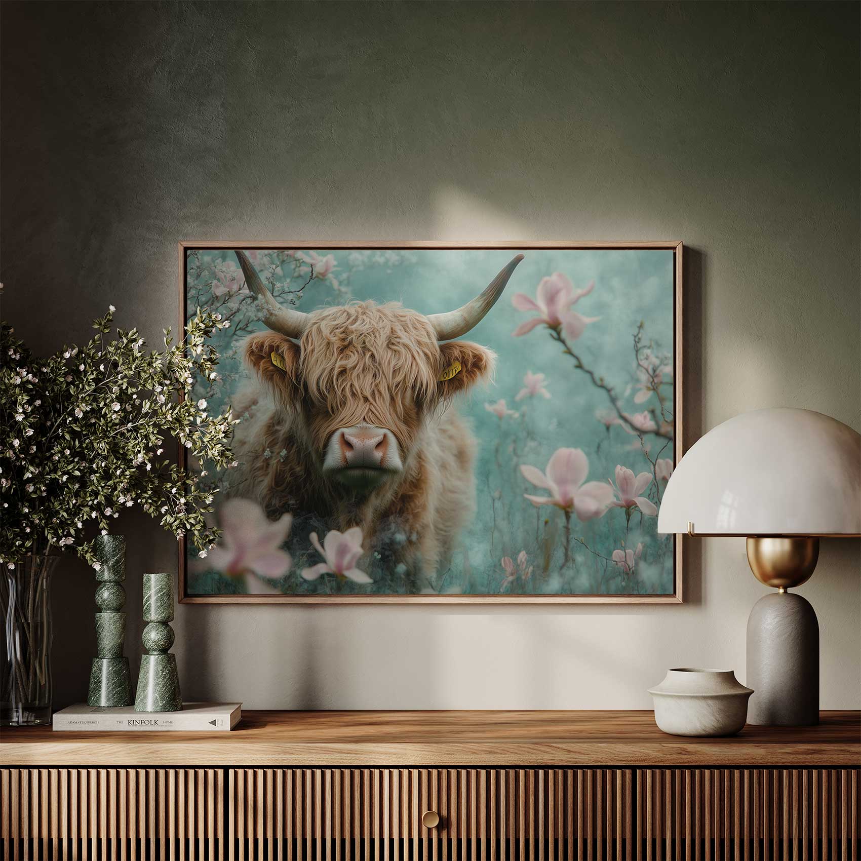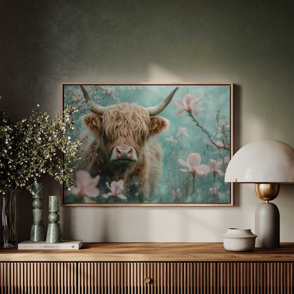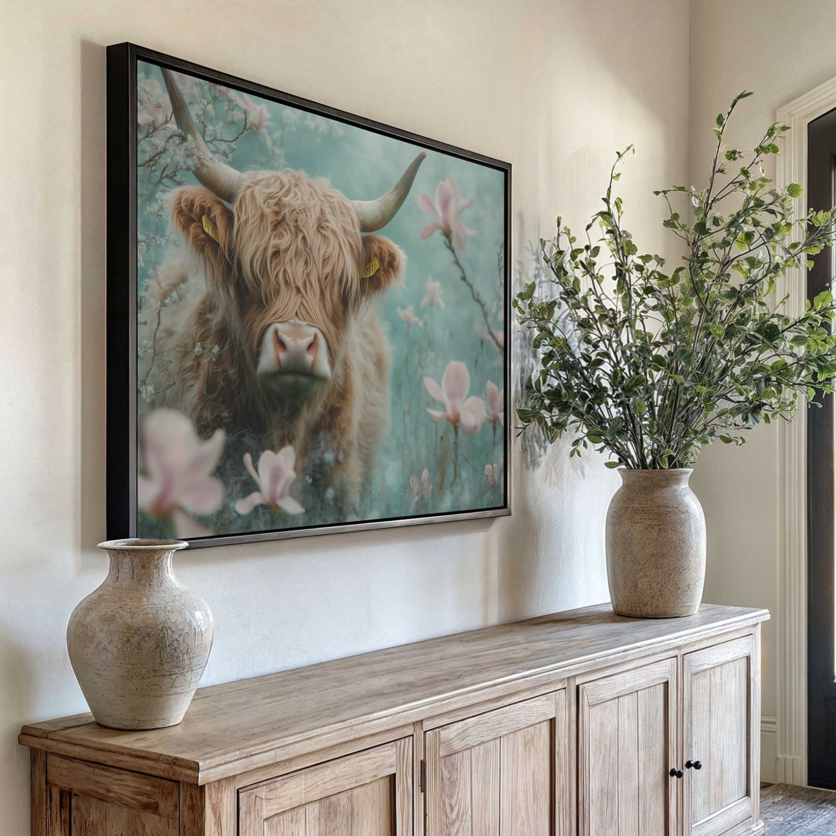 Terug naar collectie / Schilderijen / Bloemen Schilderij / Rustige koe in roze bloemenveld