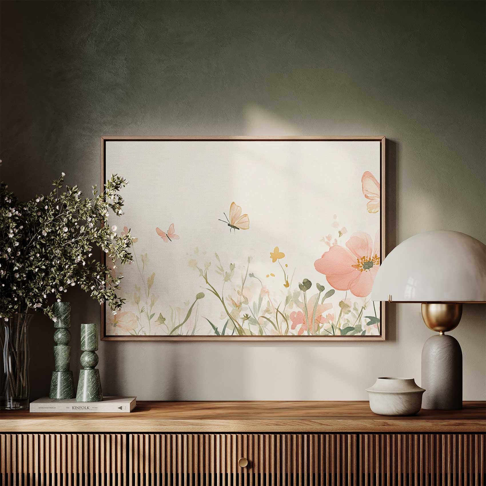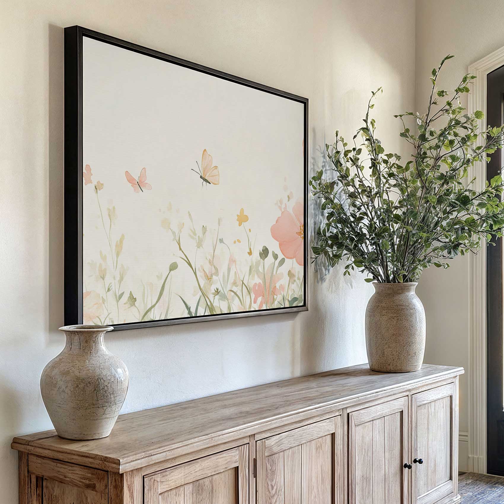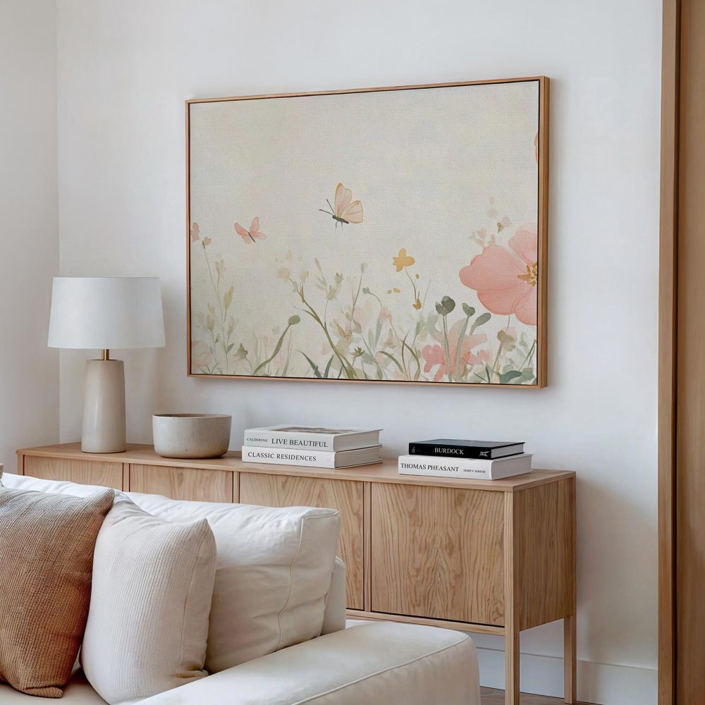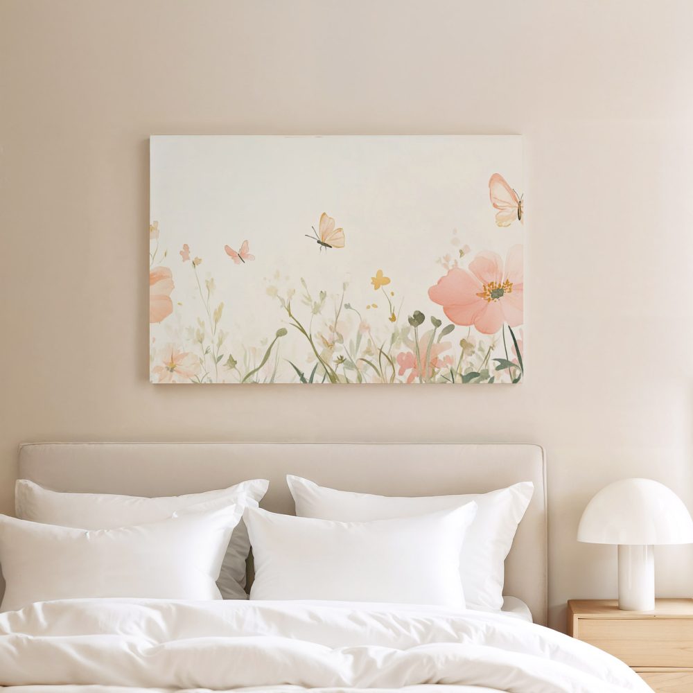 Terug naar collectie / Schilderijen / Bloemen Schilderij / Rustige roze bloemenvlinderweide
