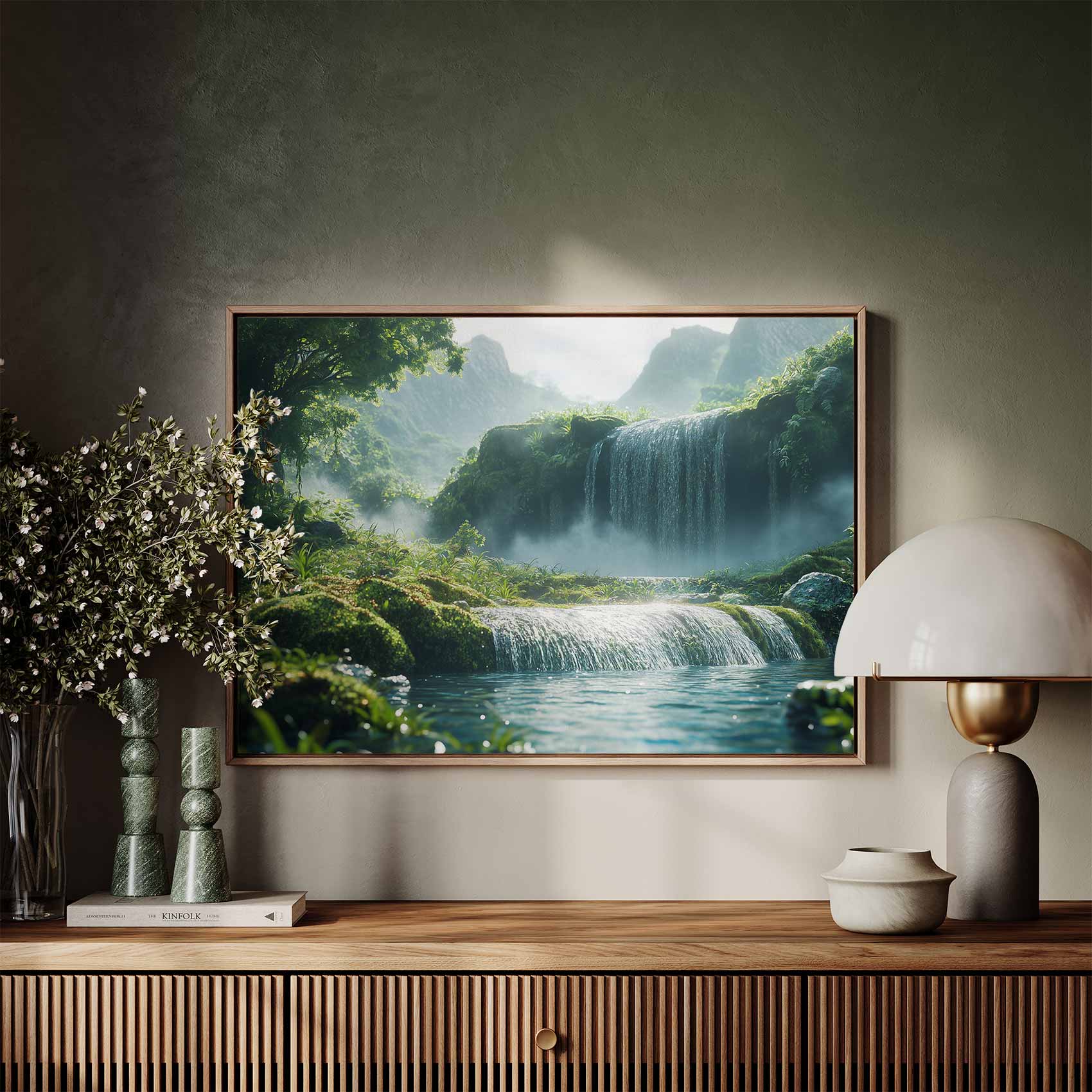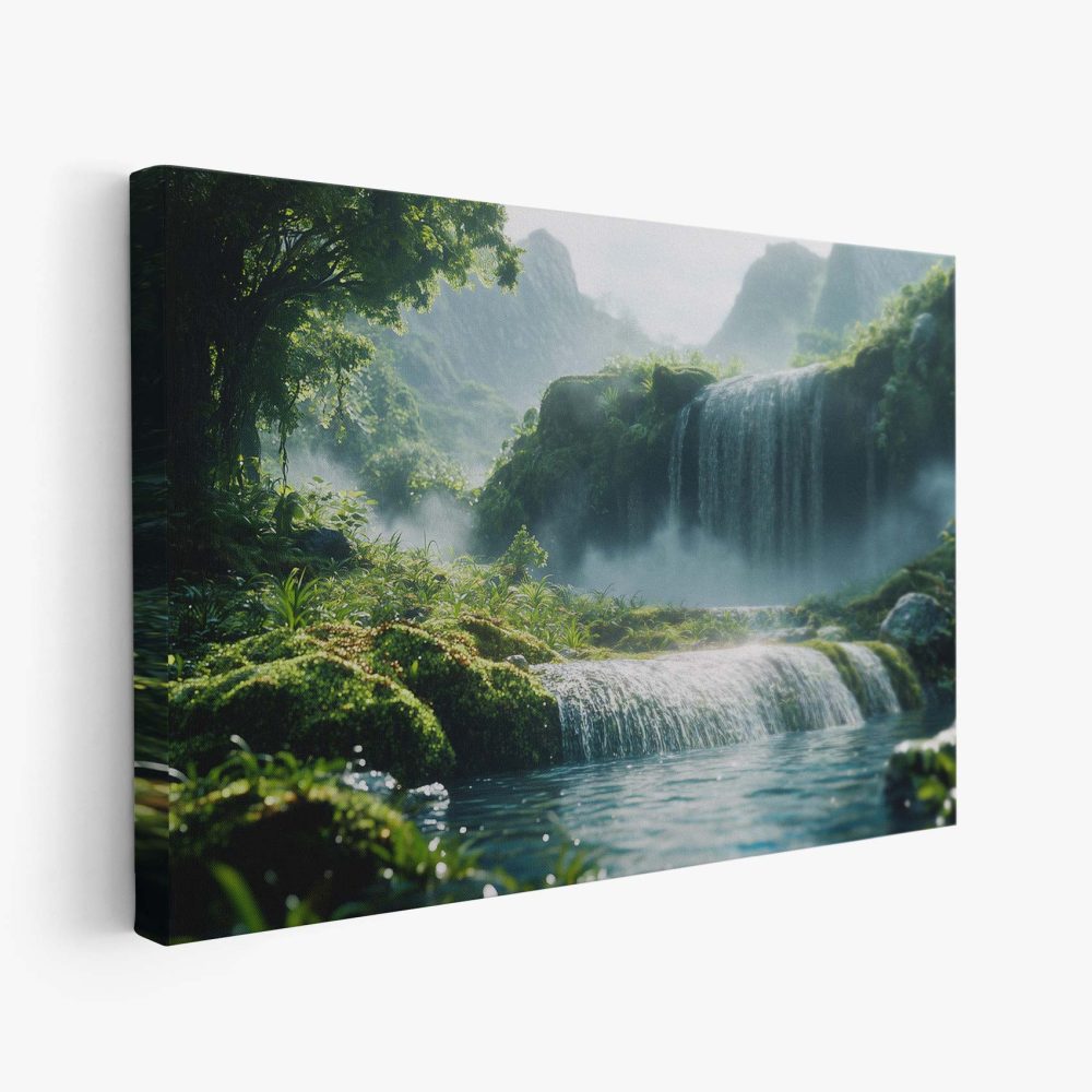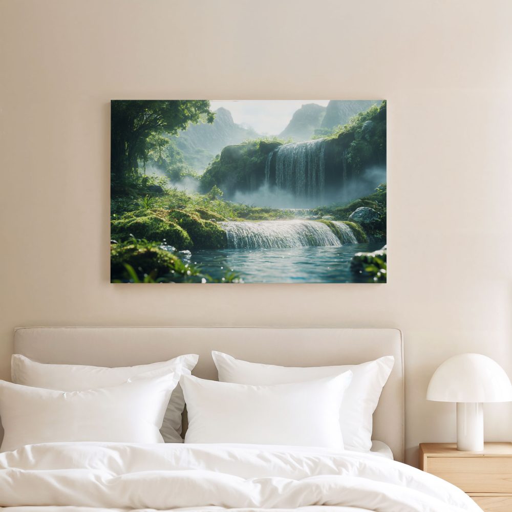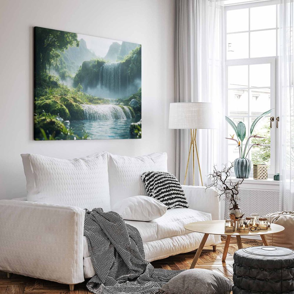 Terug naar collectie / Schilderijen / Bergen Schilderij / Rustige waterval in groen landschap