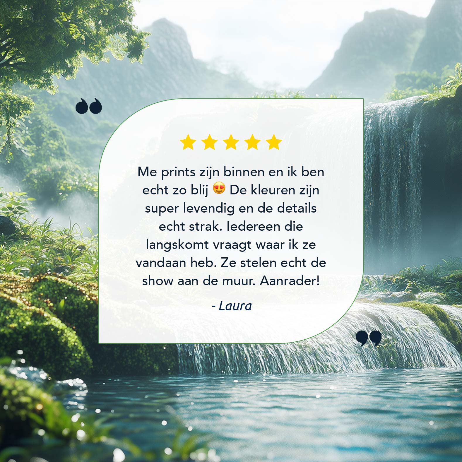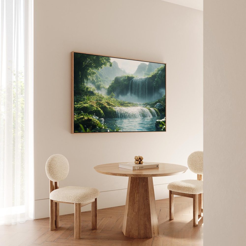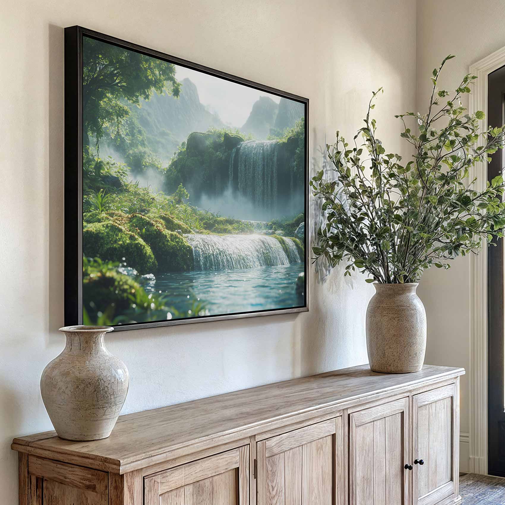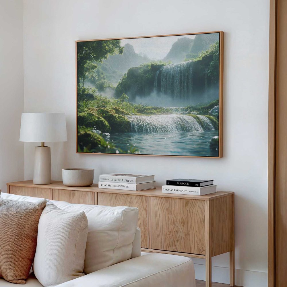 Terug naar collectie / Schilderijen / Bergen Schilderij / Rustige waterval in groen landschap