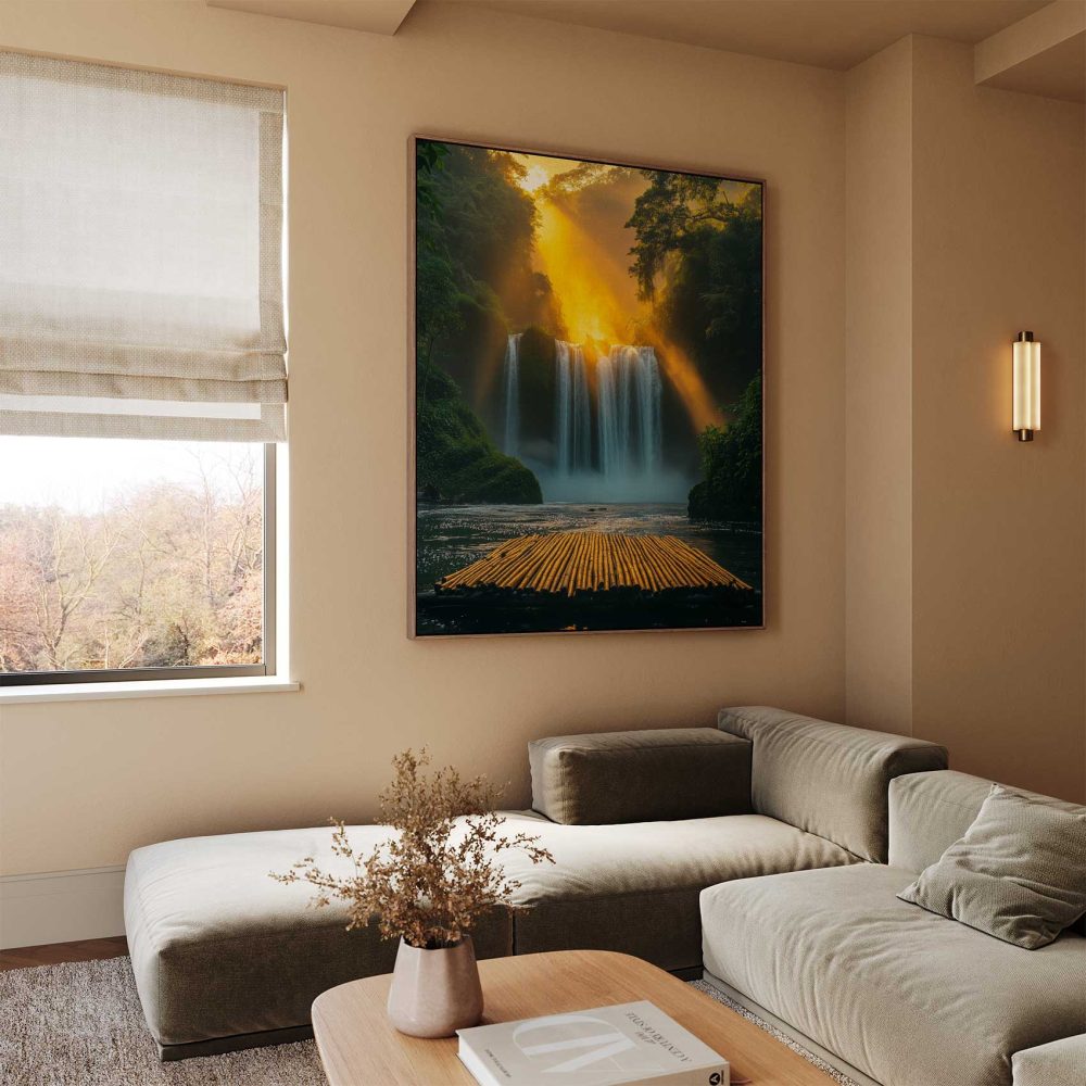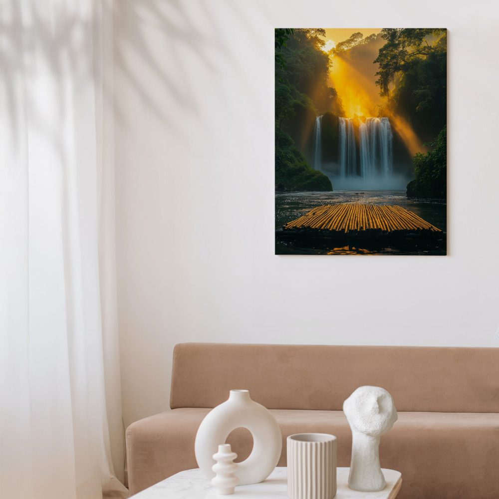 Terug naar collectie / Schilderijen / Bergen Schilderij / Rustige waterval met bootje
