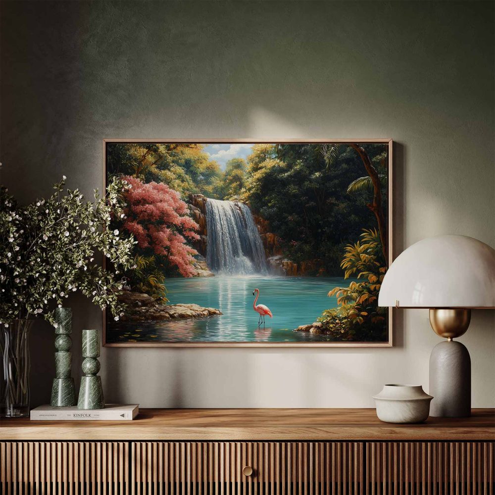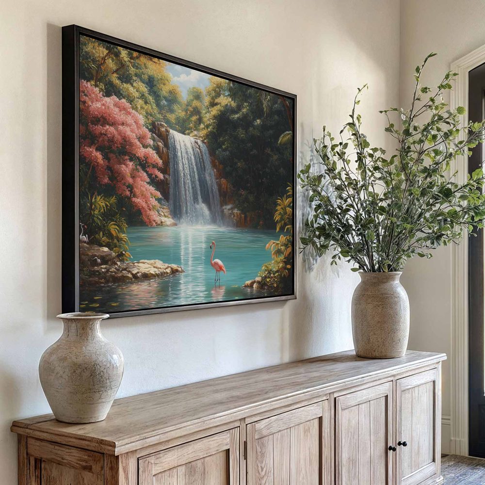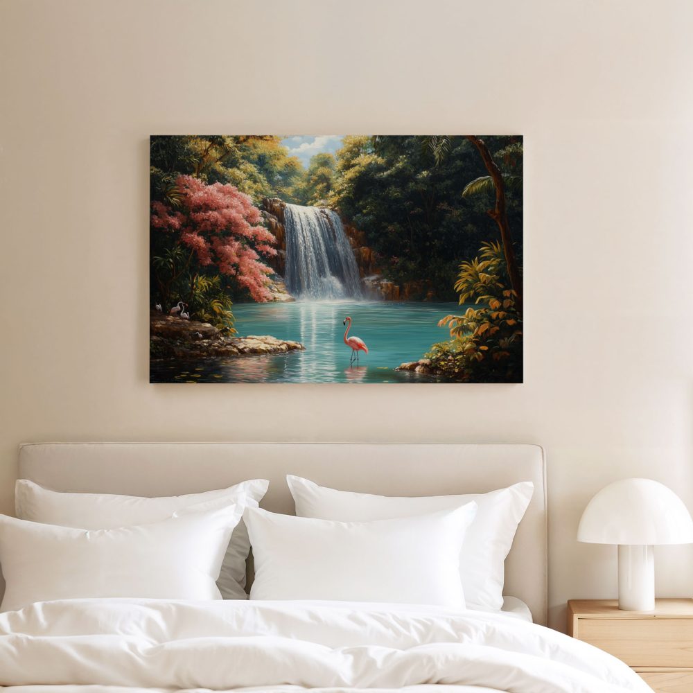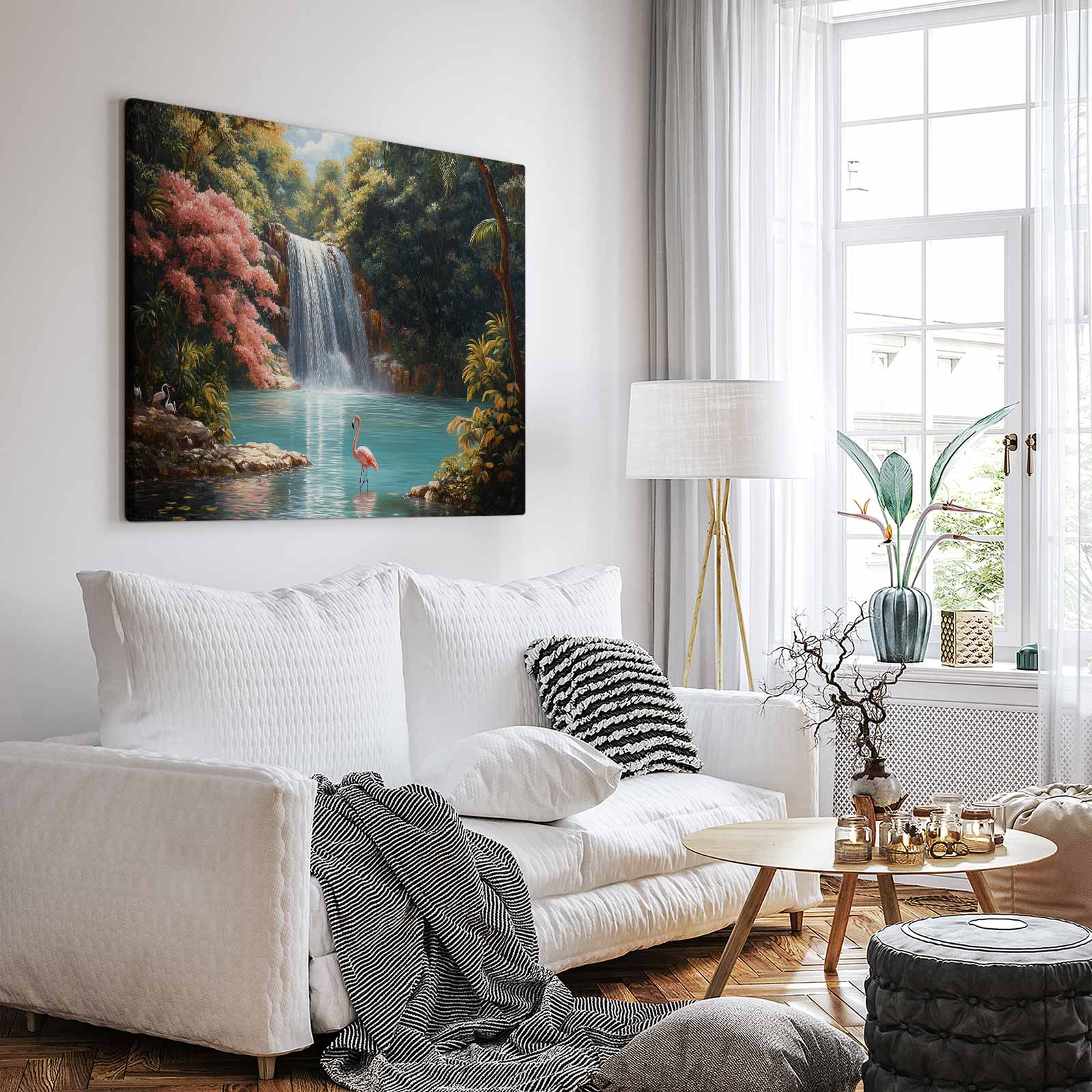 Terug naar collectie / Schilderijen / Bloemen Schilderij / Rustige waterval met flamingo