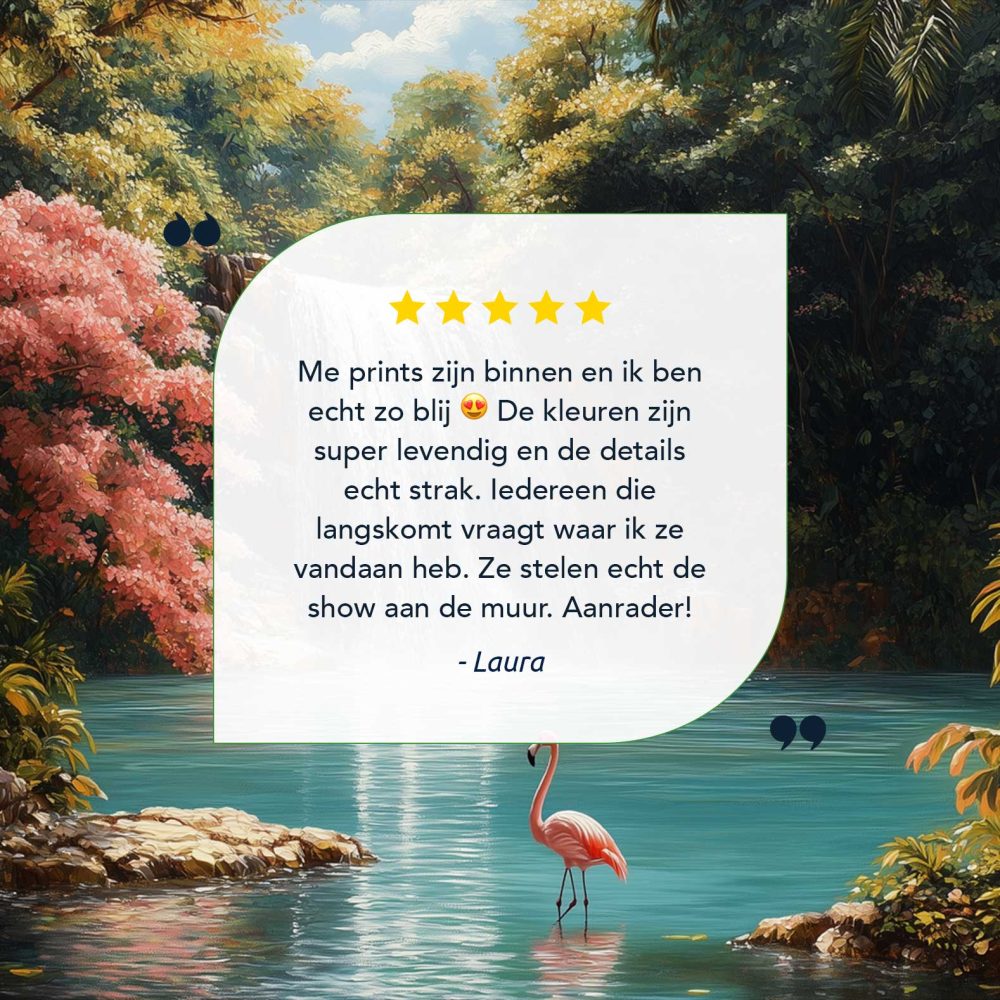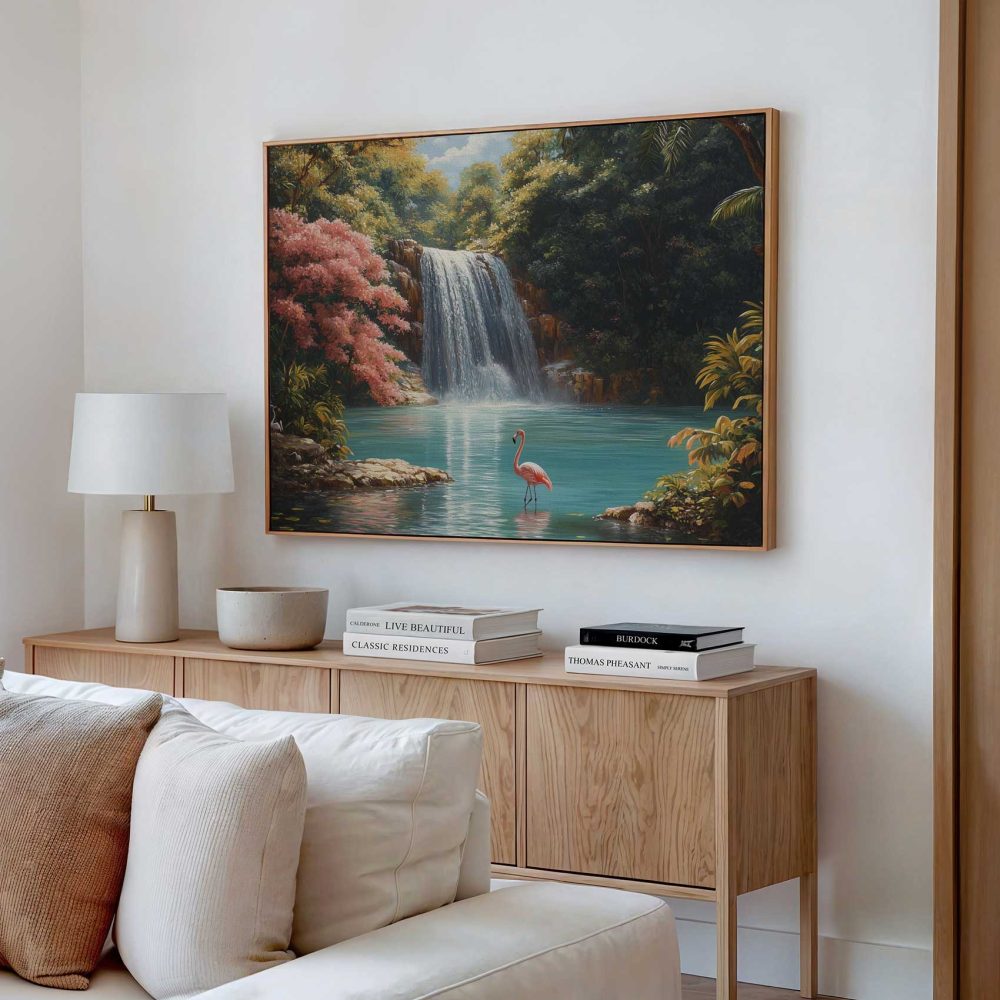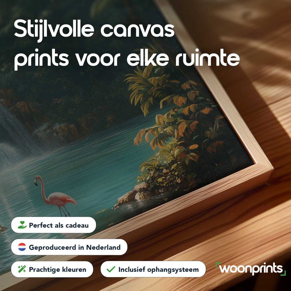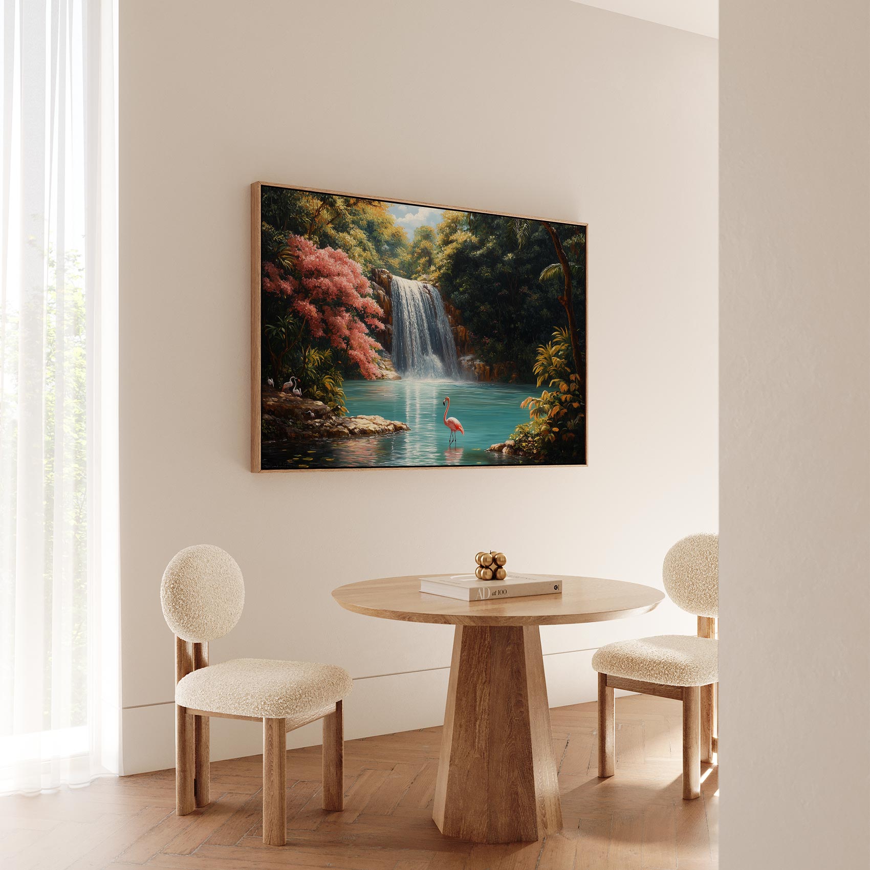 Terug naar collectie / Schilderijen / Bloemen Schilderij / Rustige waterval met flamingo