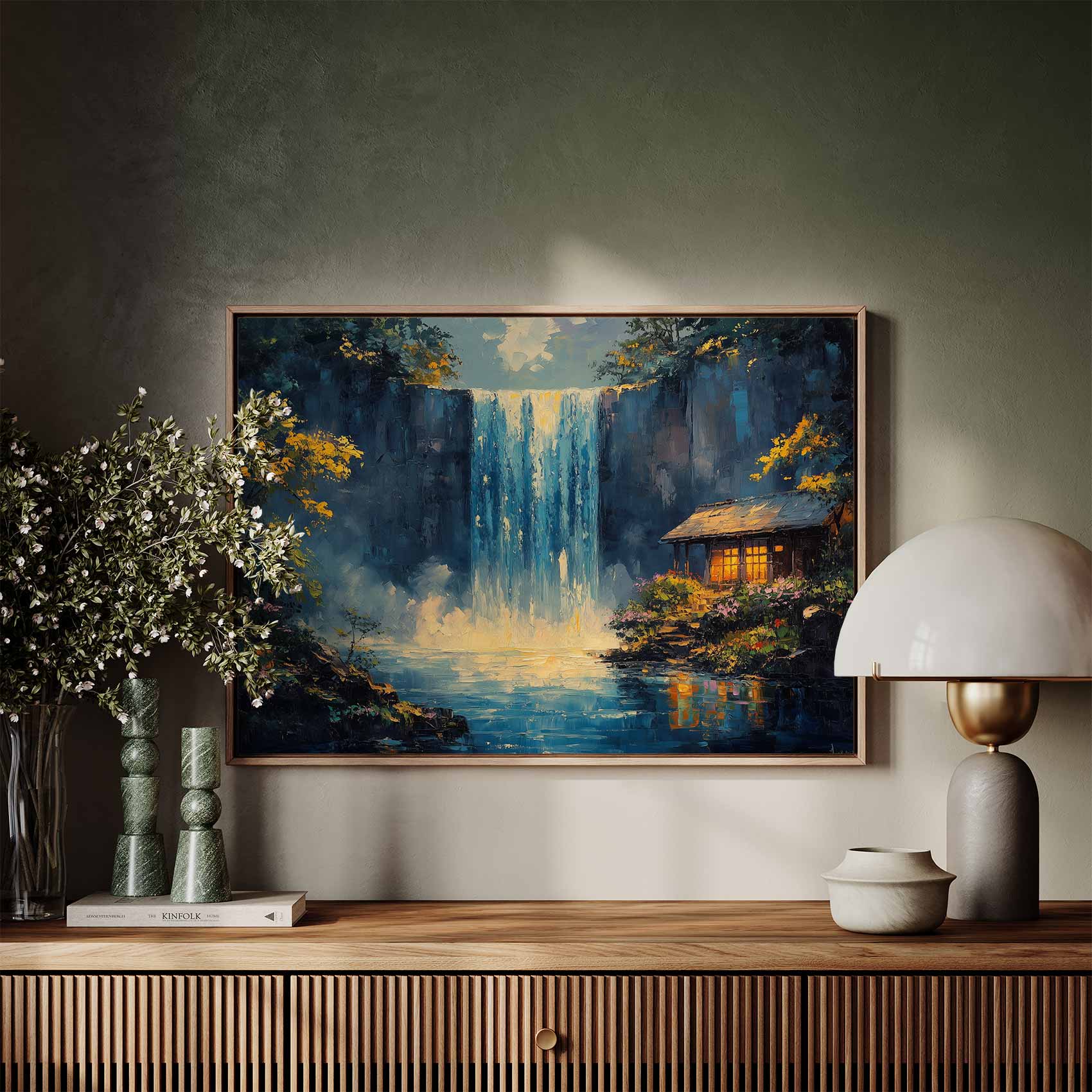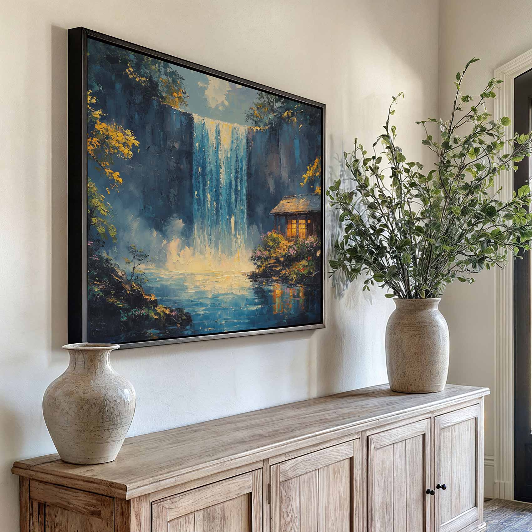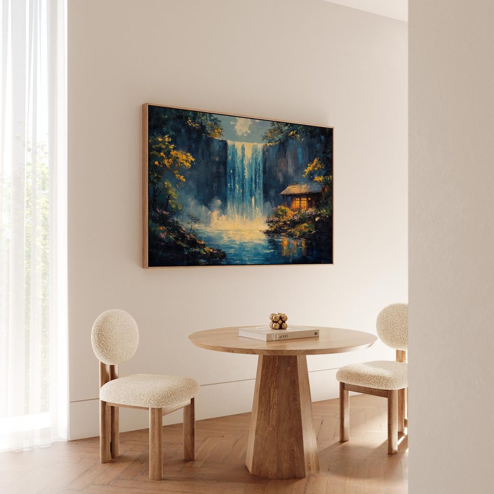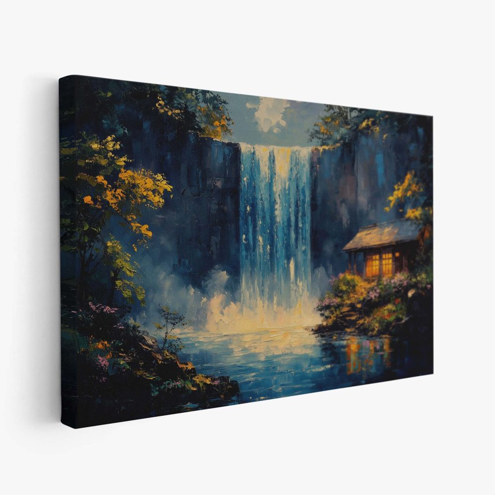 Terug naar collectie / Schilderijen / Bergen Schilderij / Rustige waterval met hutje