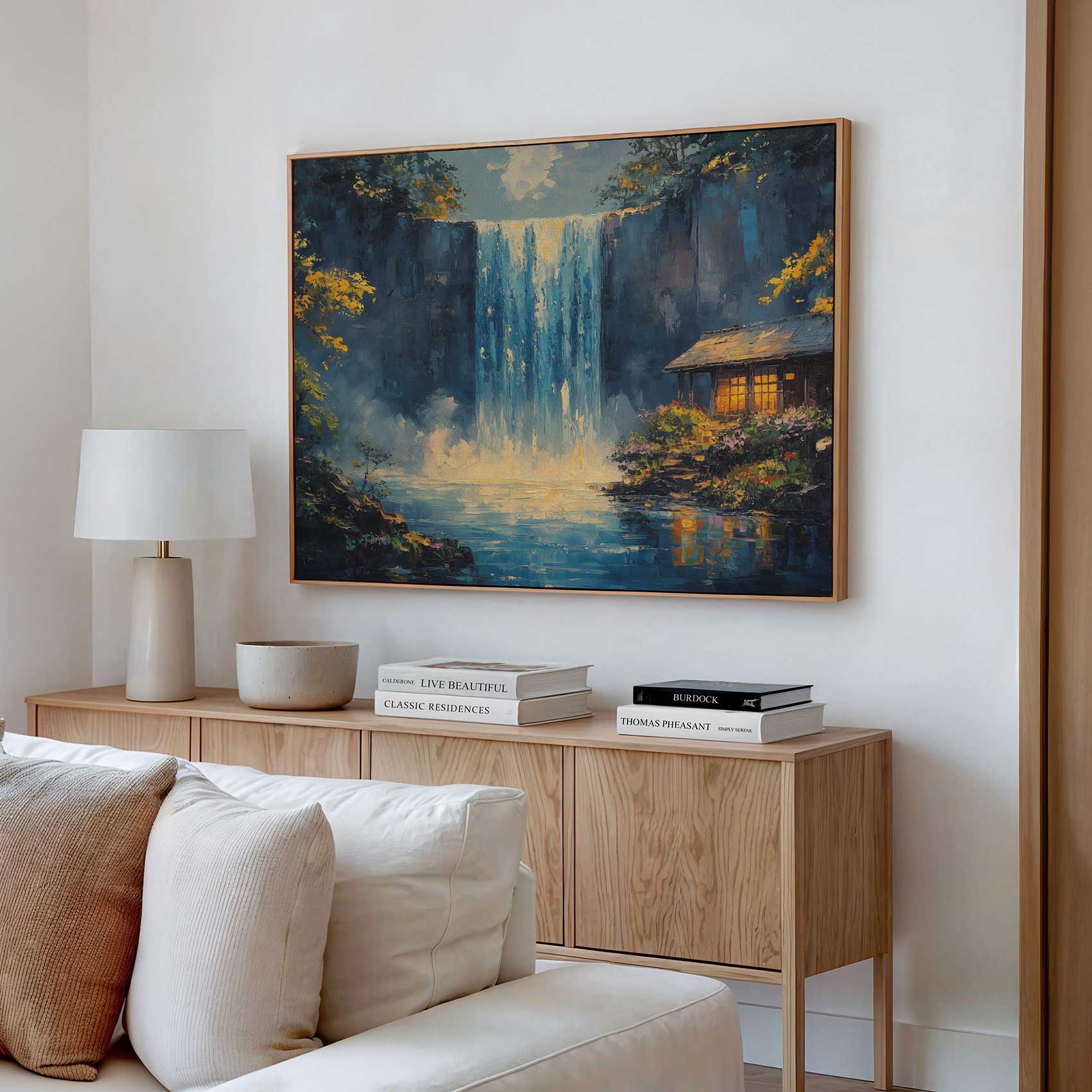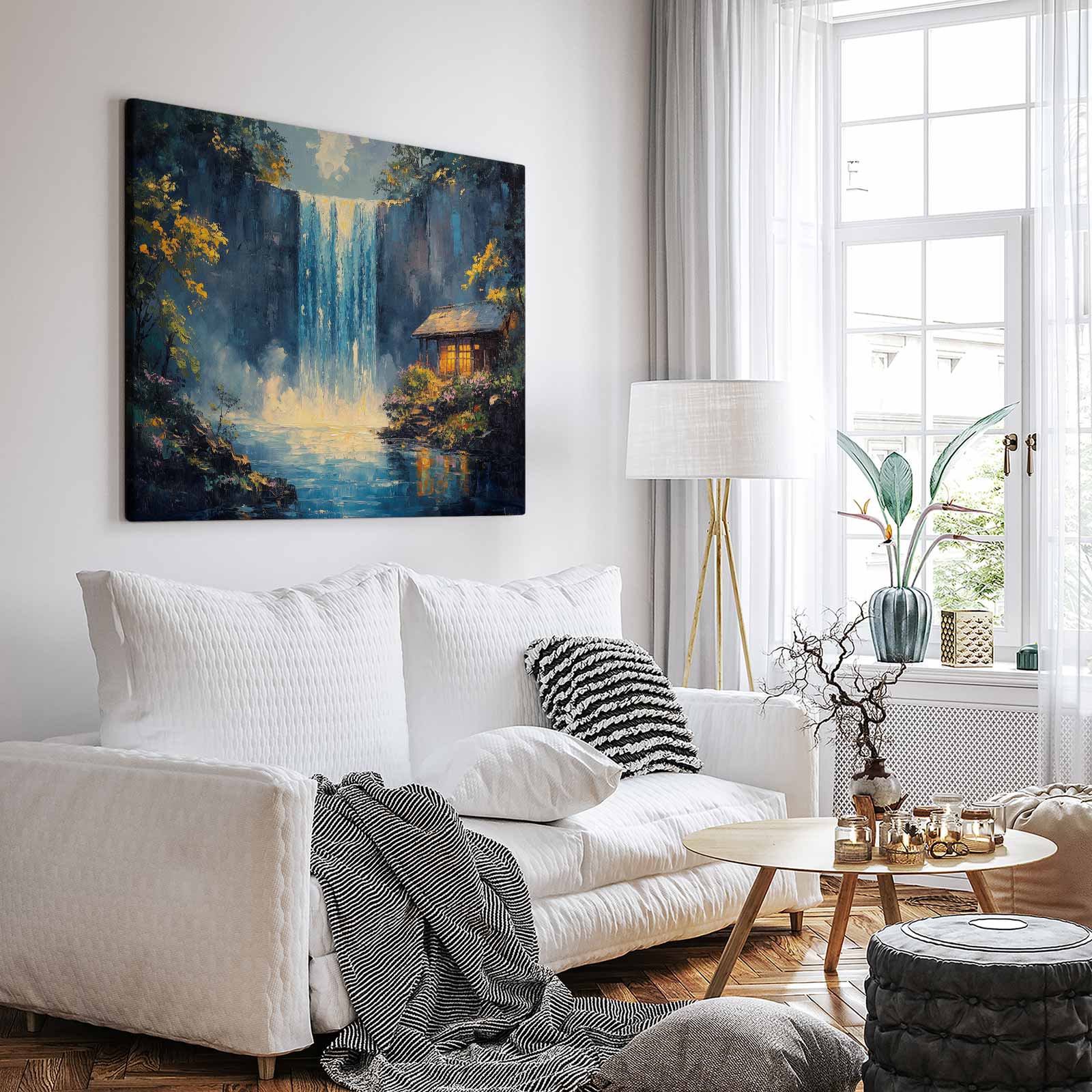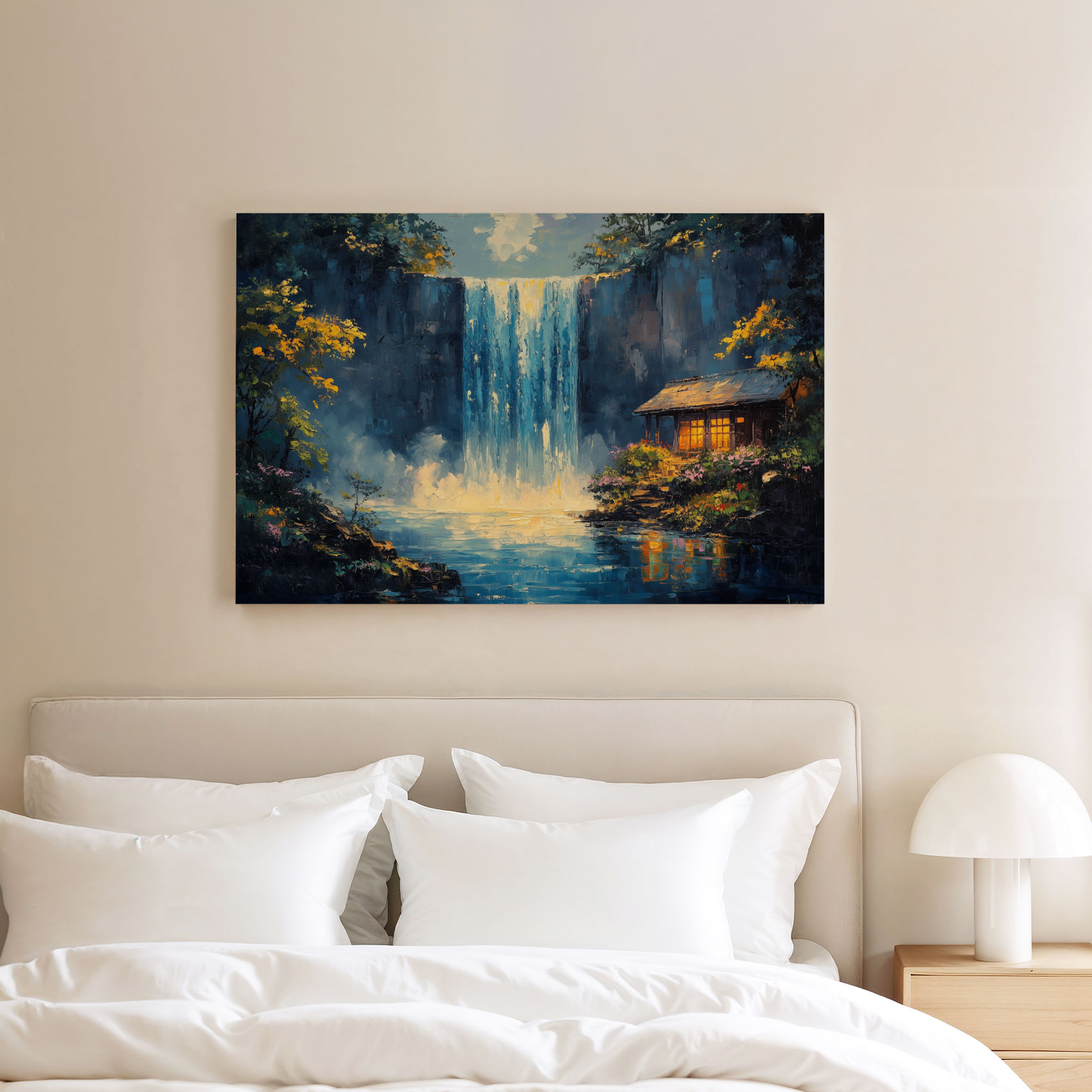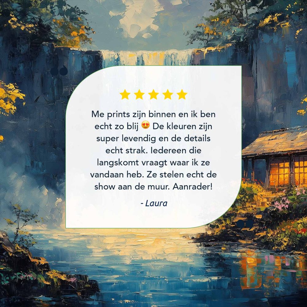 Terug naar collectie / Schilderijen / Bergen Schilderij / Rustige waterval met hutje
