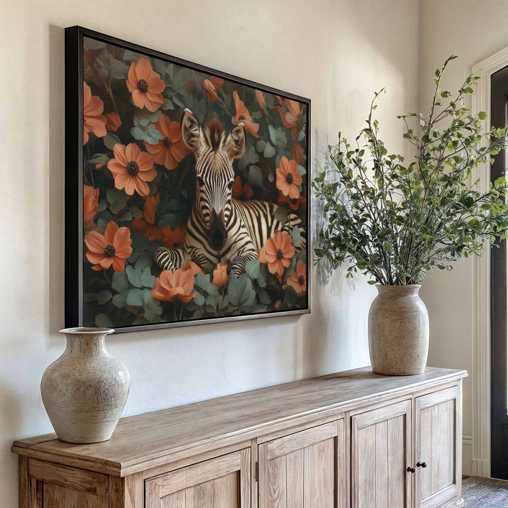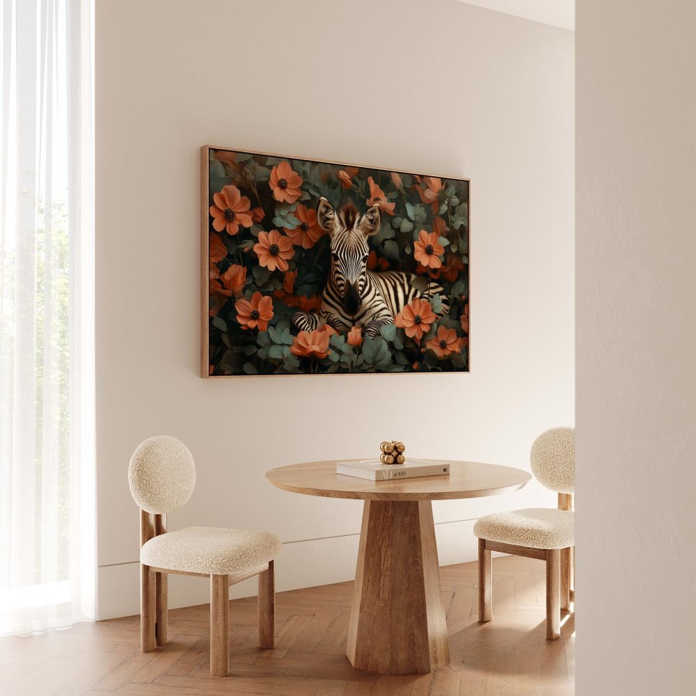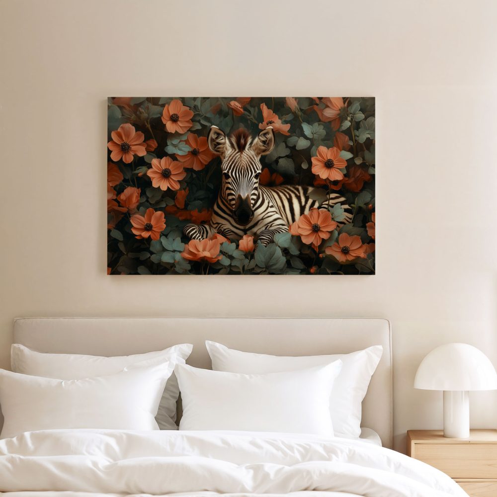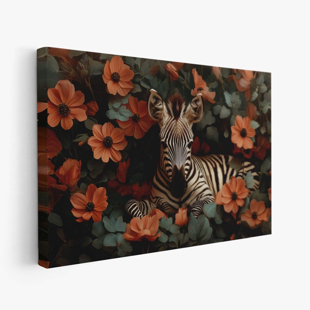 Terug naar collectie / Schilderijen / Bloemen Schilderij / Rustige zebra tussen oranje bloemen