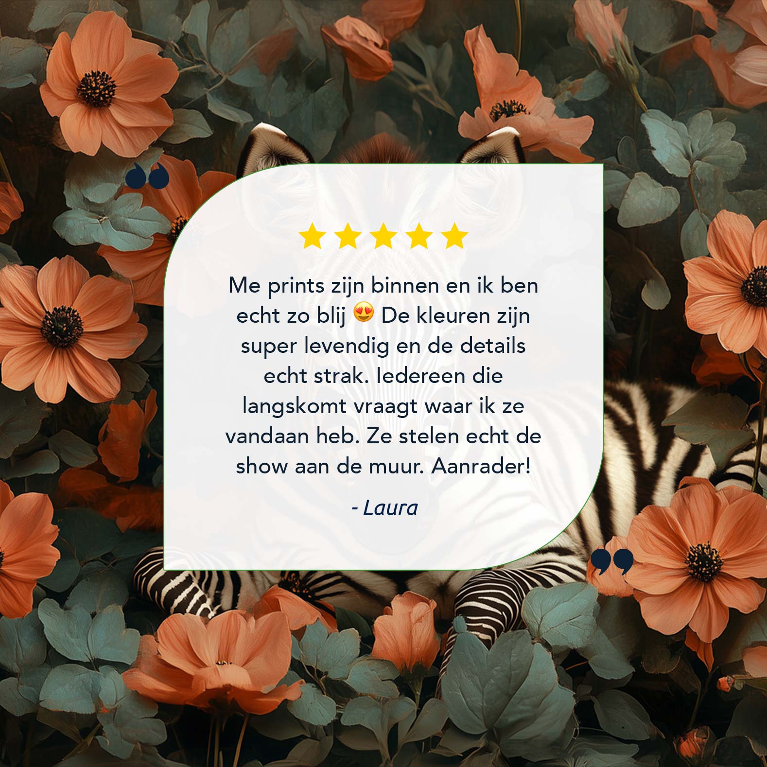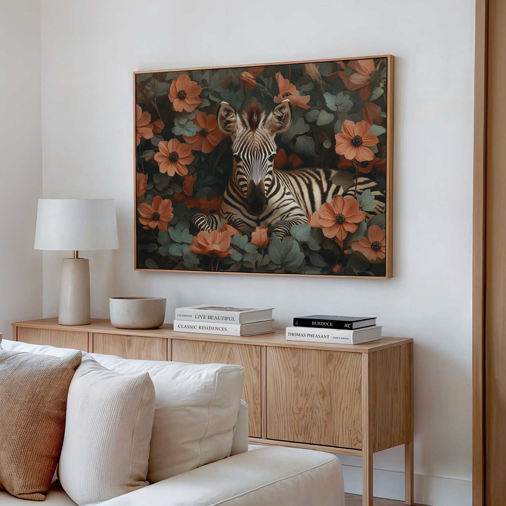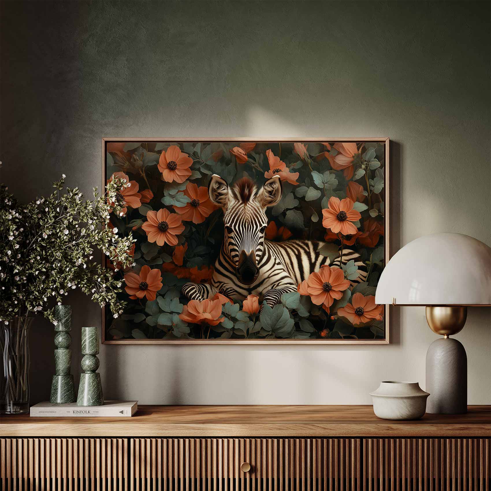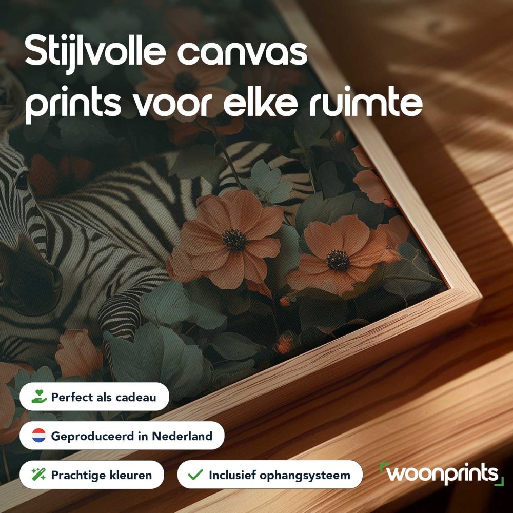 Terug naar collectie / Schilderijen / Bloemen Schilderij / Rustige zebra tussen oranje bloemen