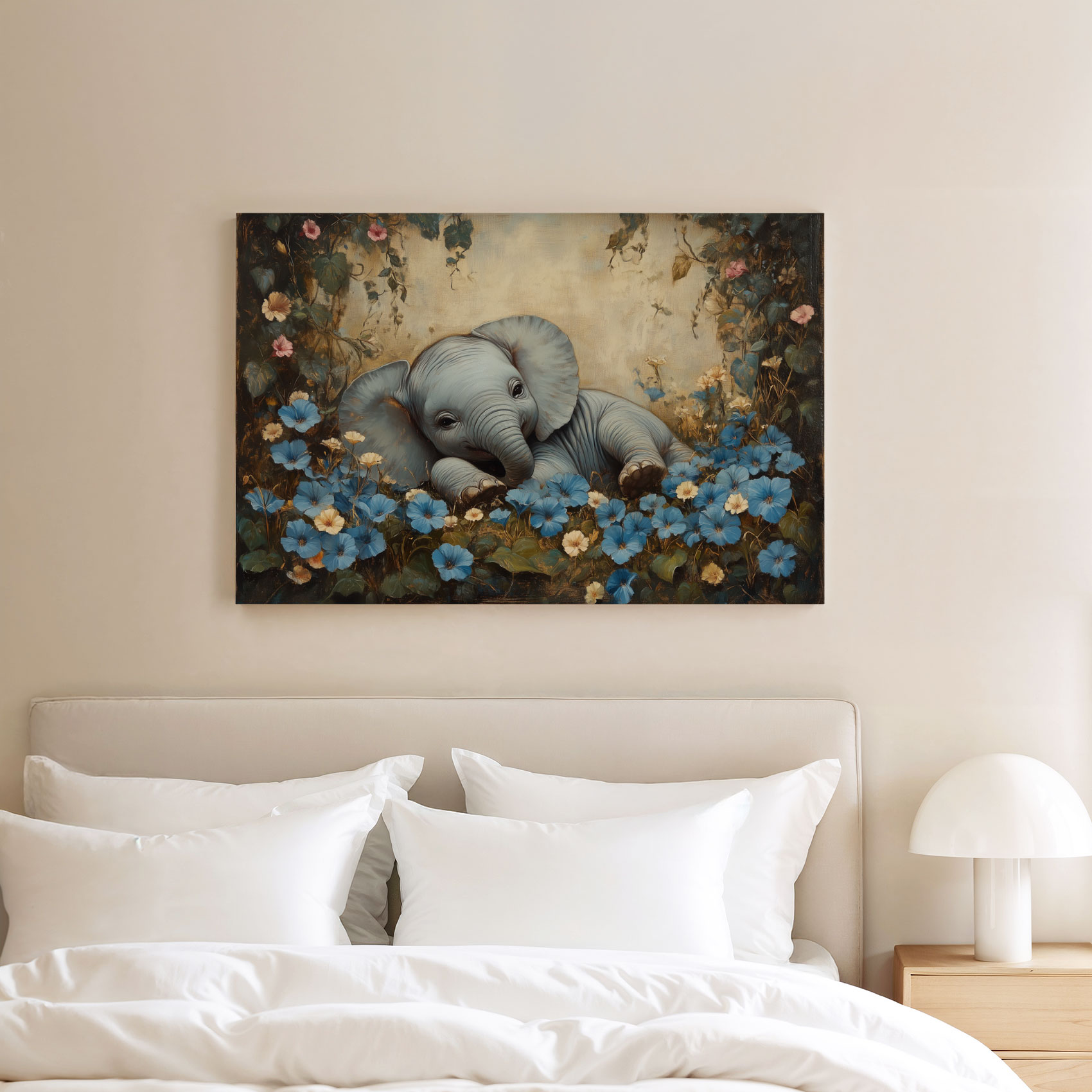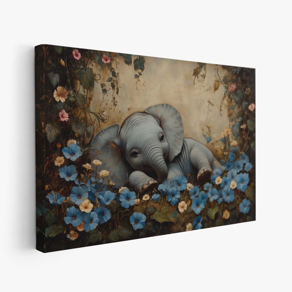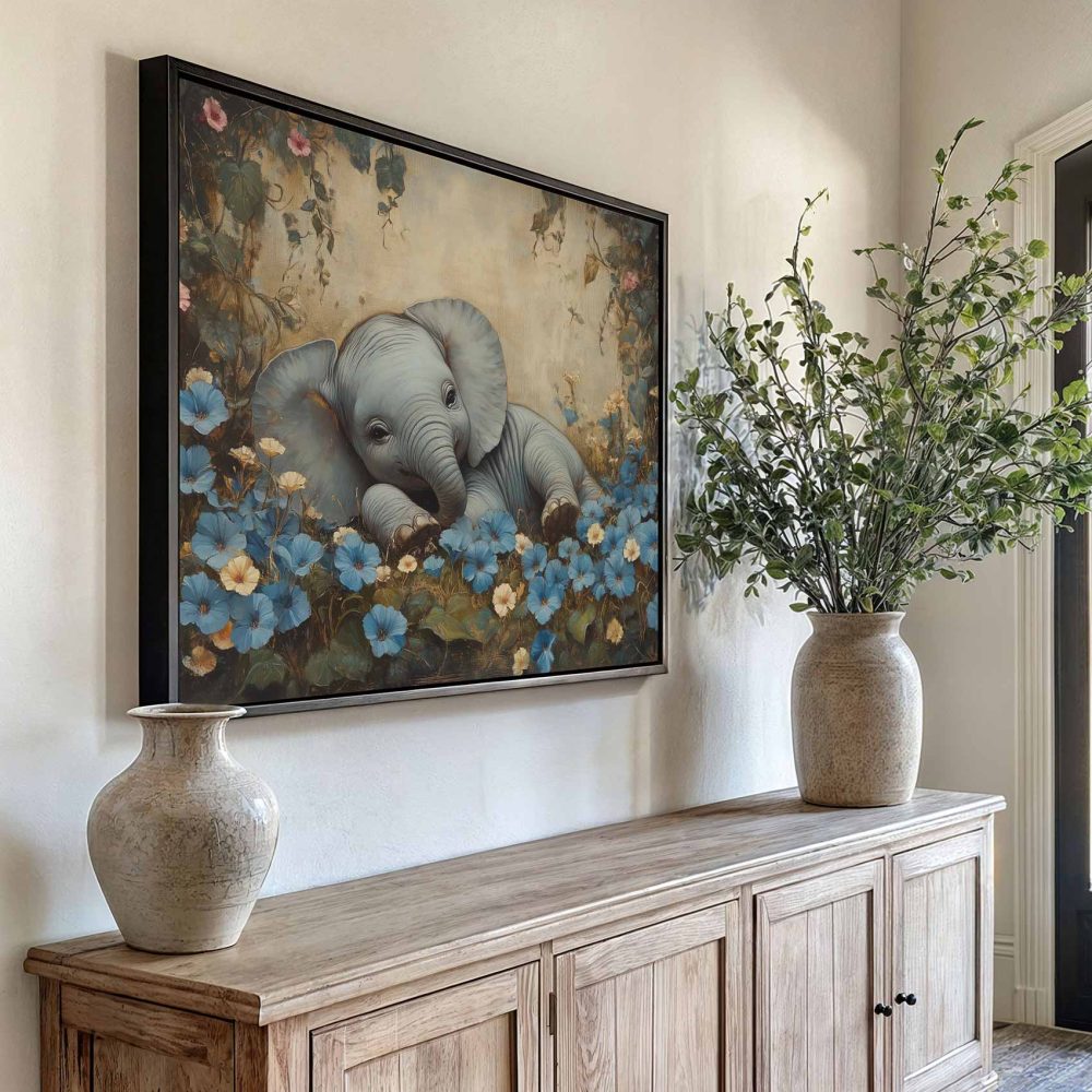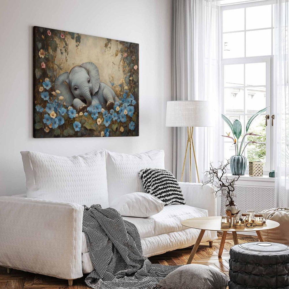 Terug naar collectie / Schilderijen / Bloemen Schilderij / Schattige babyolifant in bloemenveld