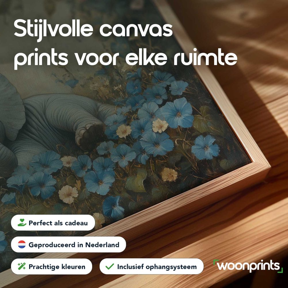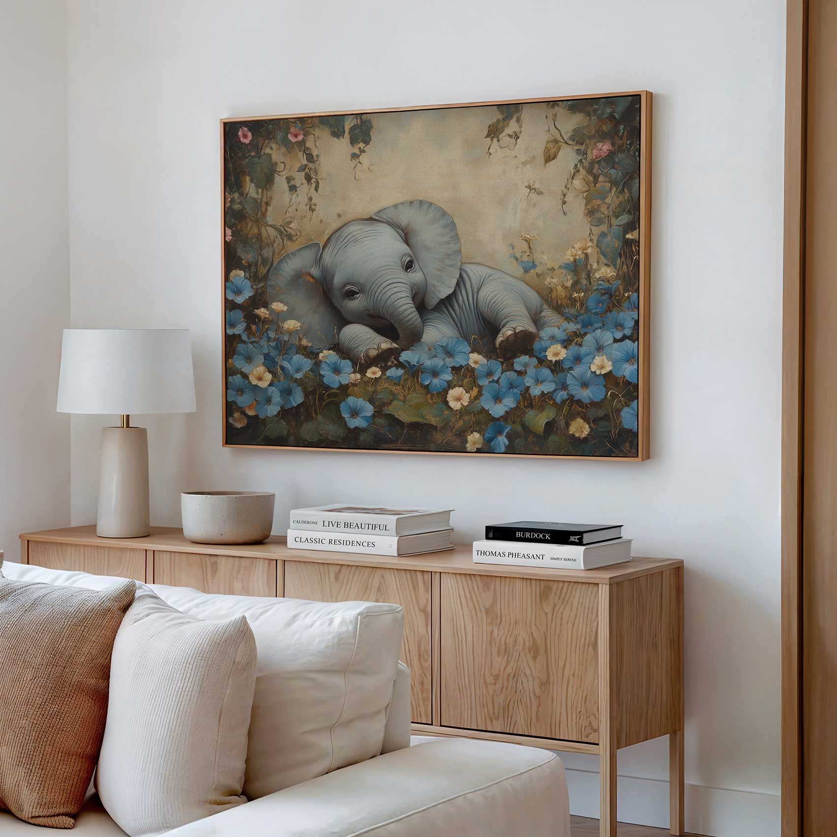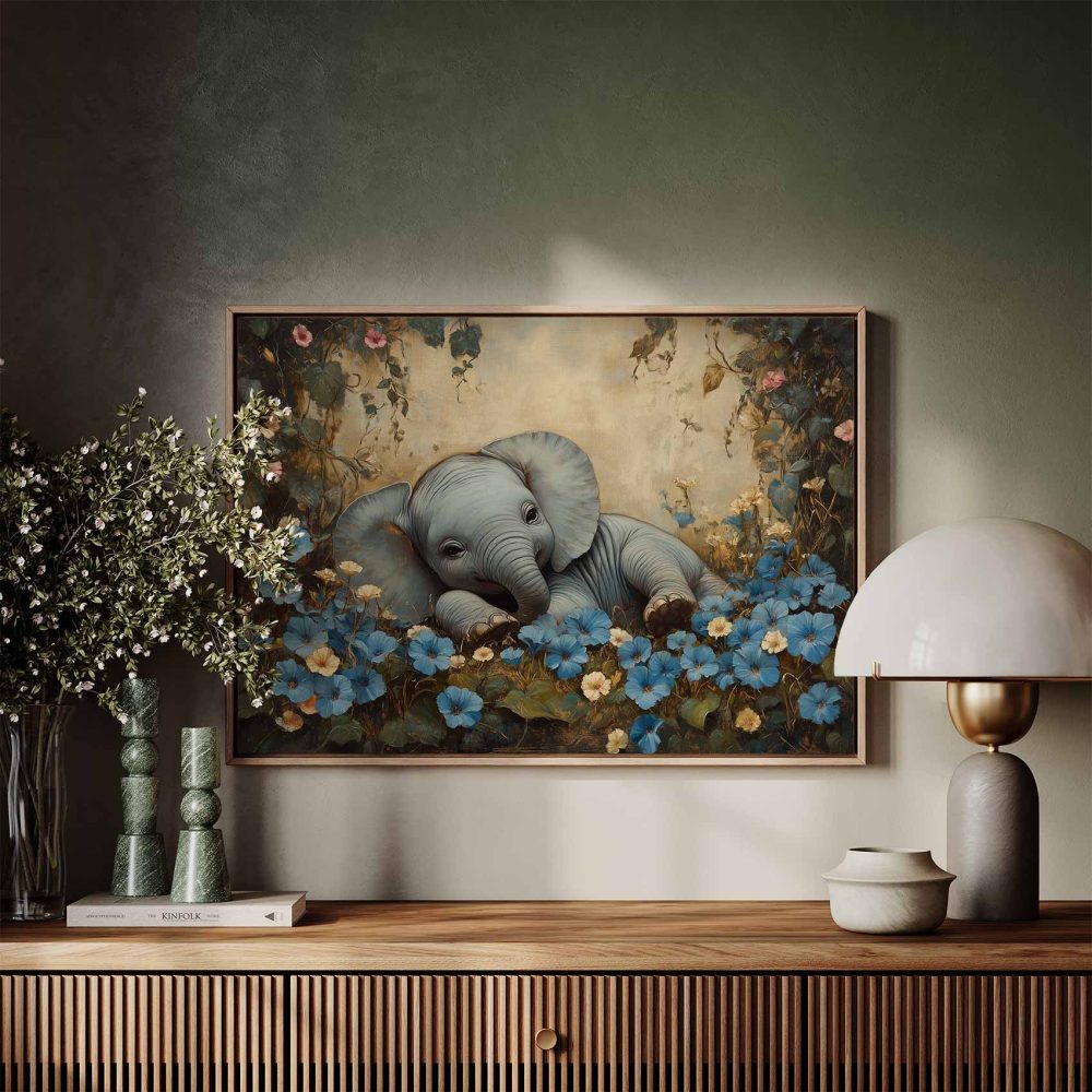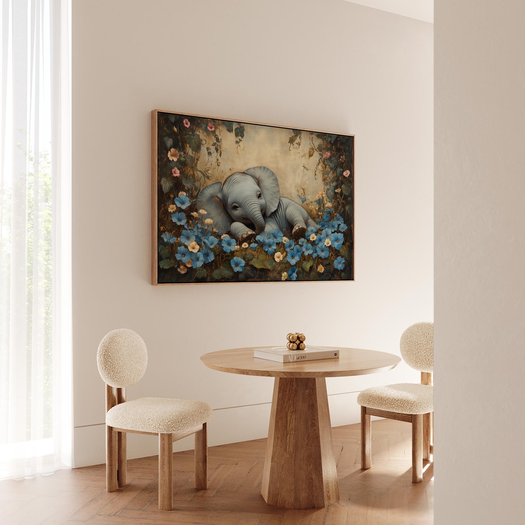 Terug naar collectie / Schilderijen / Bloemen Schilderij / Schattige babyolifant in bloemenveld