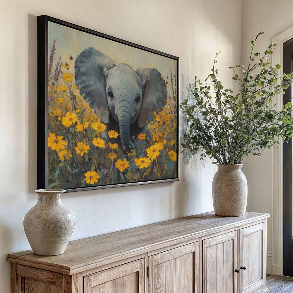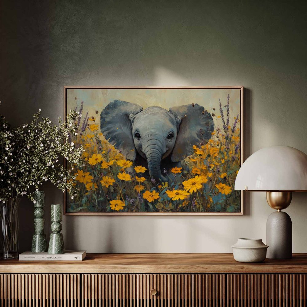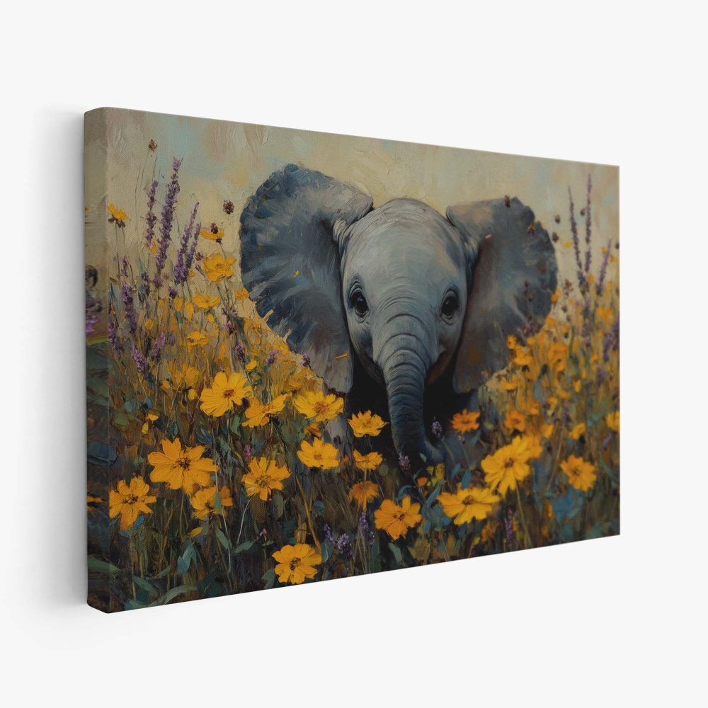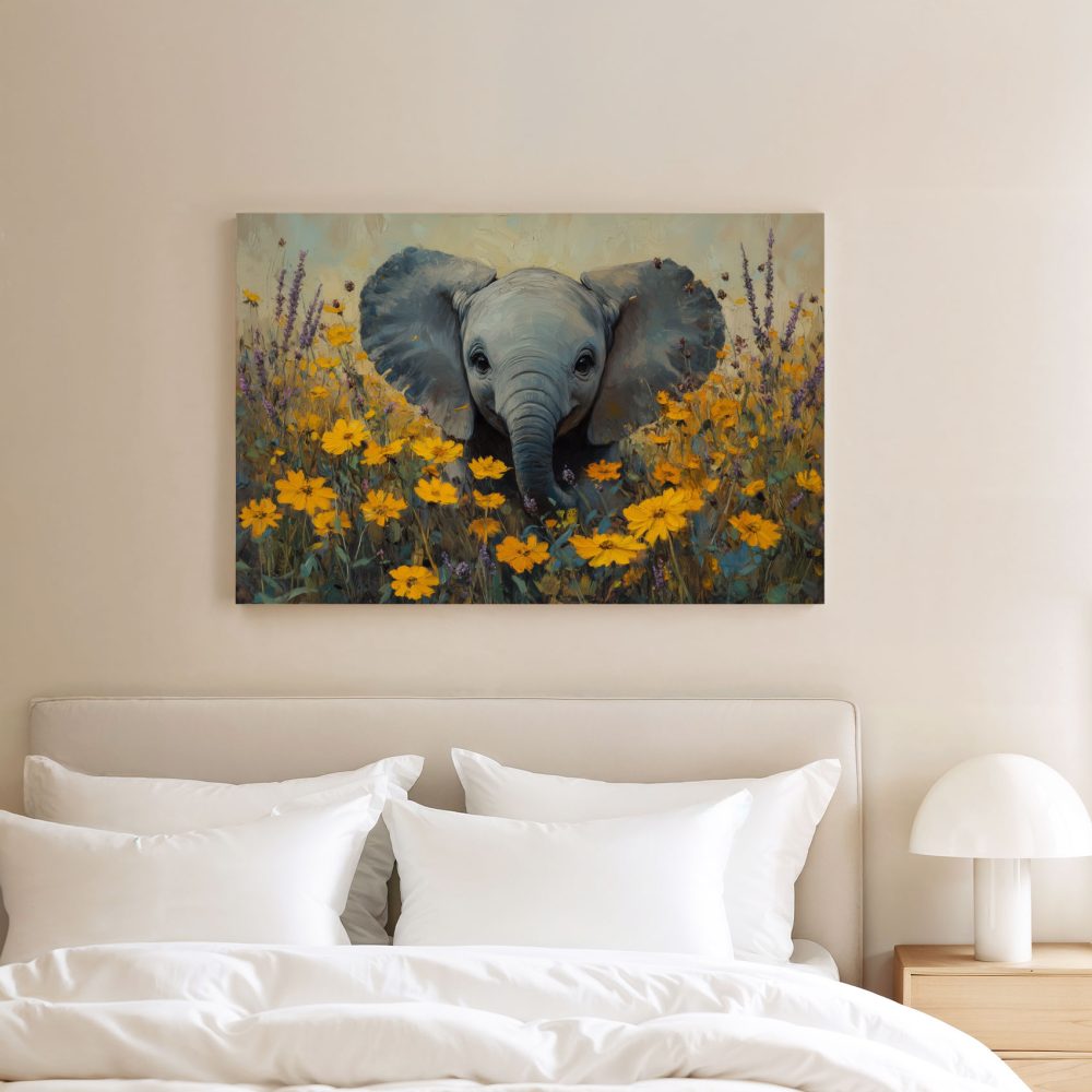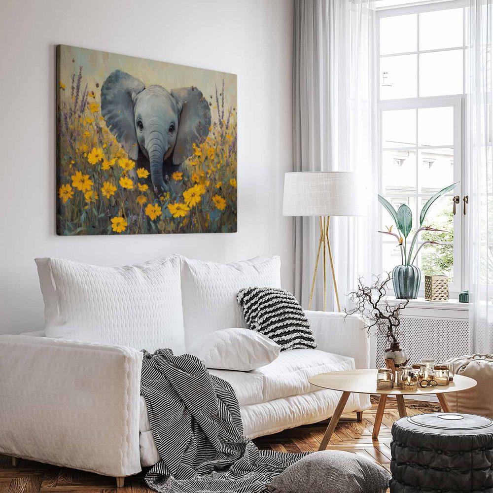 Terug naar collectie / Schilderijen / Bloemen Schilderij / Schattige babyolifant in bloemenveld