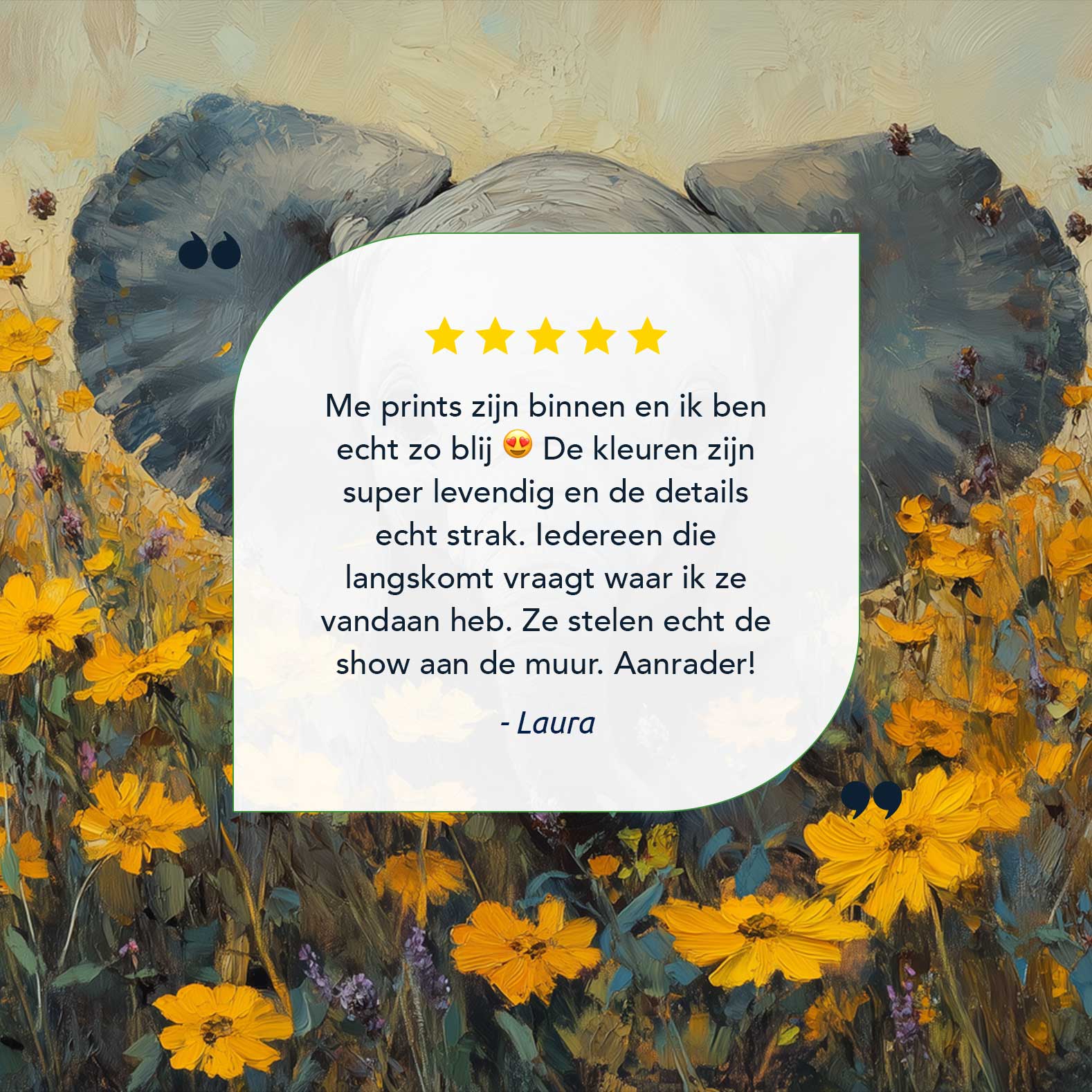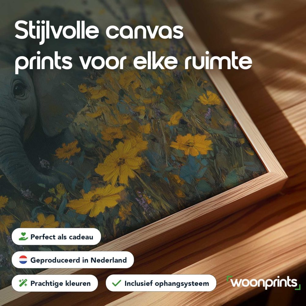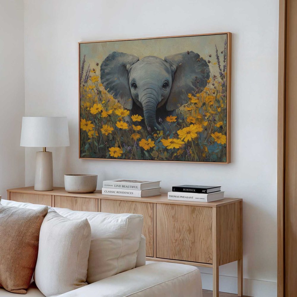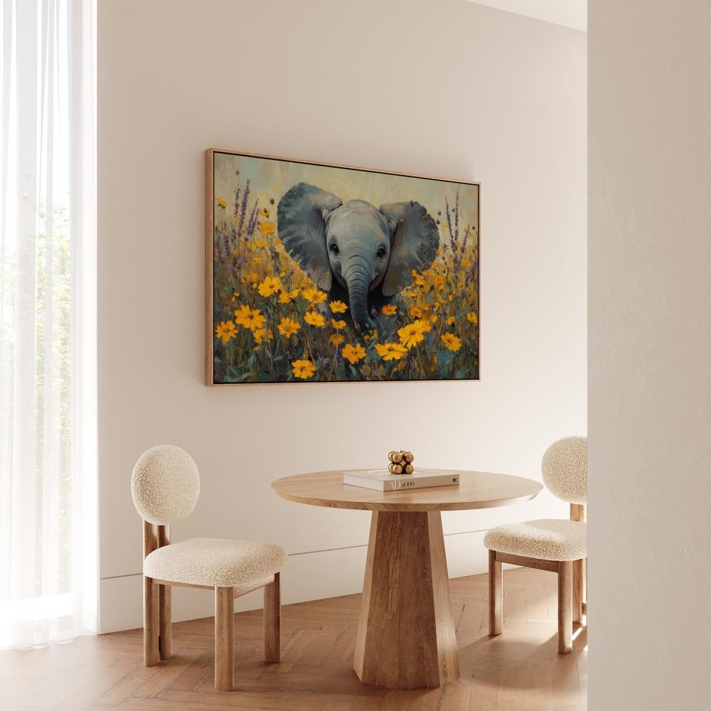 Terug naar collectie / Schilderijen / Bloemen Schilderij / Schattige babyolifant in bloemenveld