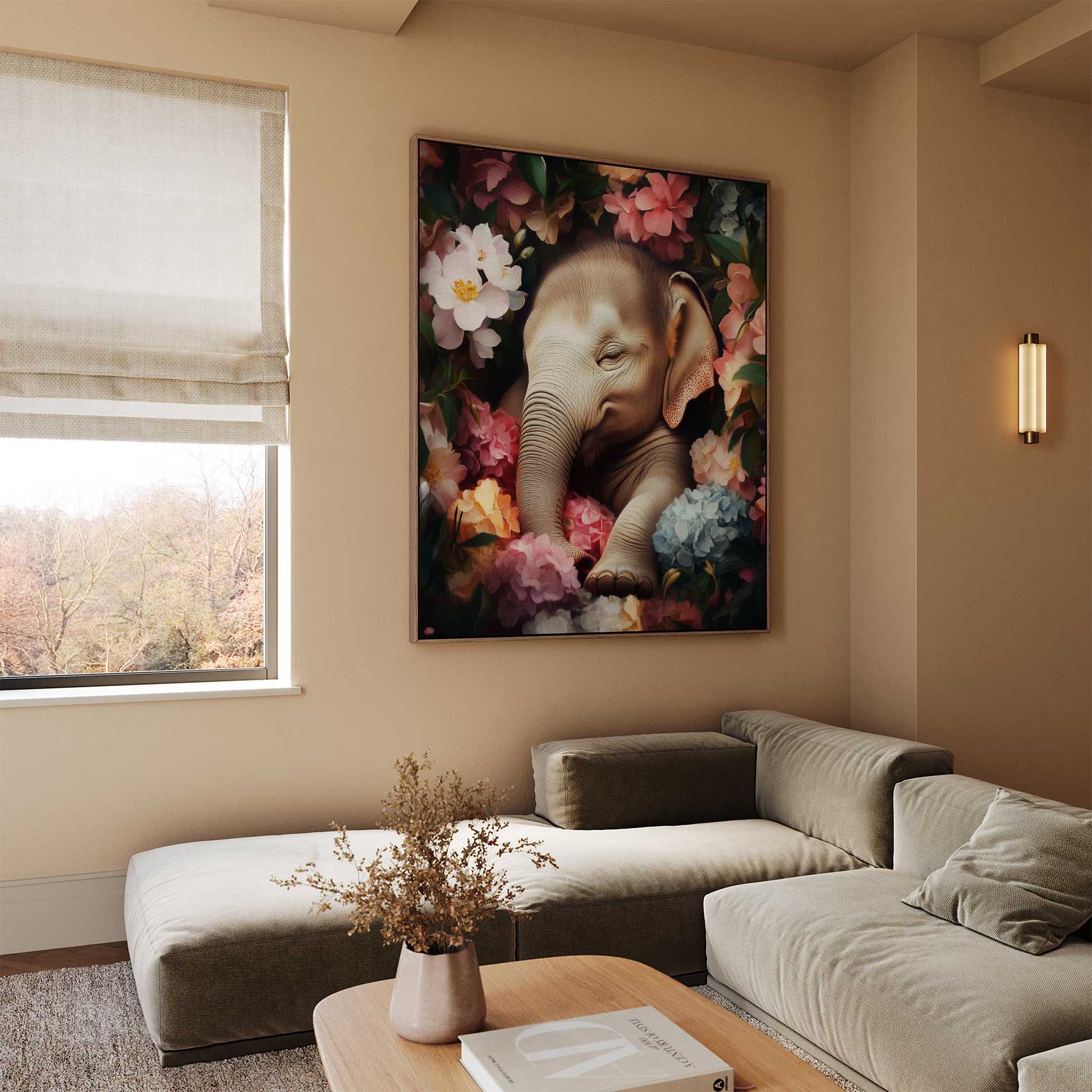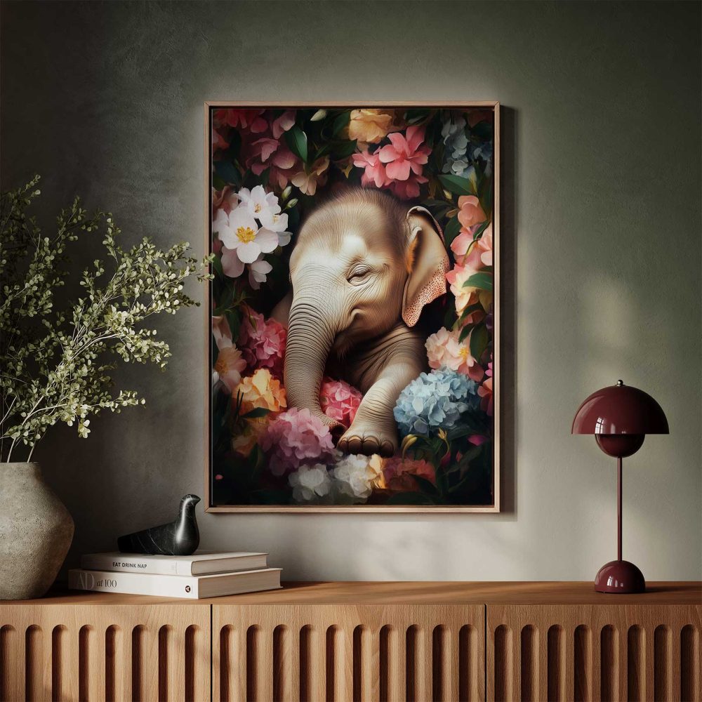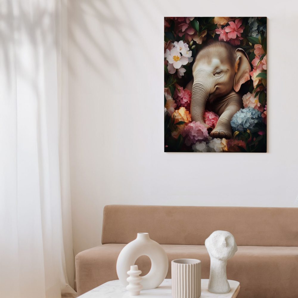 Terug naar collectie / Schilderijen / Bloemen Schilderij / Schattige olifant in bloemenzee