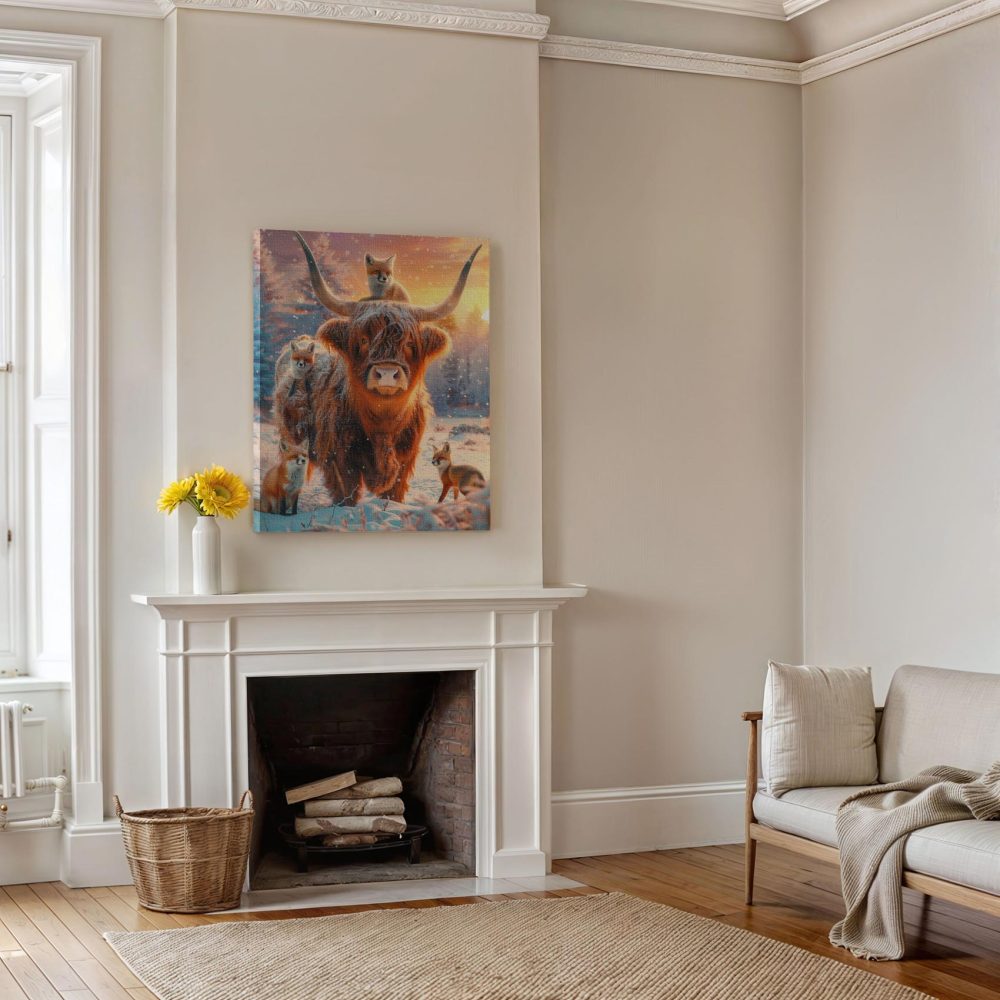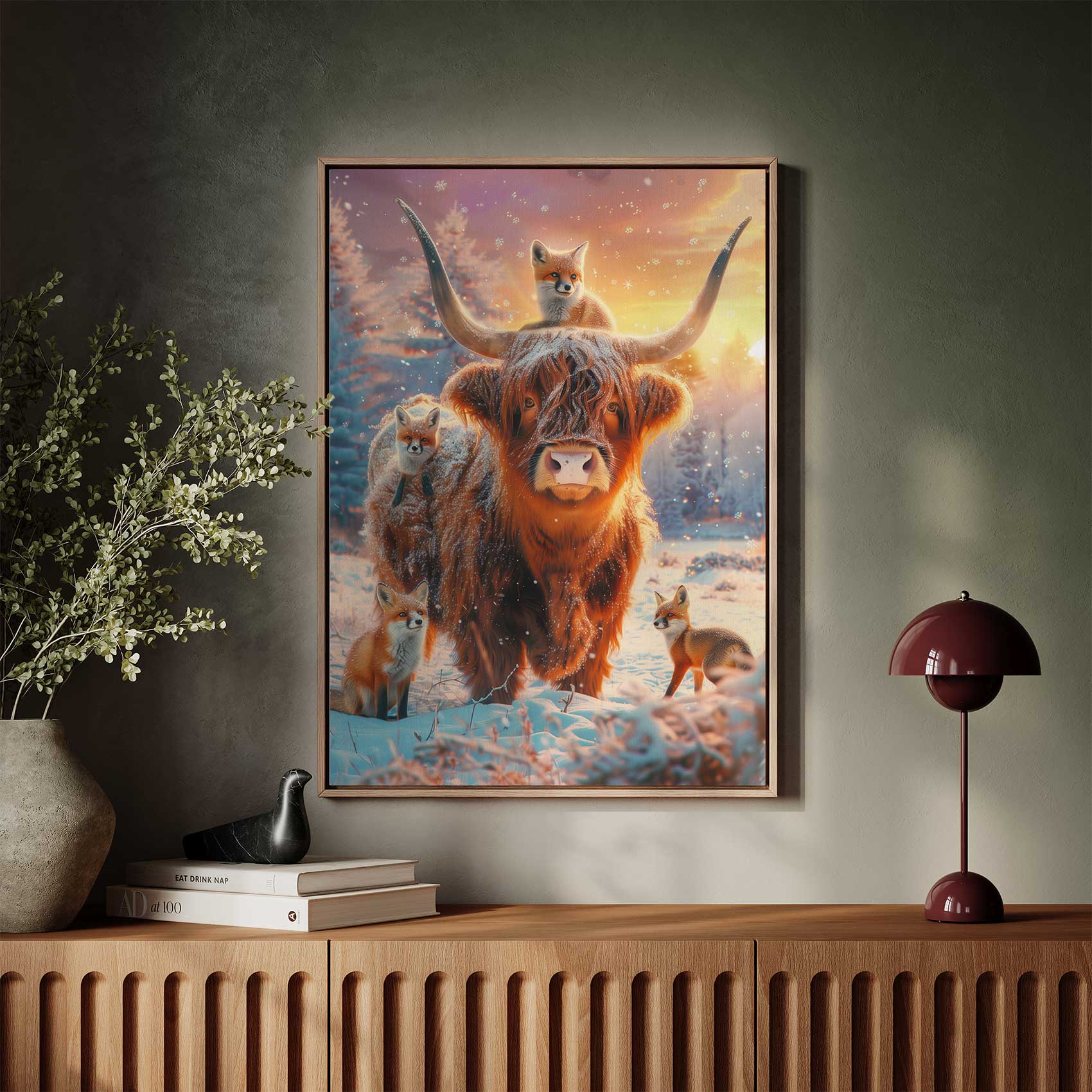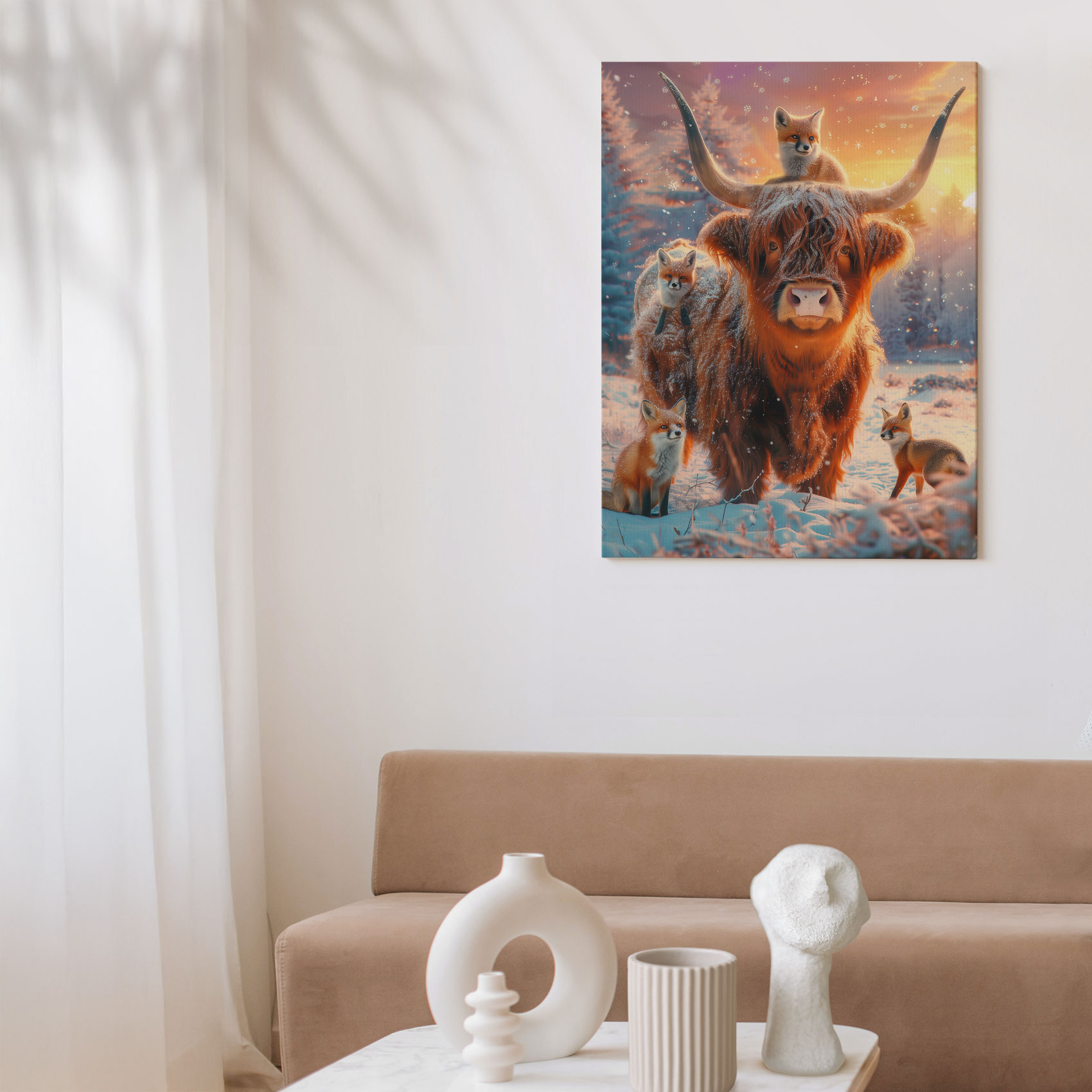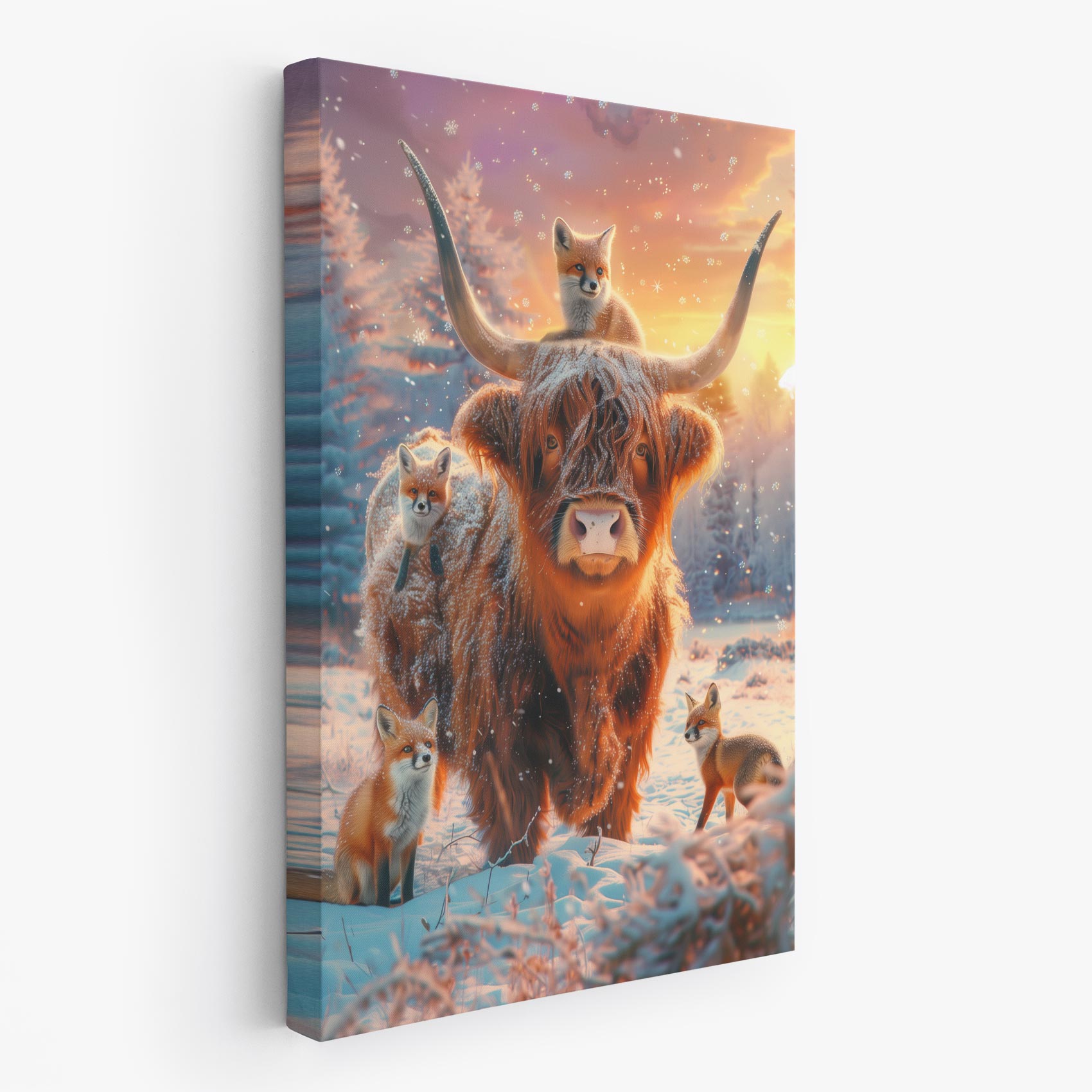 Terug naar collectie / Schilderijen / Bossen Schilderij / Schotse hooglander en vossen in sneeuw