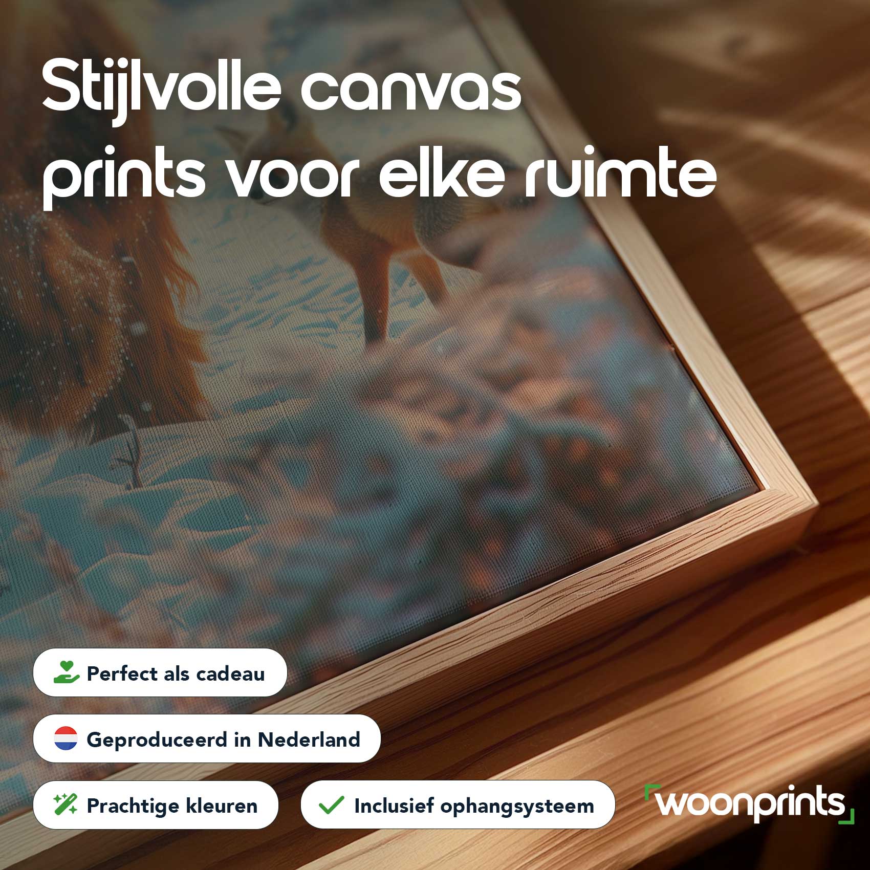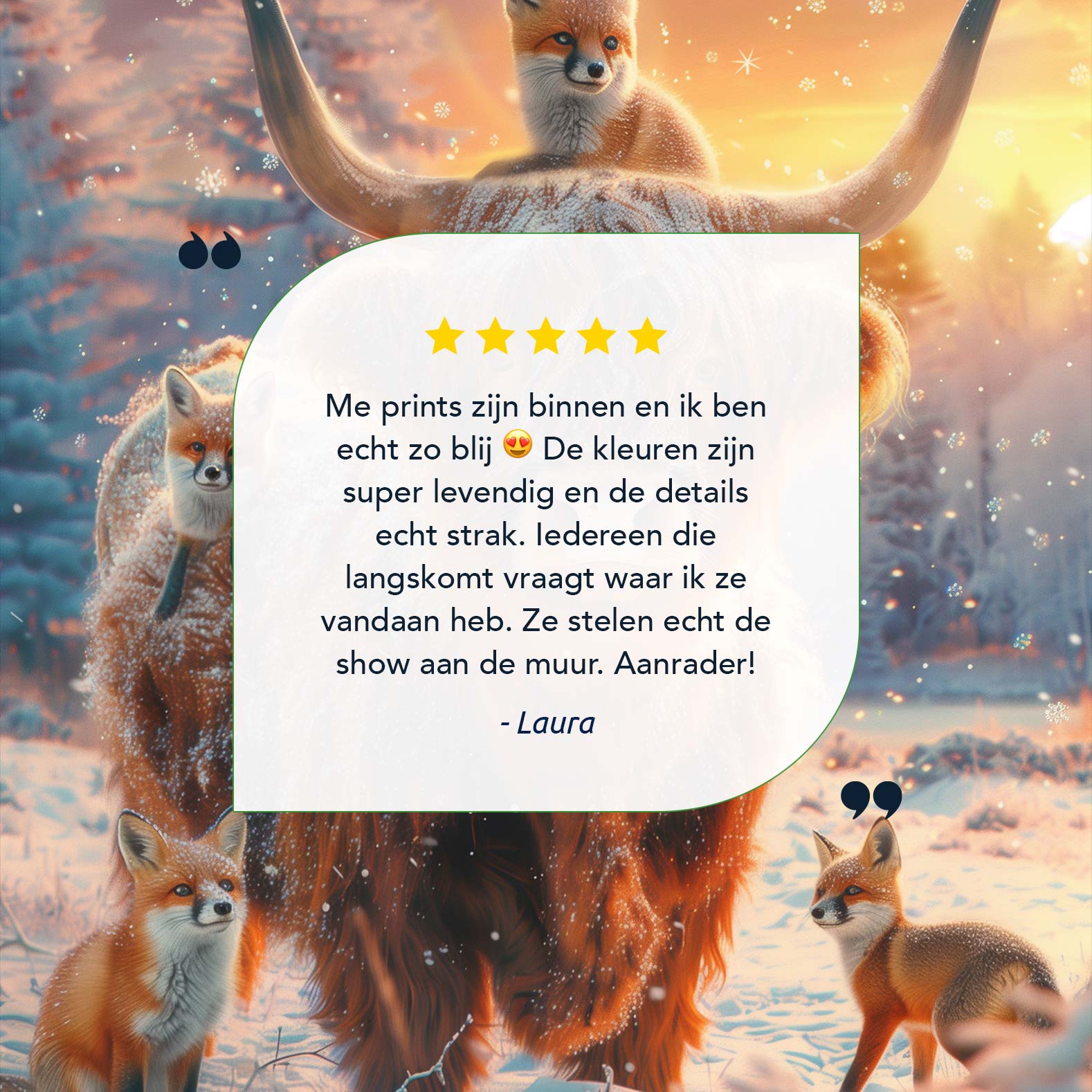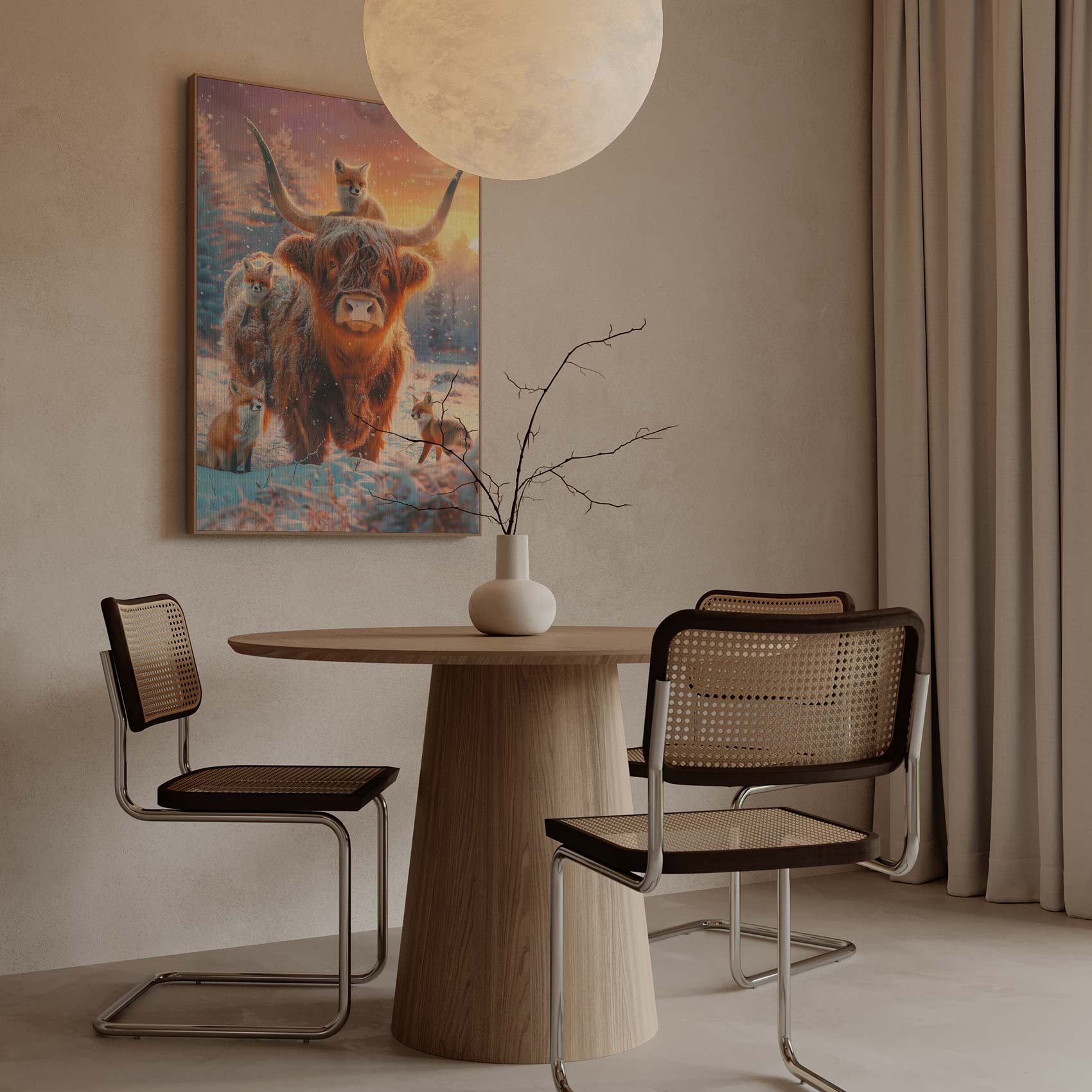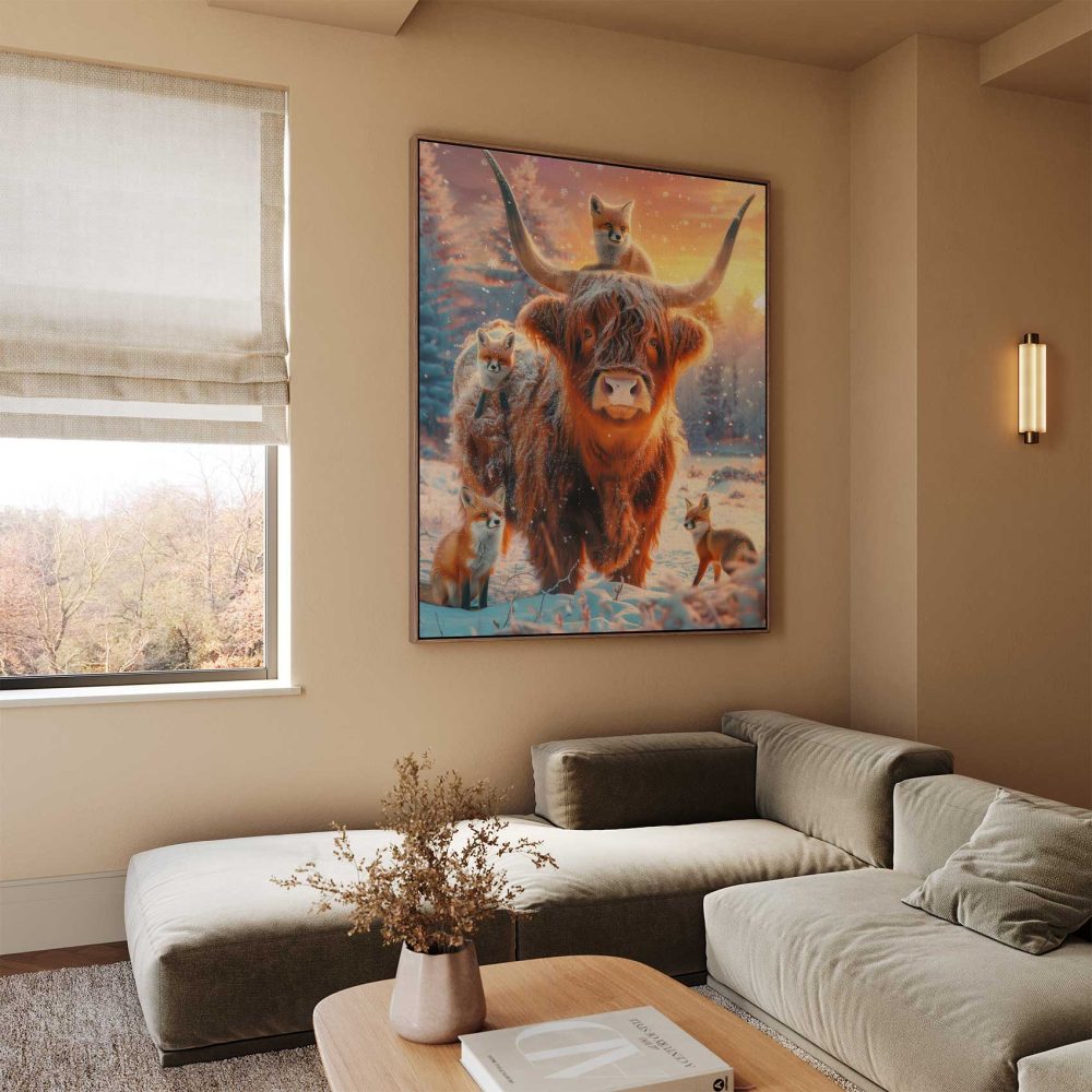 Terug naar collectie / Schilderijen / Bossen Schilderij / Schotse hooglander en vossen in sneeuw