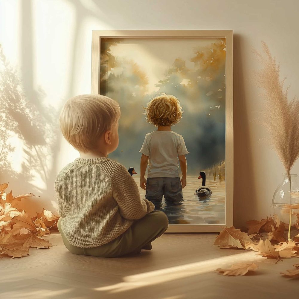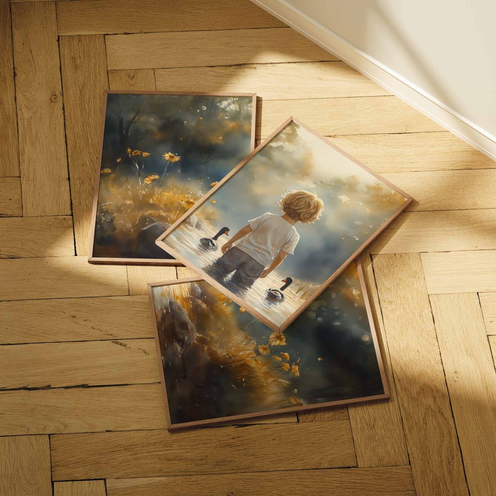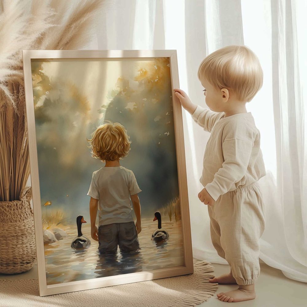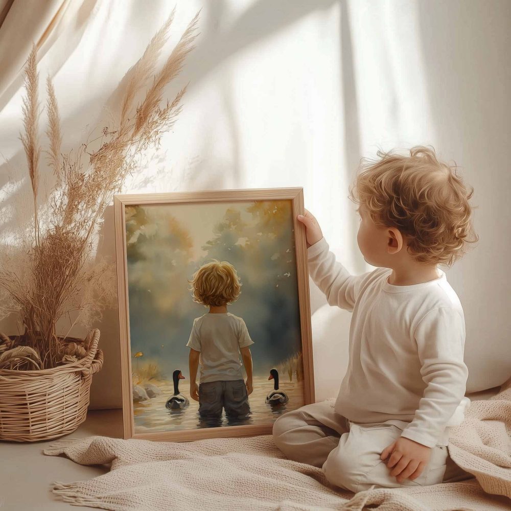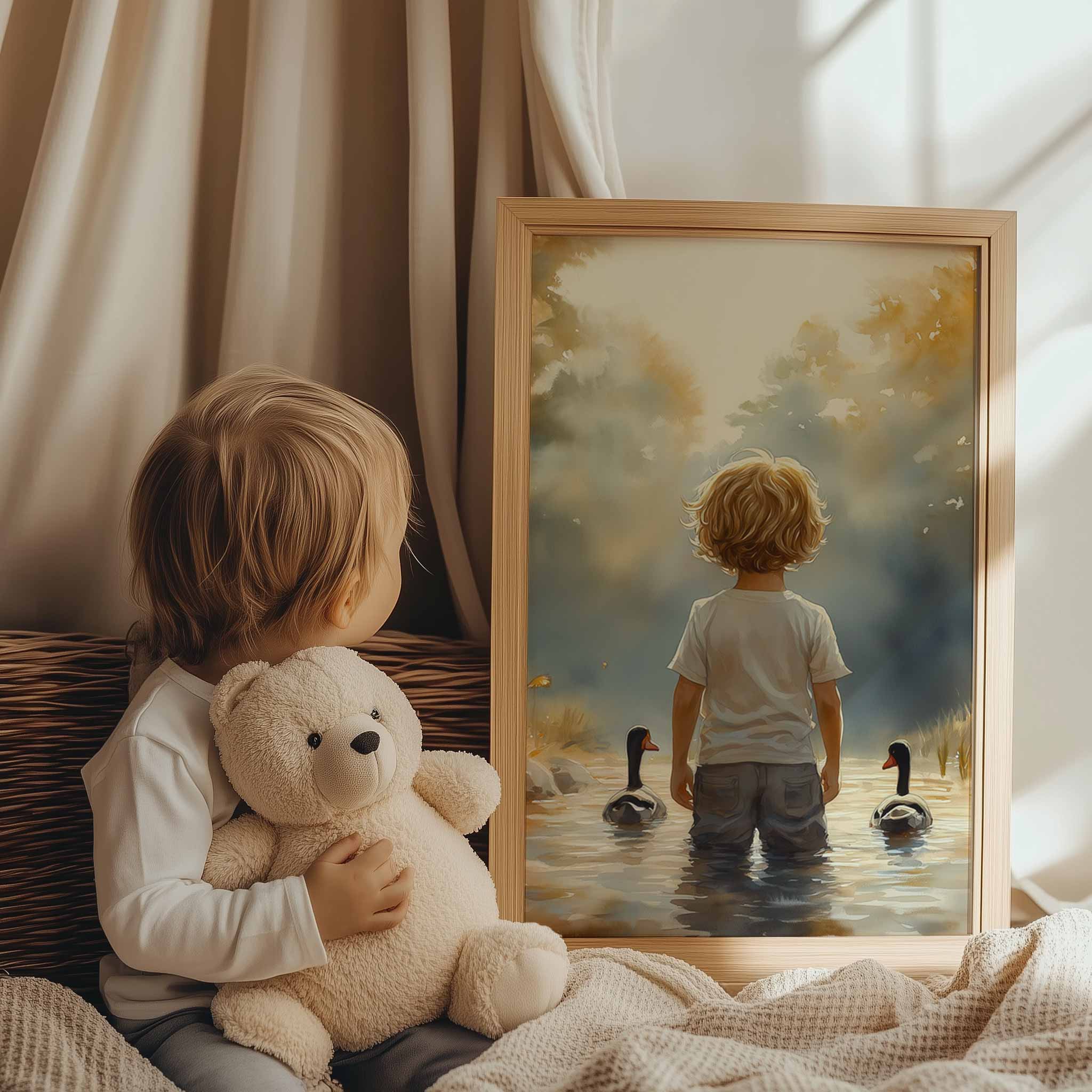 Terug naar collectie / Kinderkamer posters / Bloemen posters / Speels Jongetje met Eenden in Kleurrijk Waterlandschap