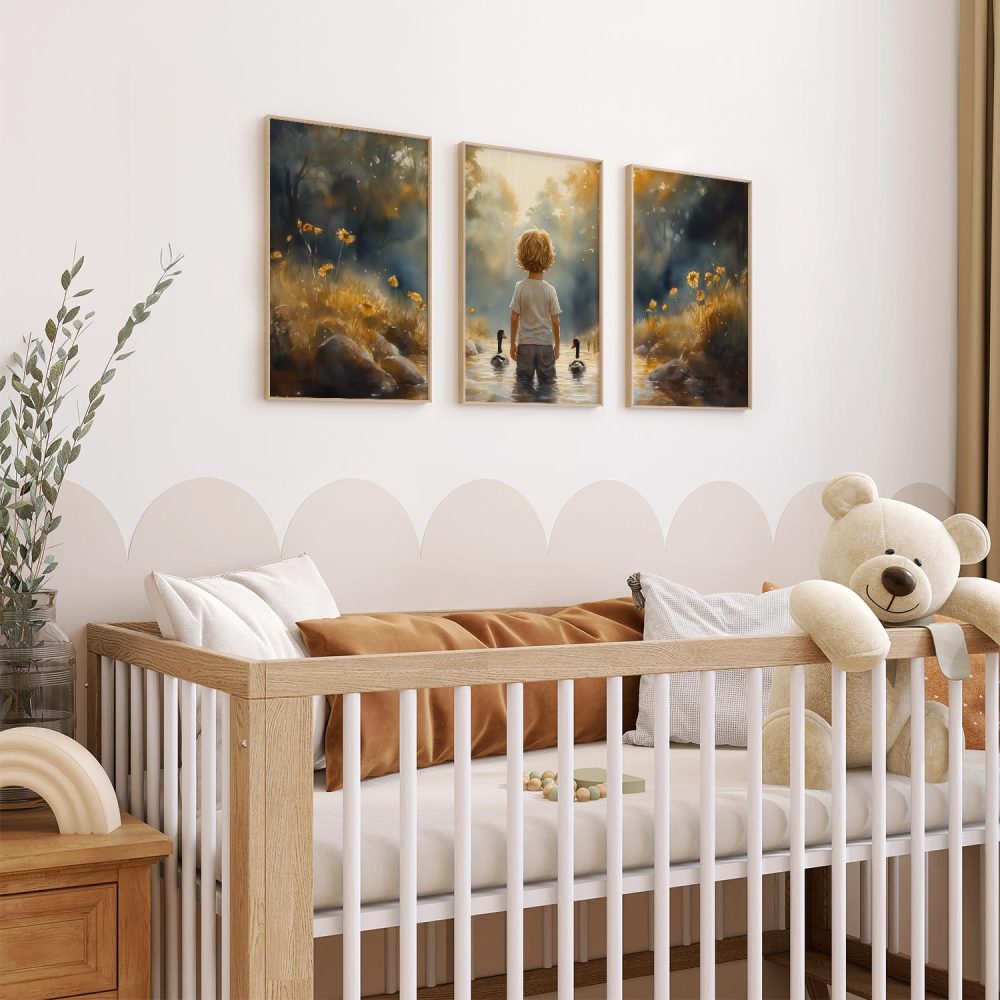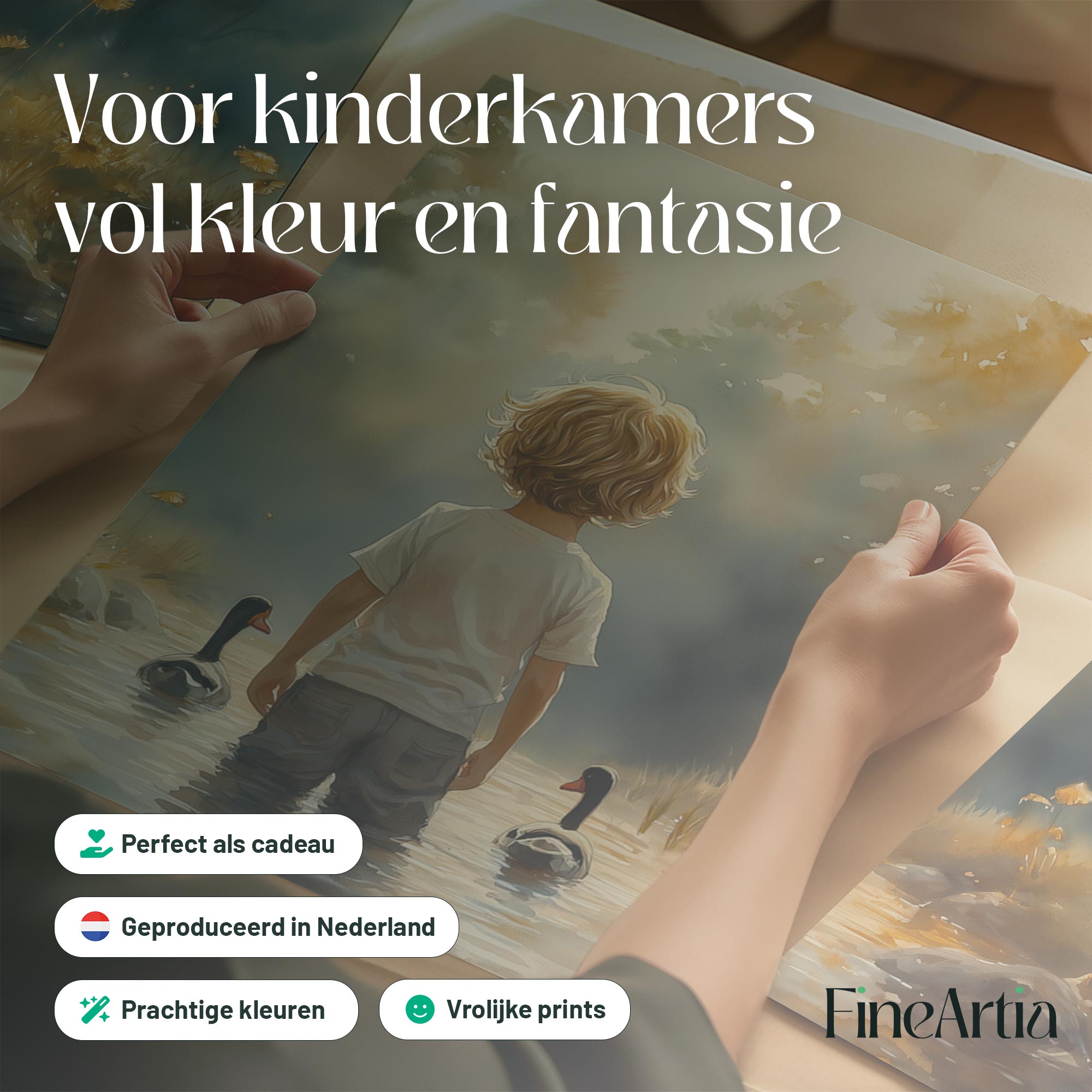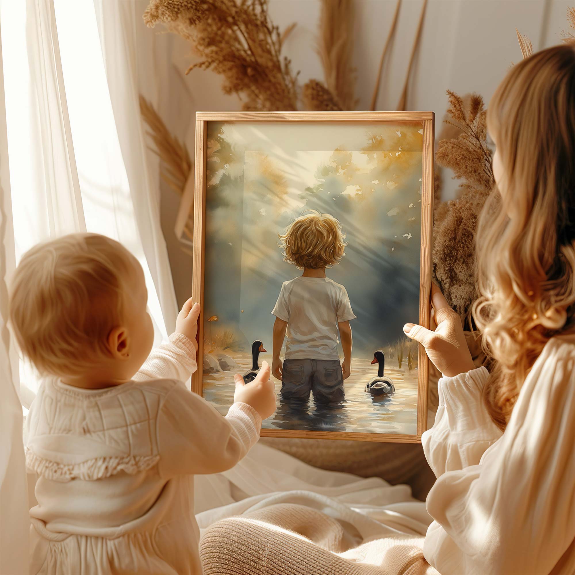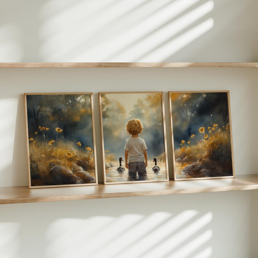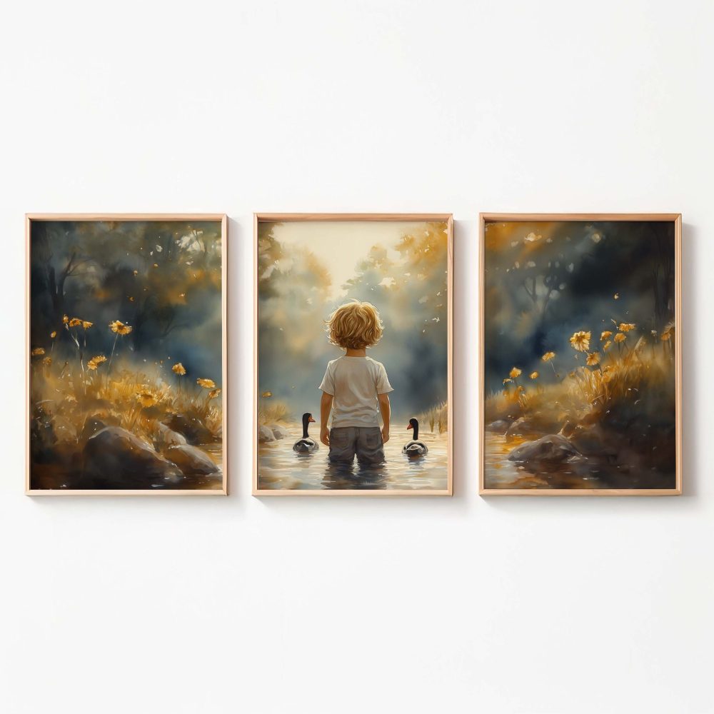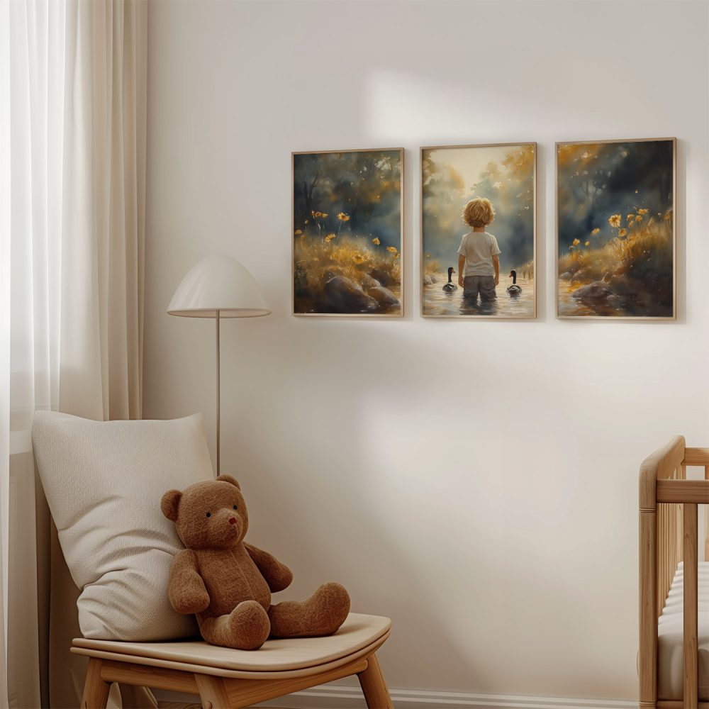 Terug naar collectie / Kinderkamer posters / Bloemen posters / Speels Jongetje met Eenden in Kleurrijk Waterlandschap