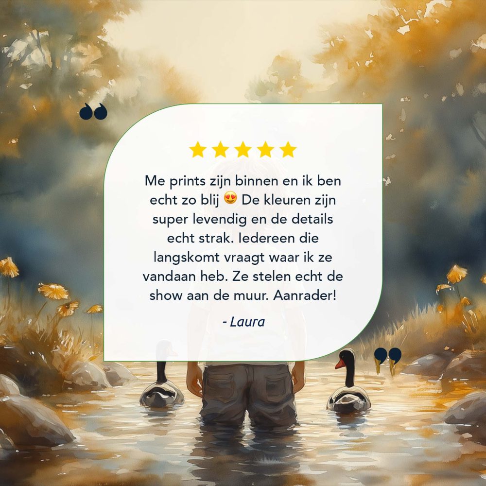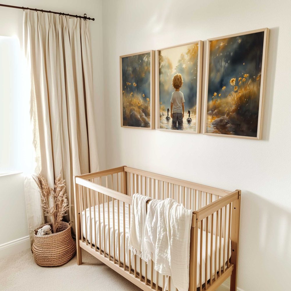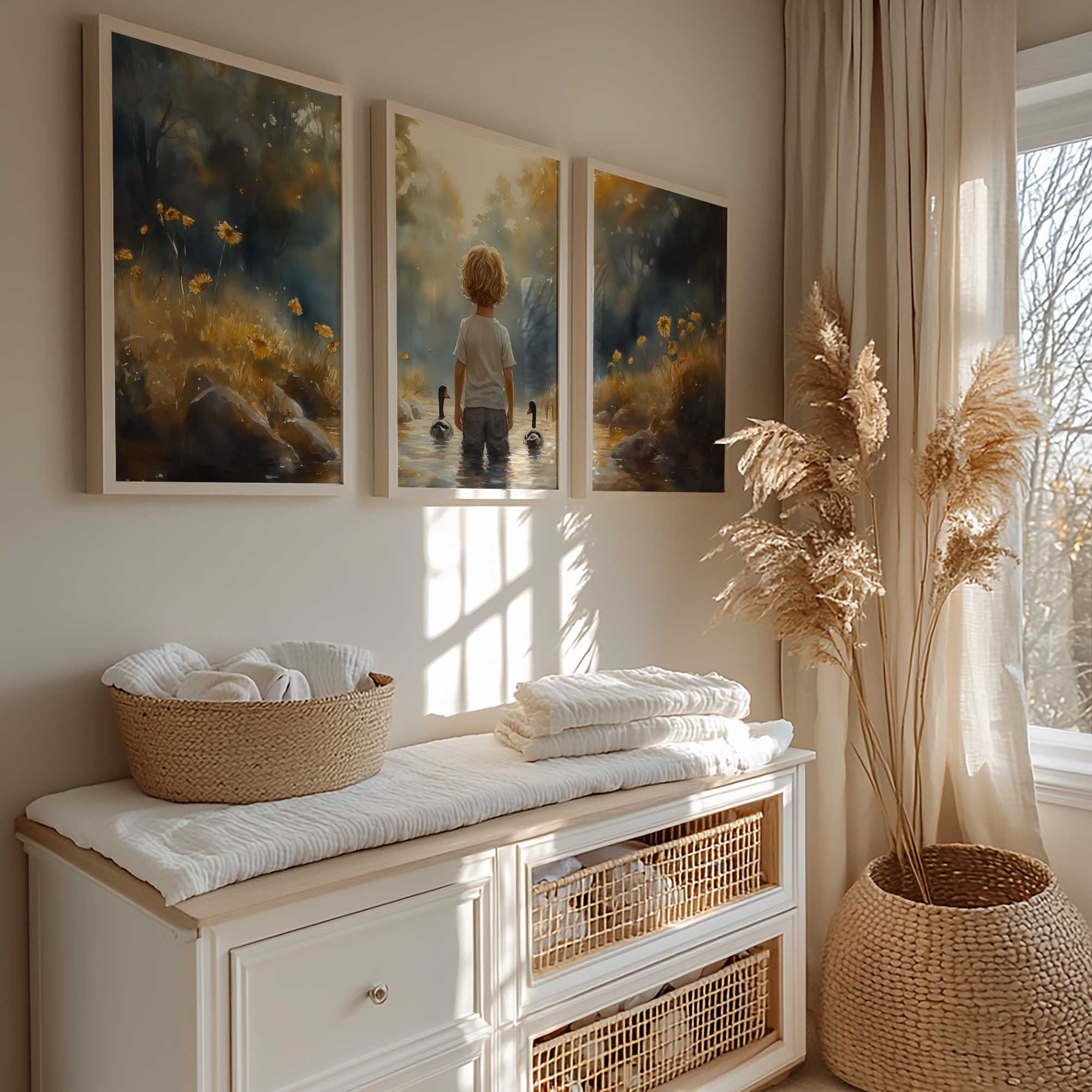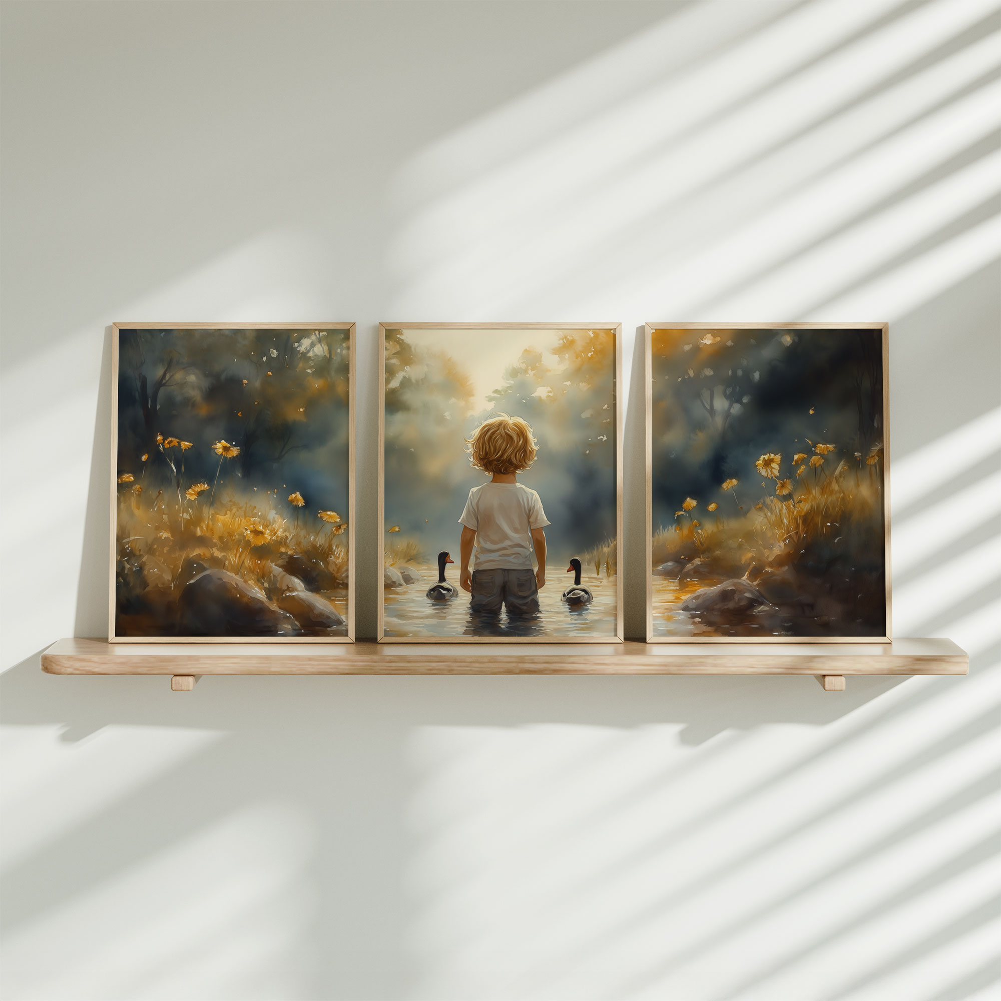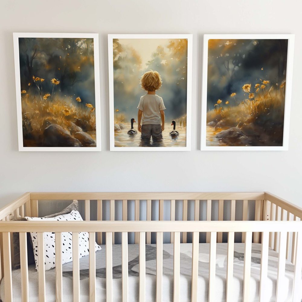 Terug naar collectie / Kinderkamer posters / Bloemen posters / Speels Jongetje met Eenden in Kleurrijk Waterlandschap