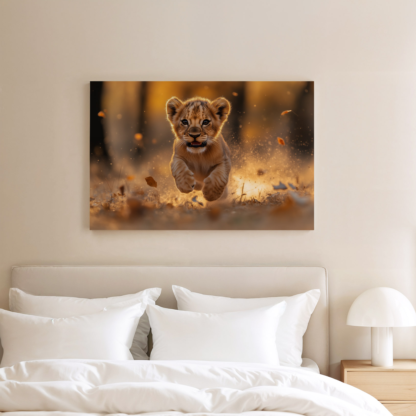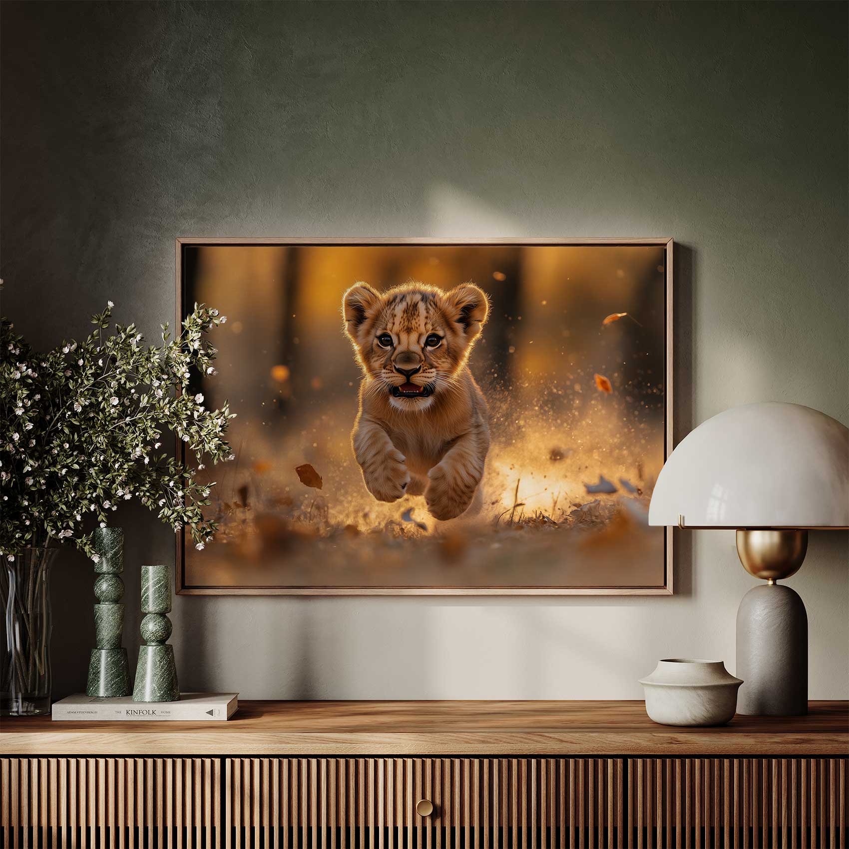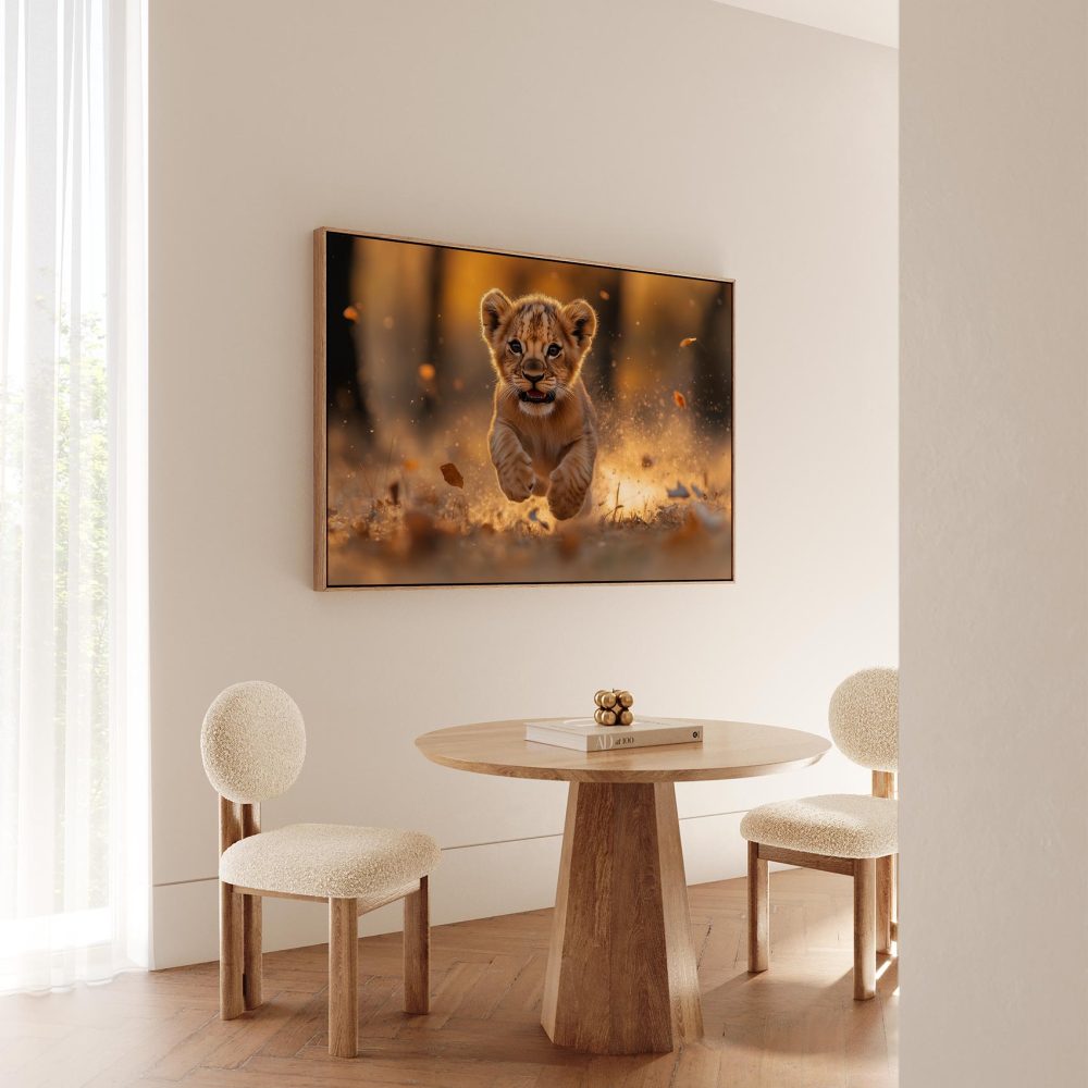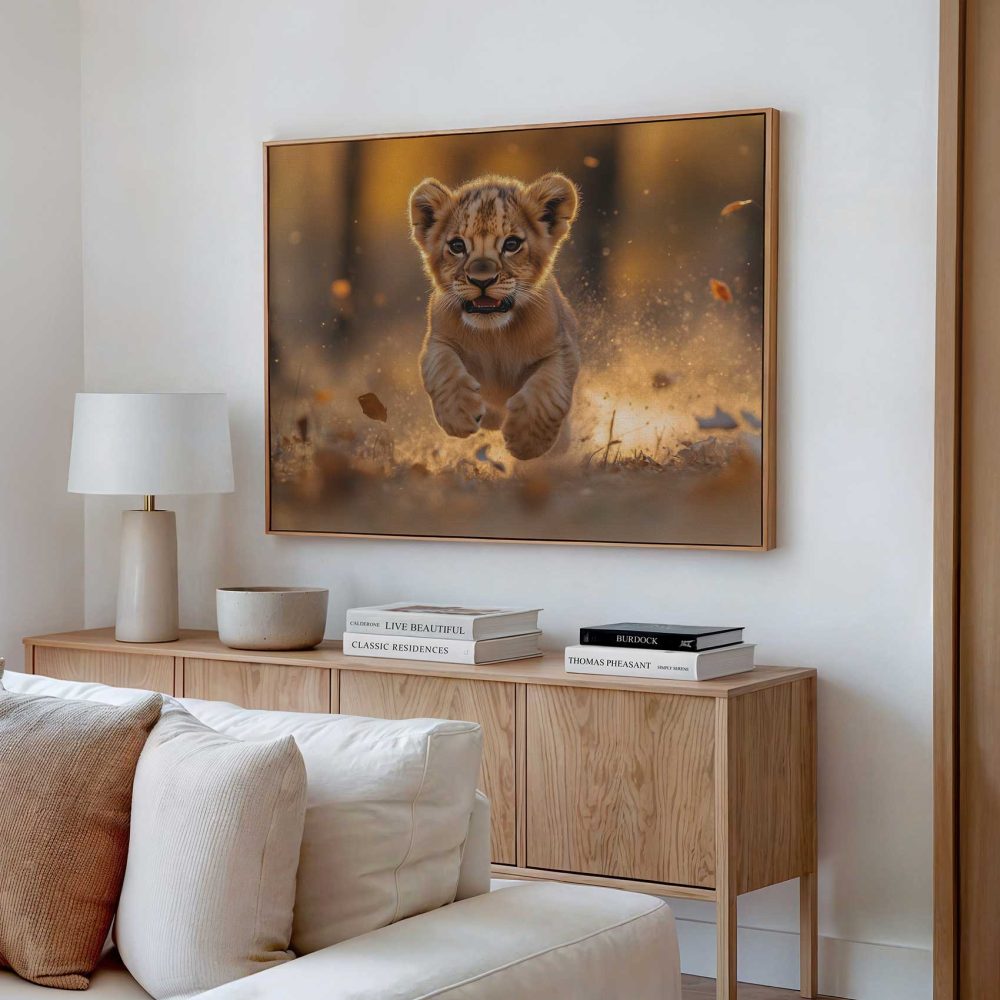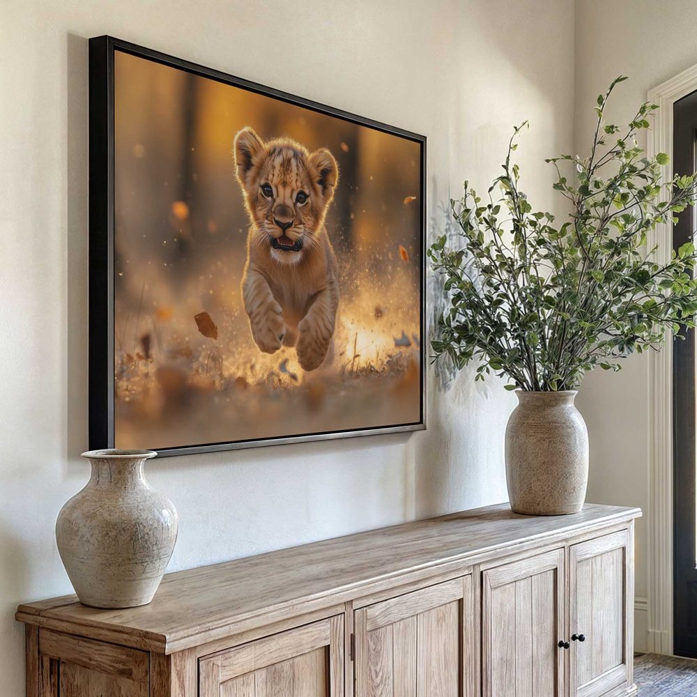 Terug naar collectie / Schilderijen / Dieren Schilderij / Speels leeuwenwelp in zonlicht