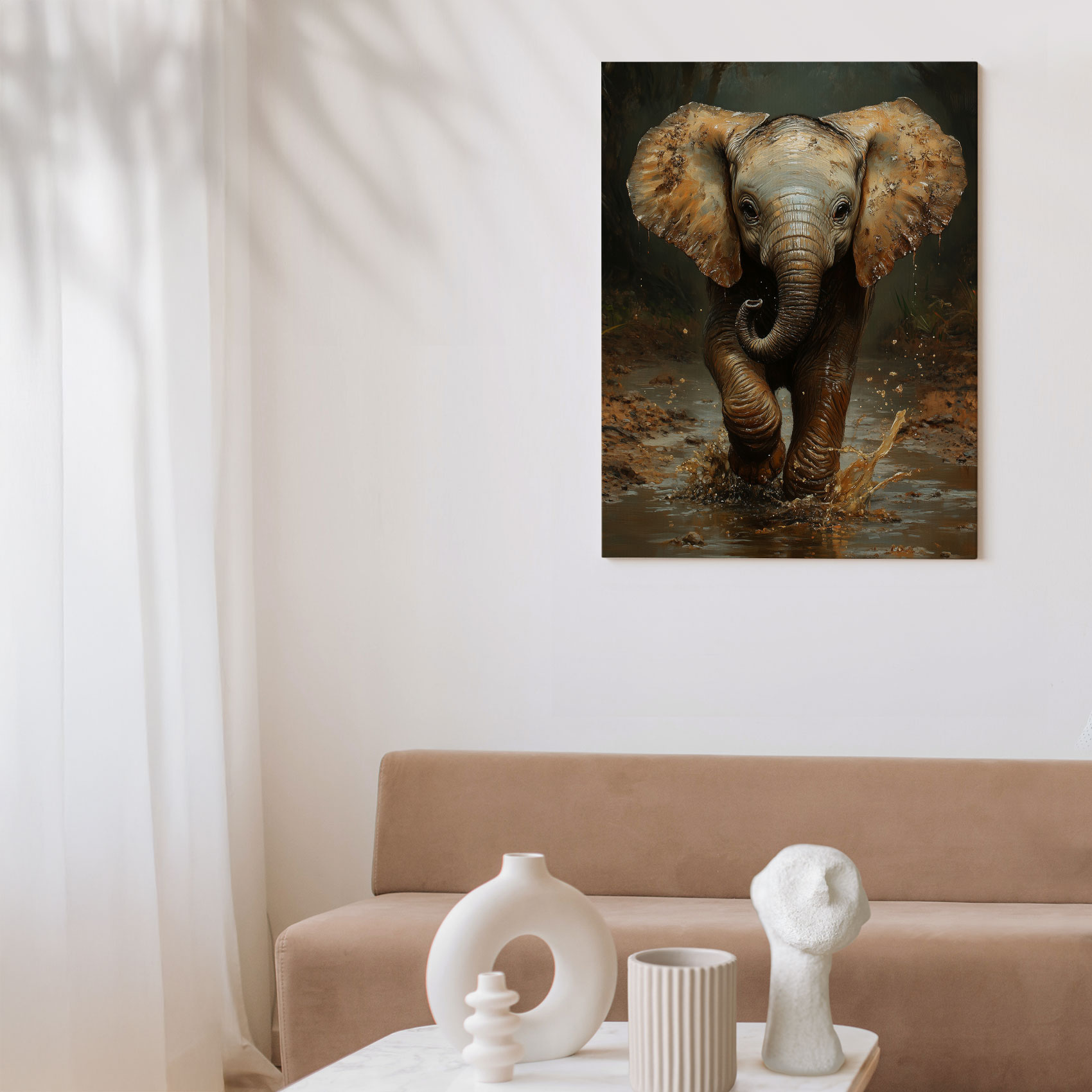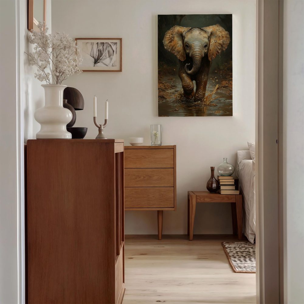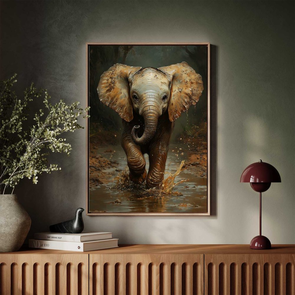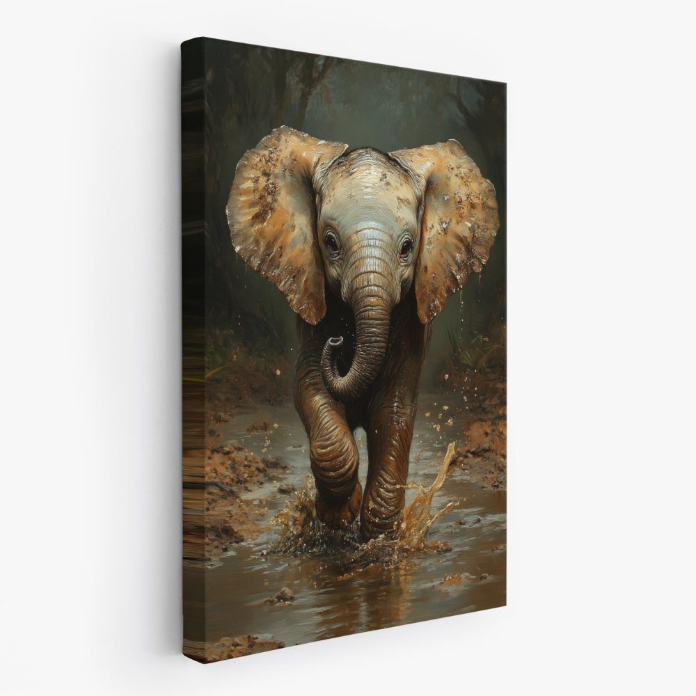 Terug naar collectie / Schilderijen / Bloemen Schilderij / Speels olifantje in modderpoel