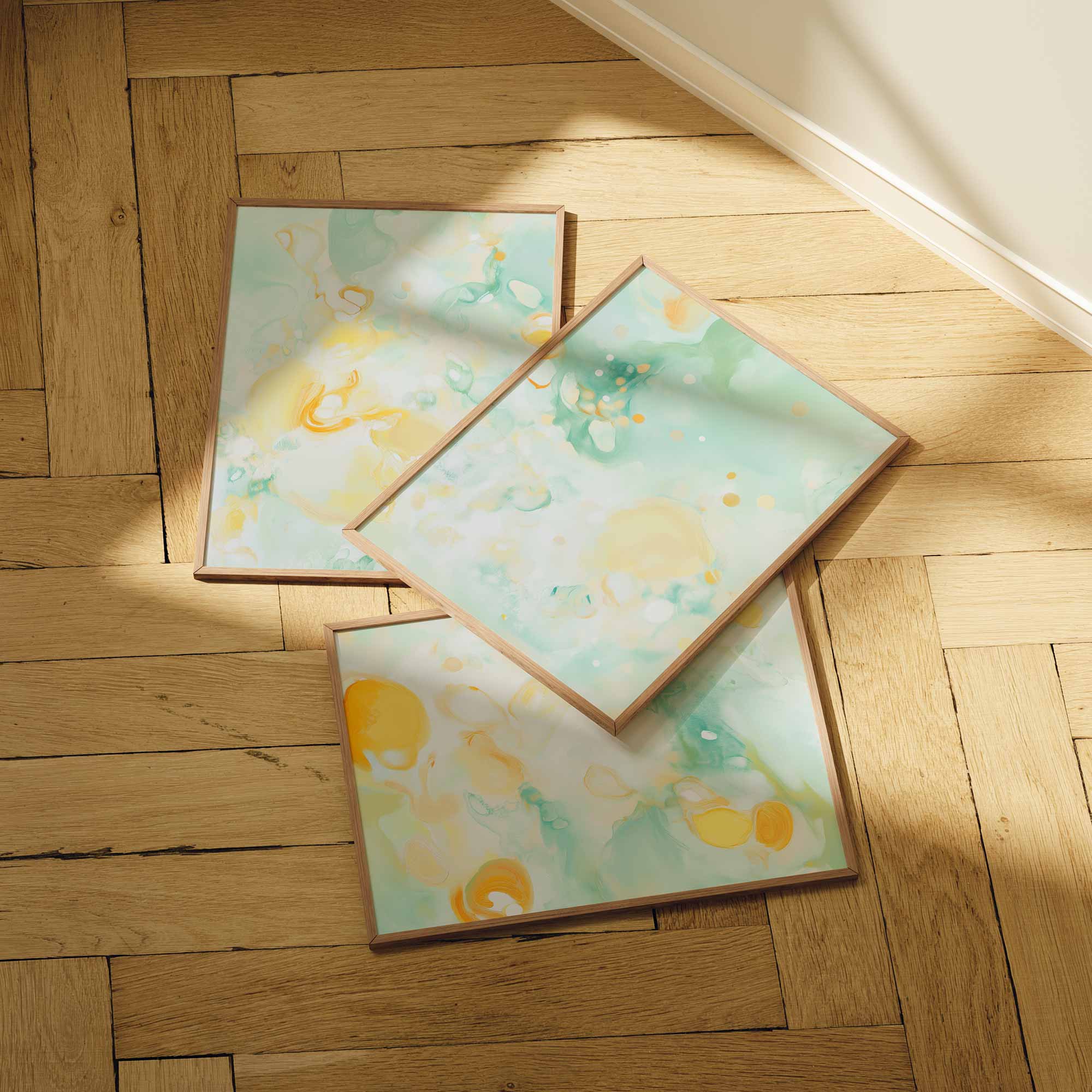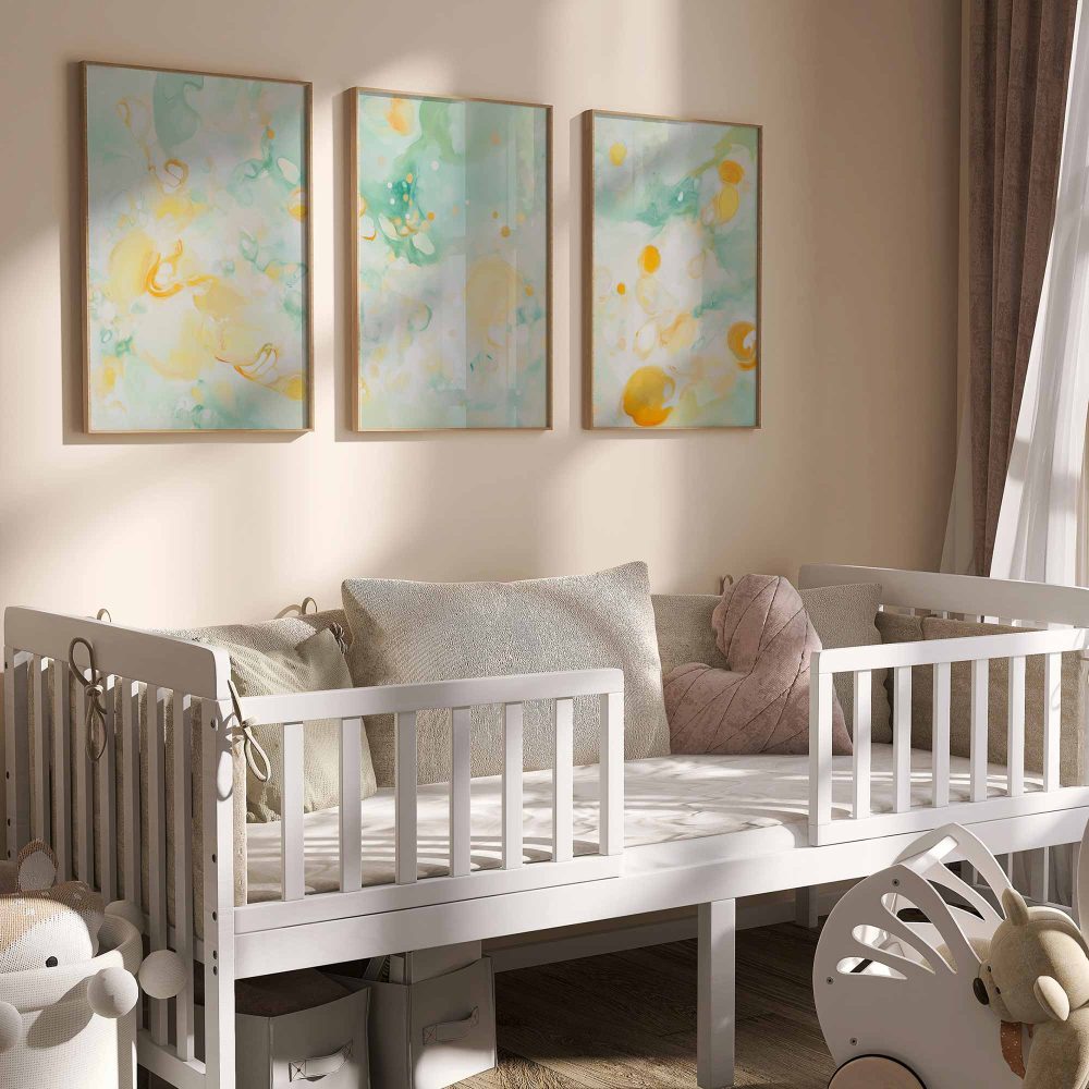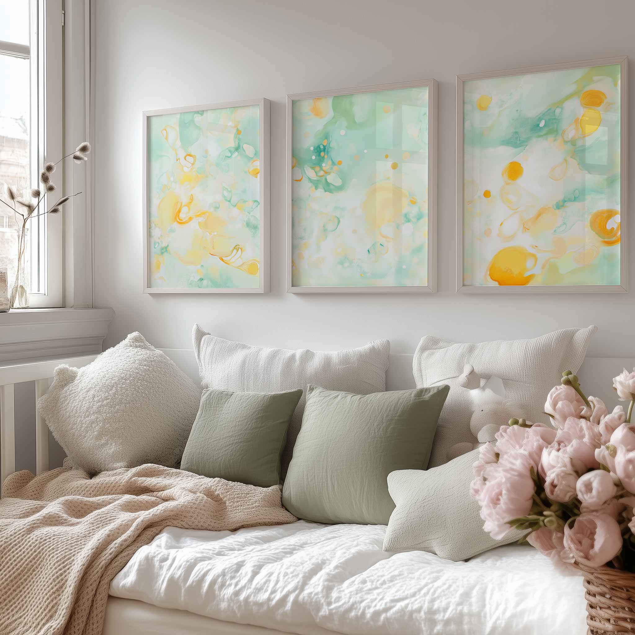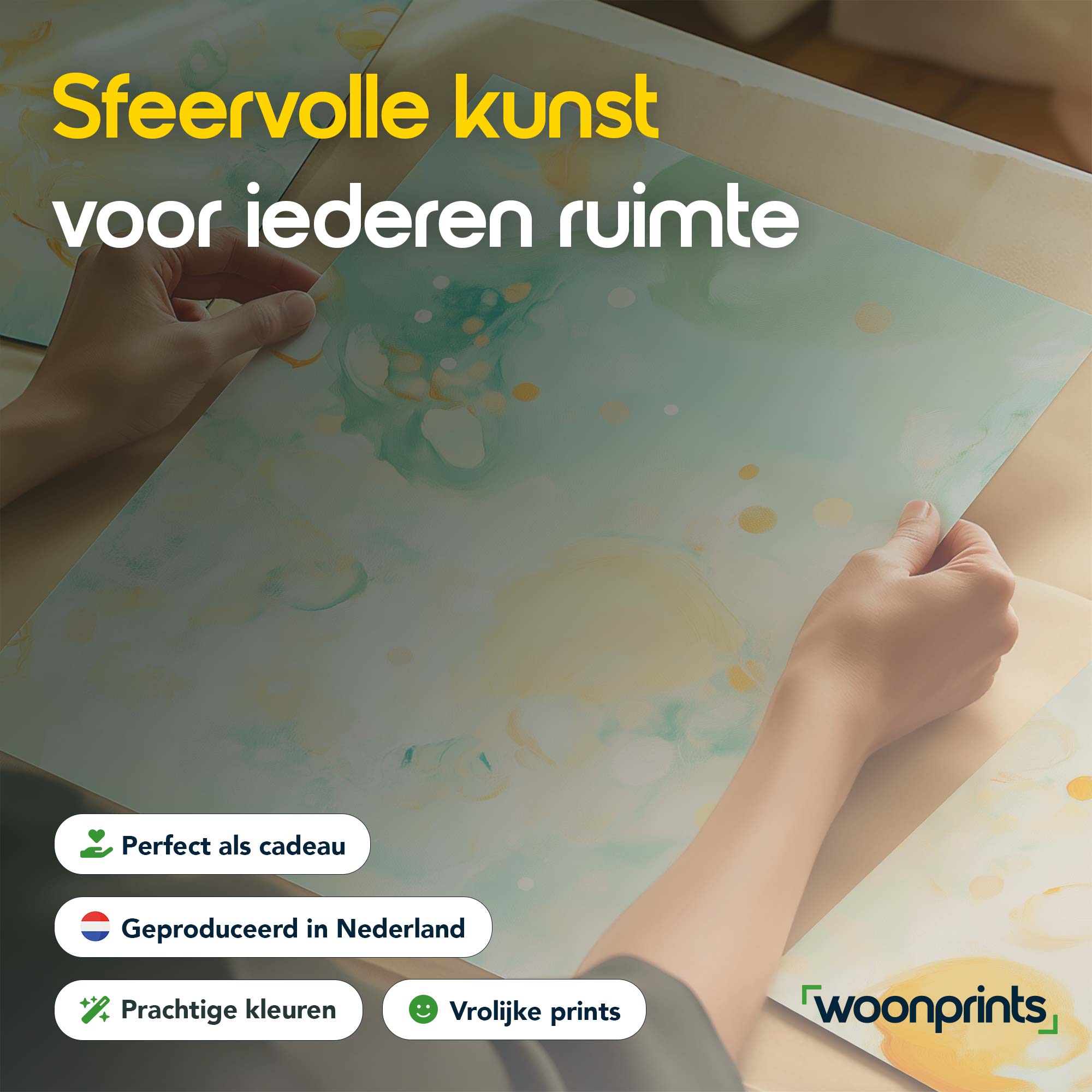 Terug naar collectie / Kinderkamer posters / Speelse Abstracte Dans in Zacht Geel en Fris Groen