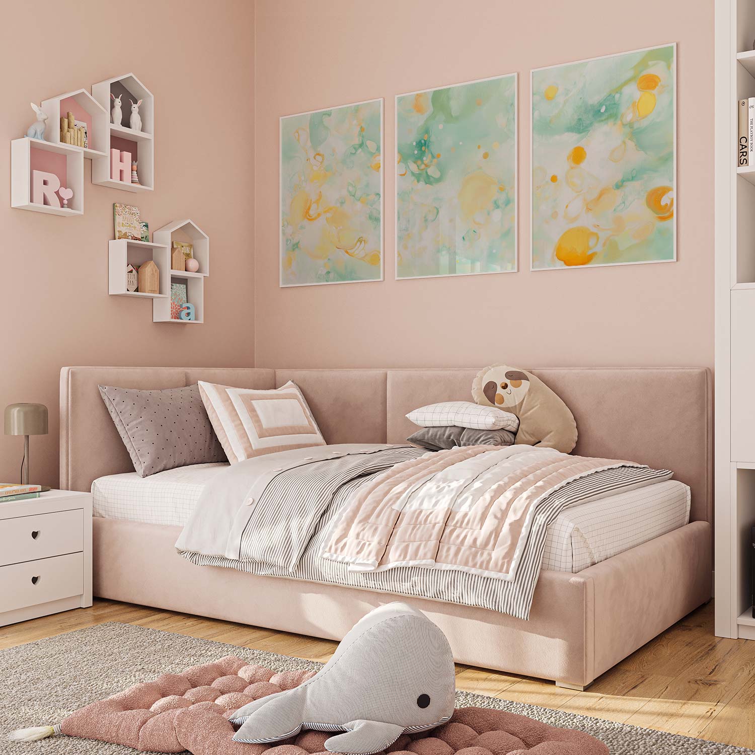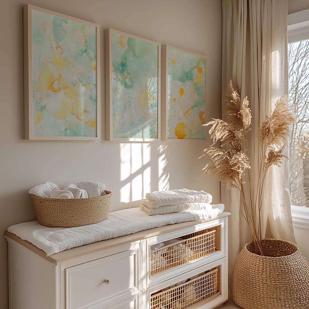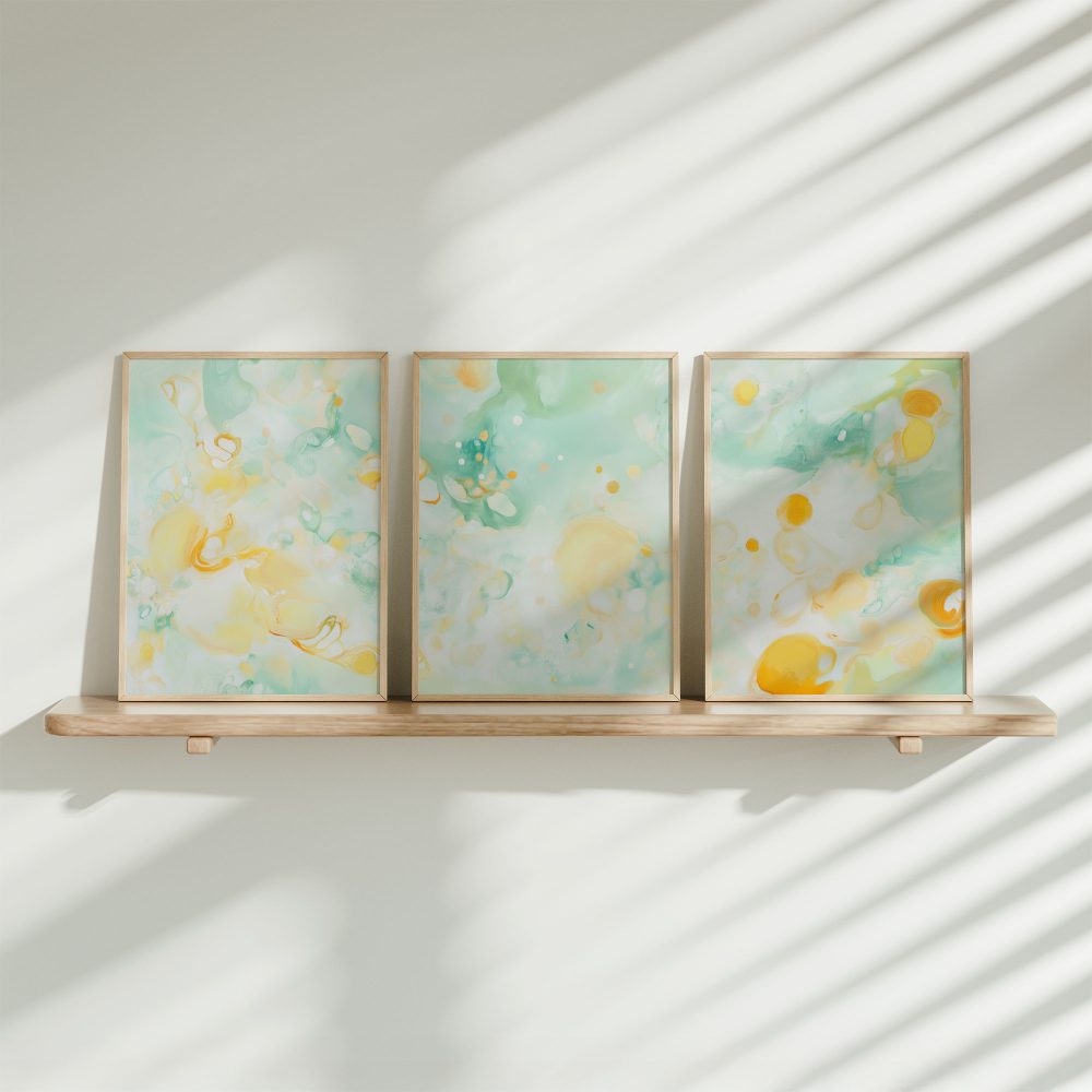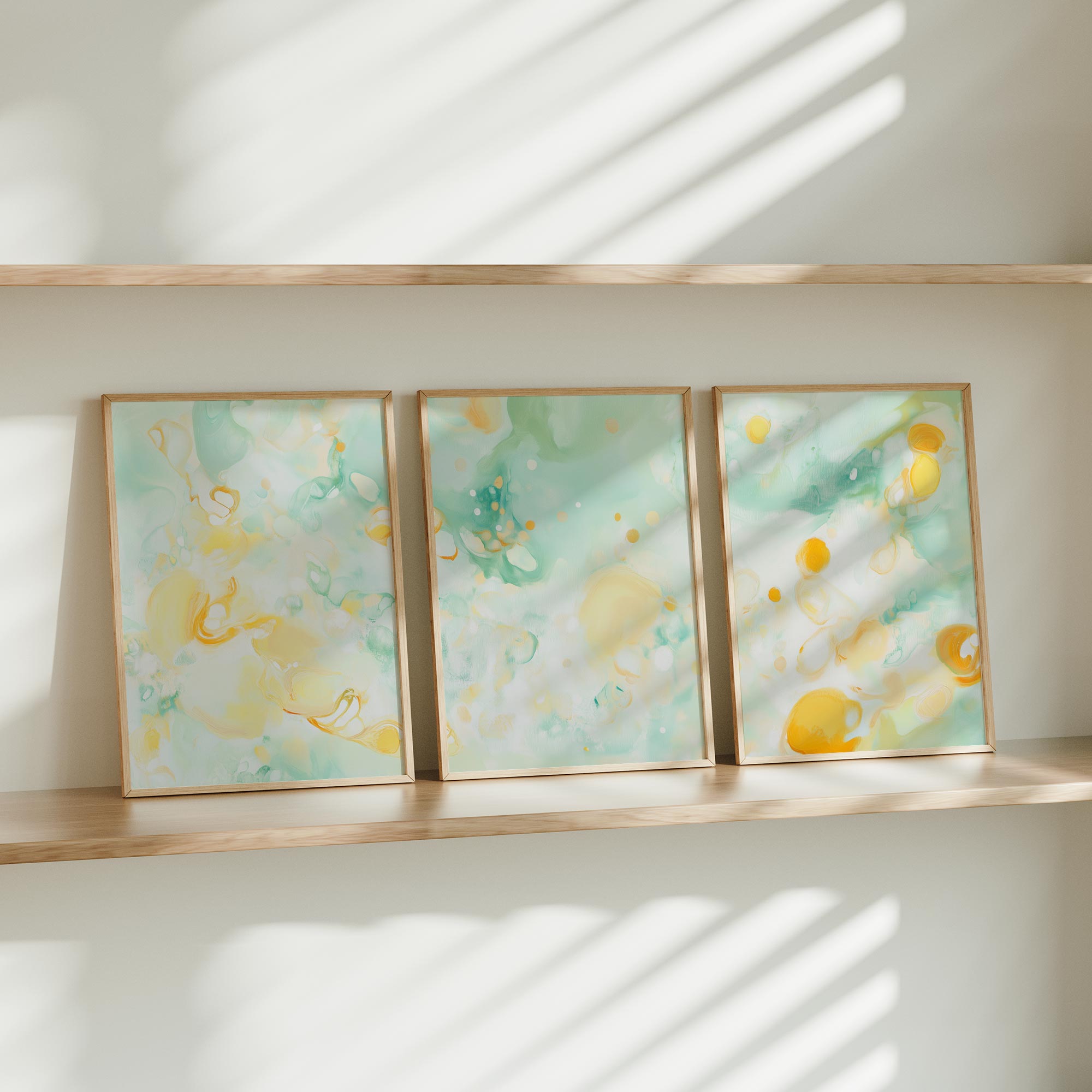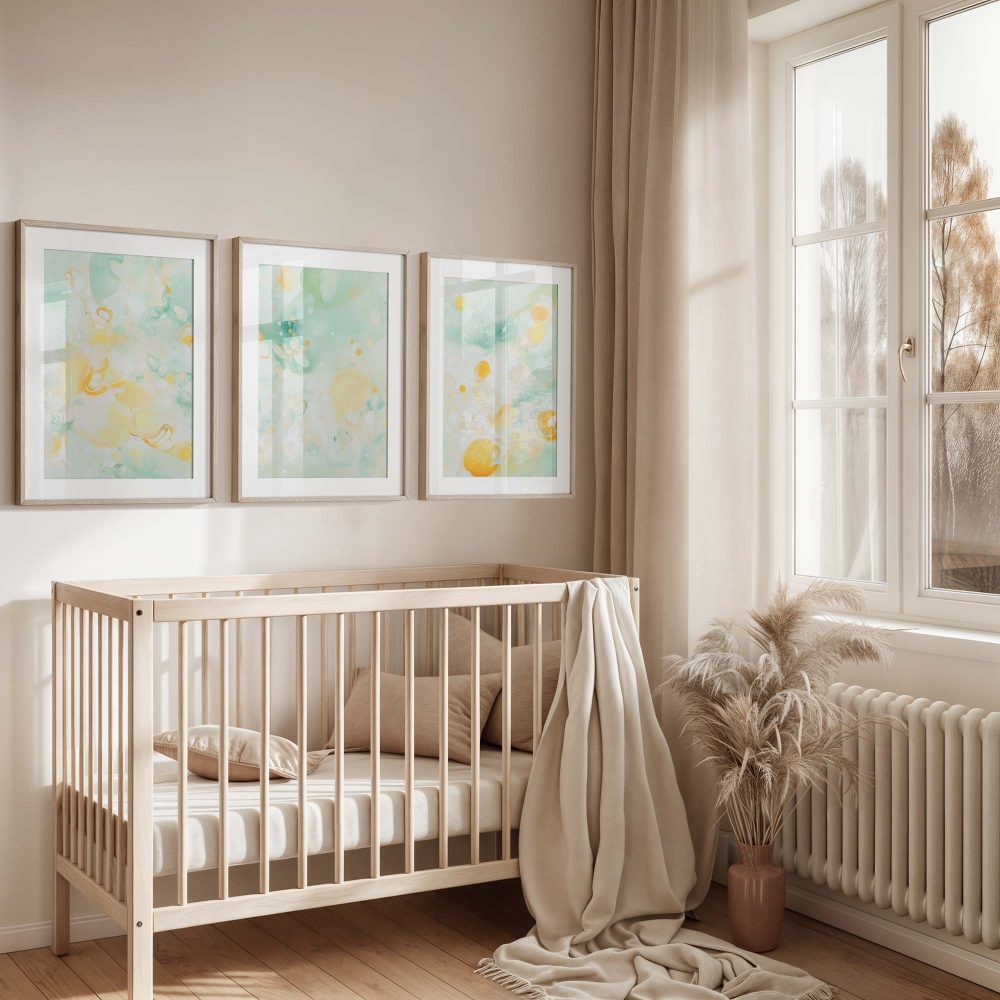 Terug naar collectie / Kinderkamer posters / Speelse Abstracte Dans in Zacht Geel en Fris Groen