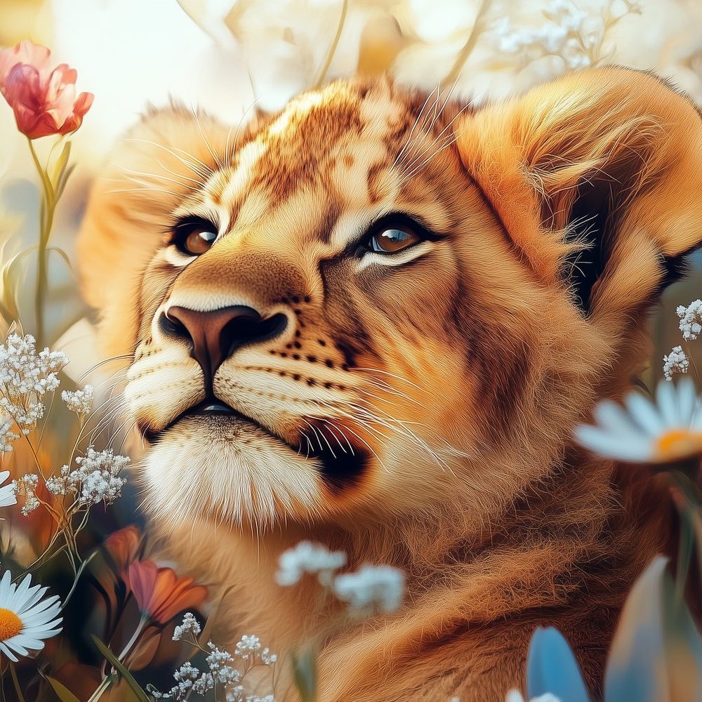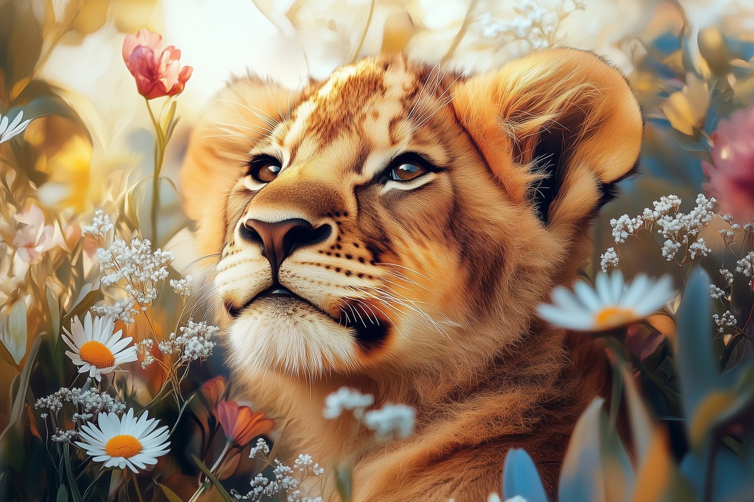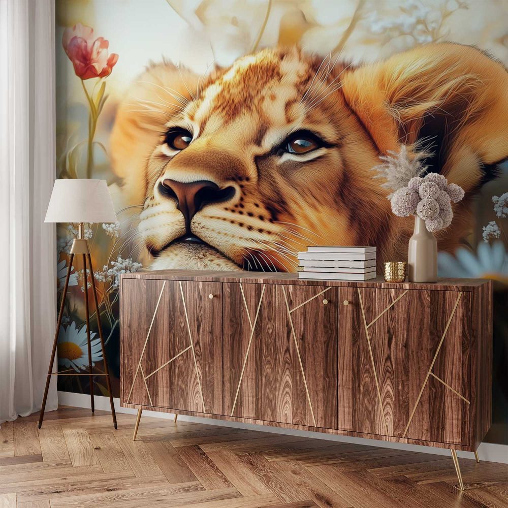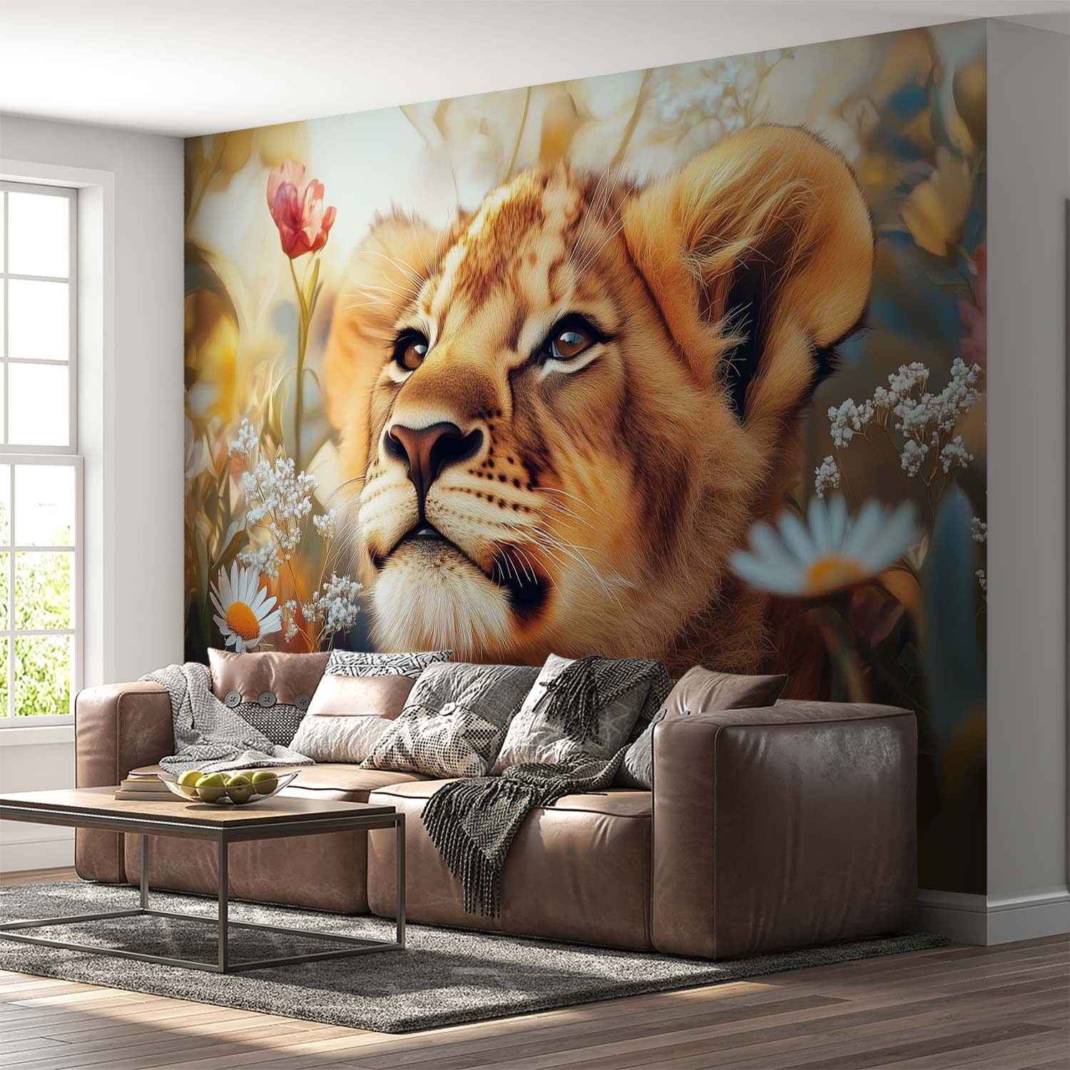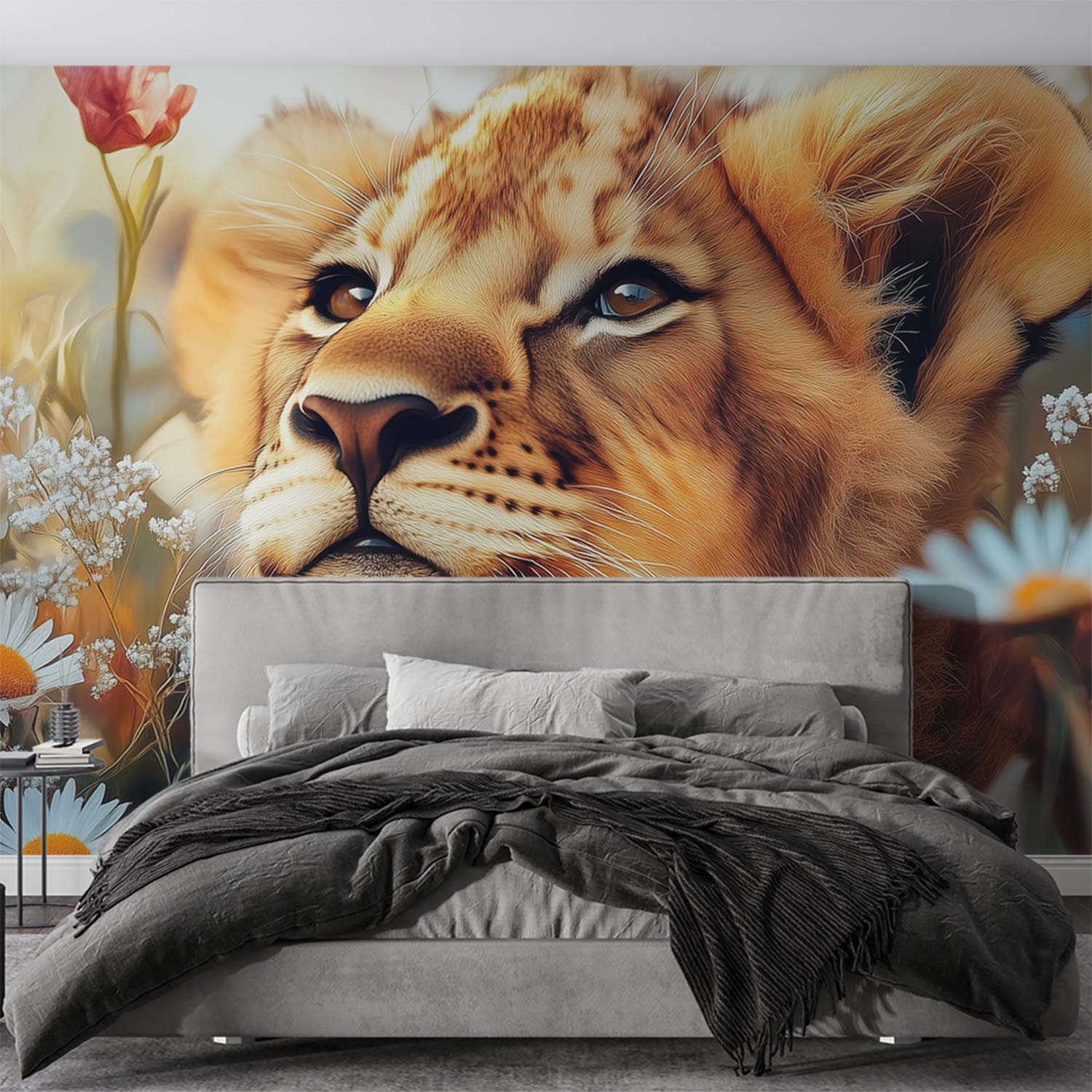 Terug naar collectie / Behang / Speelse leeuwenwelp in bloemenveld behang