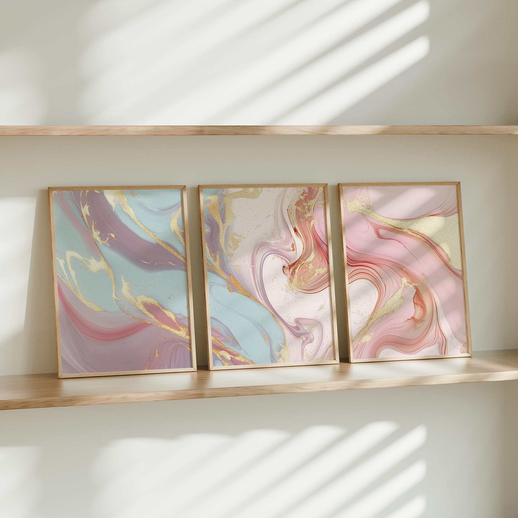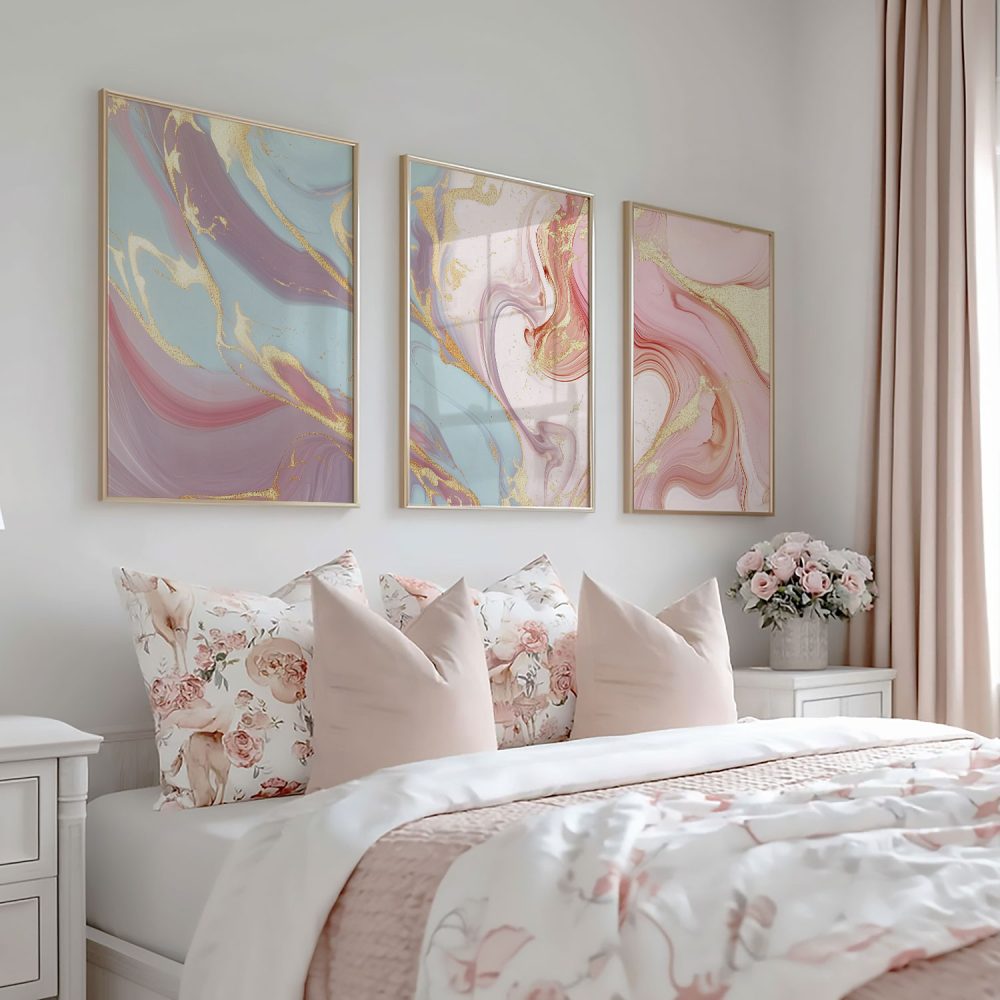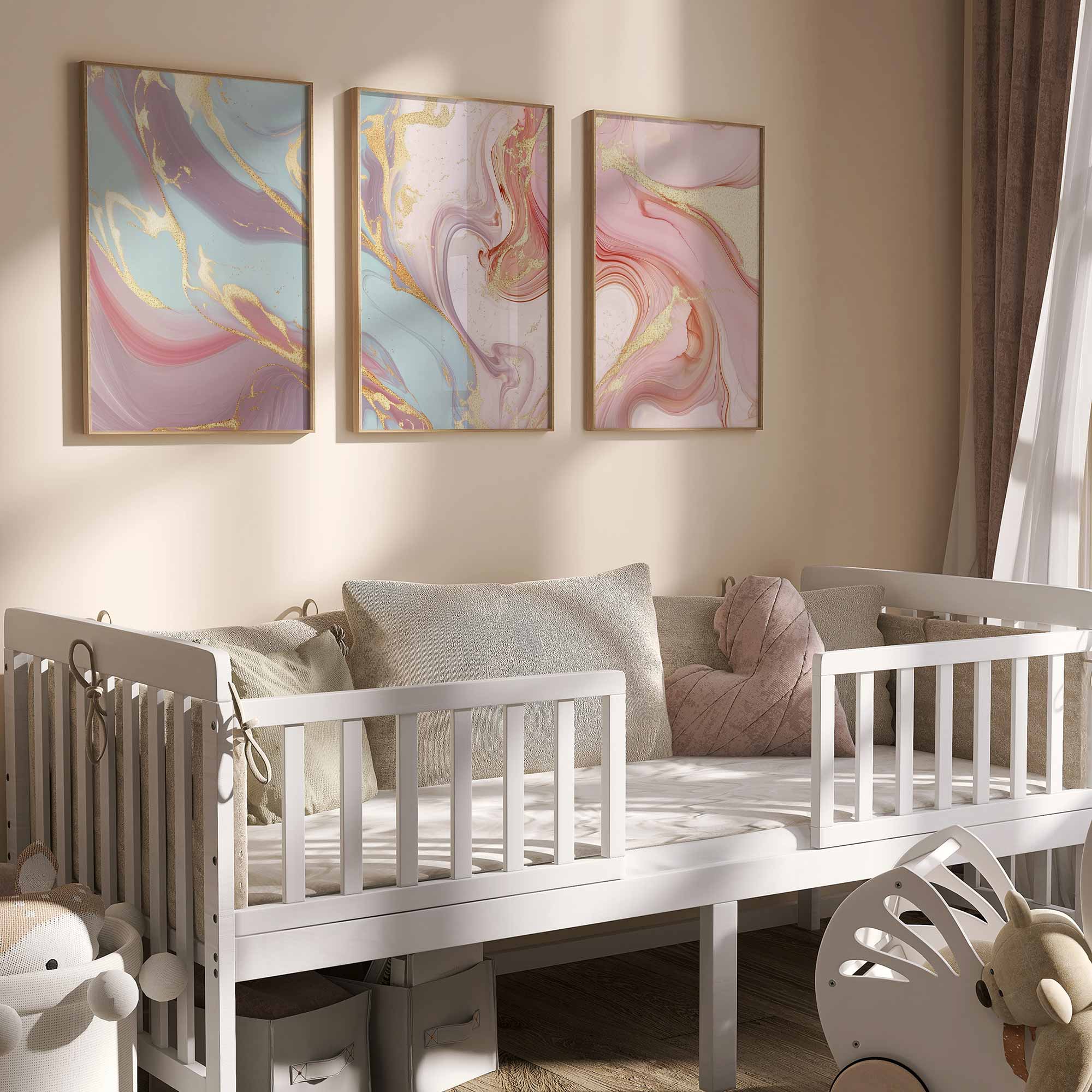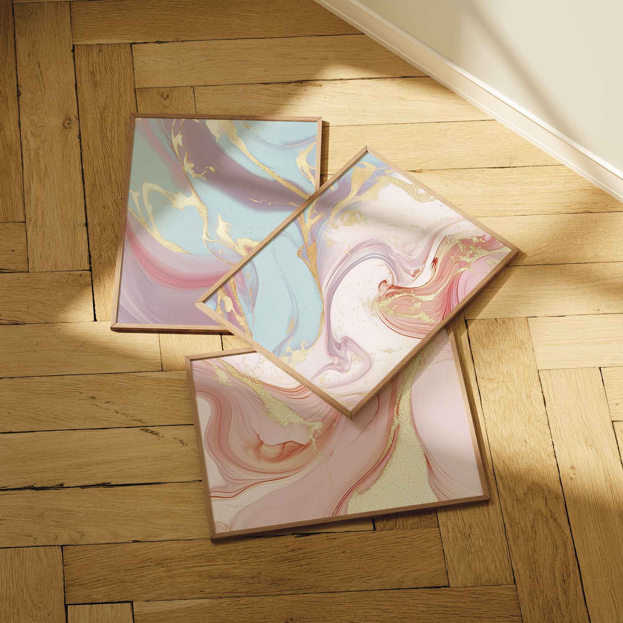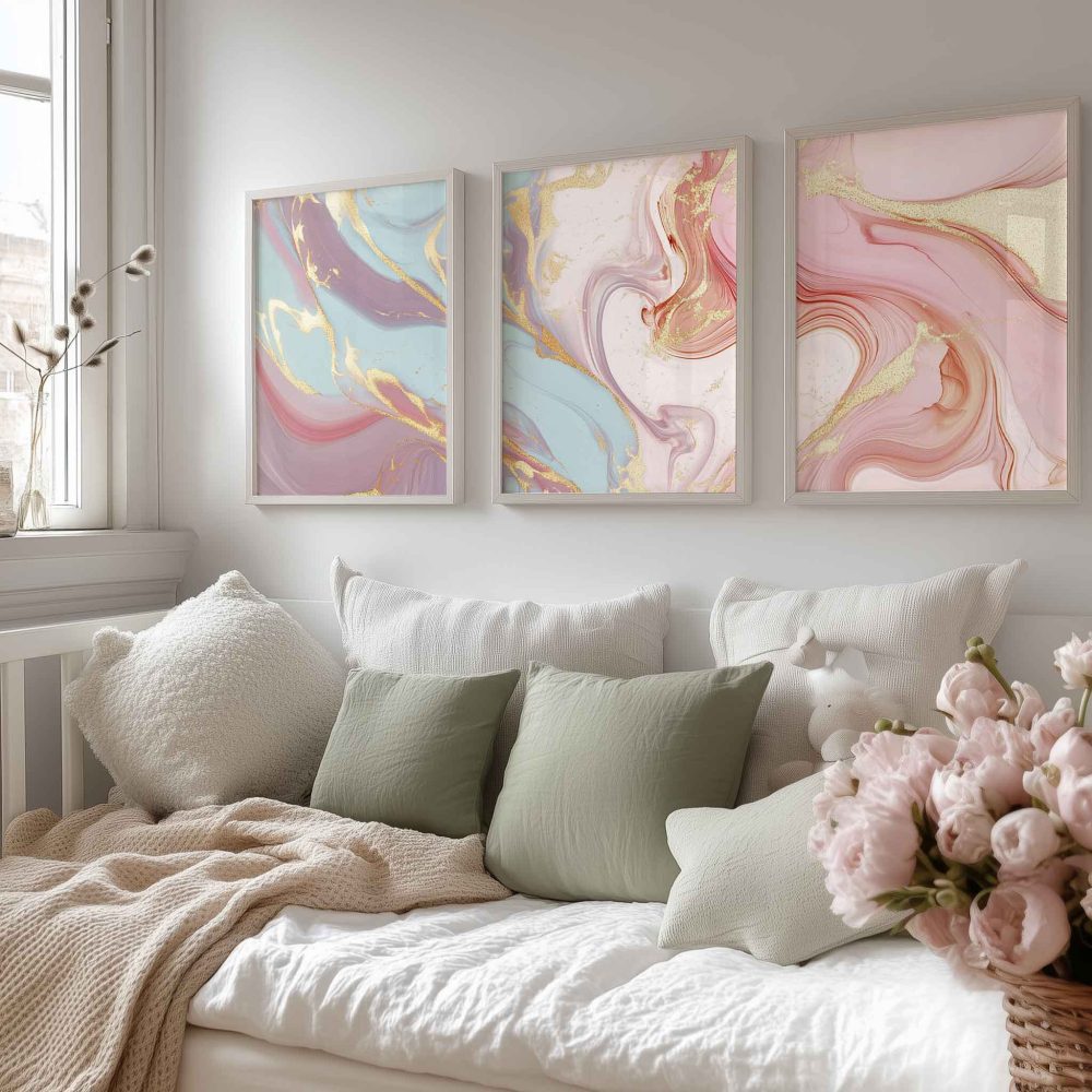 Terug naar collectie / Kinderkamer posters / Speelse Marmeren Swirls in Roze, Blauw en Goud