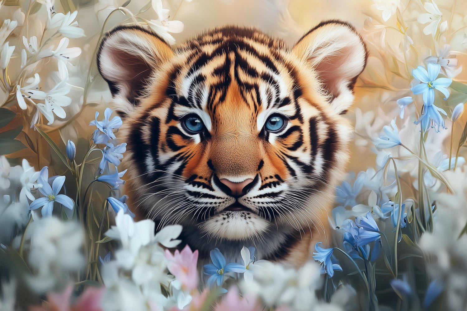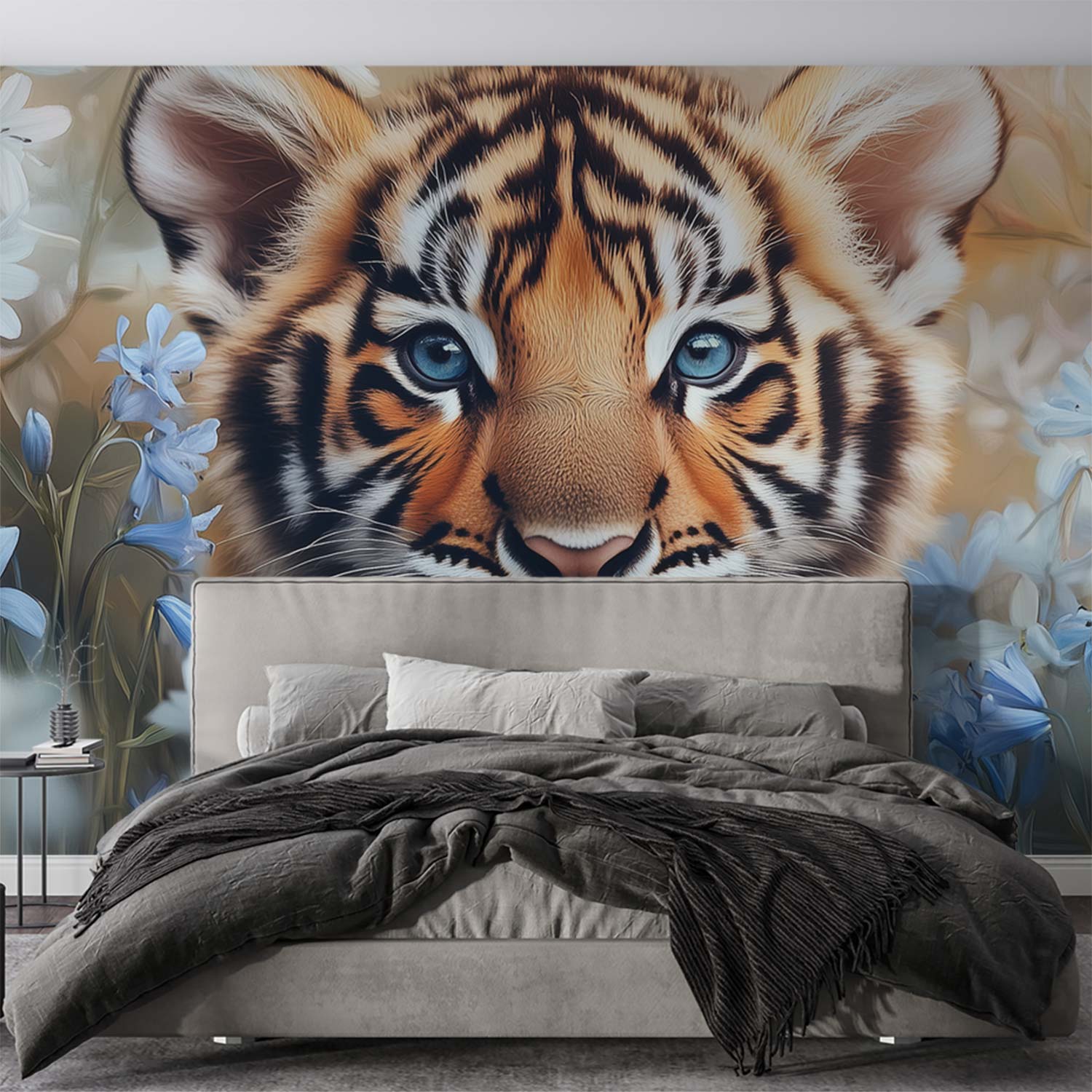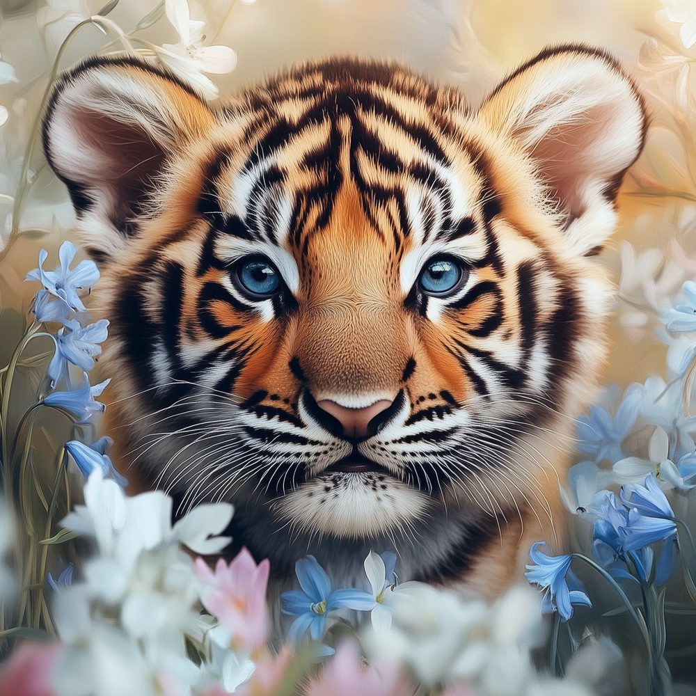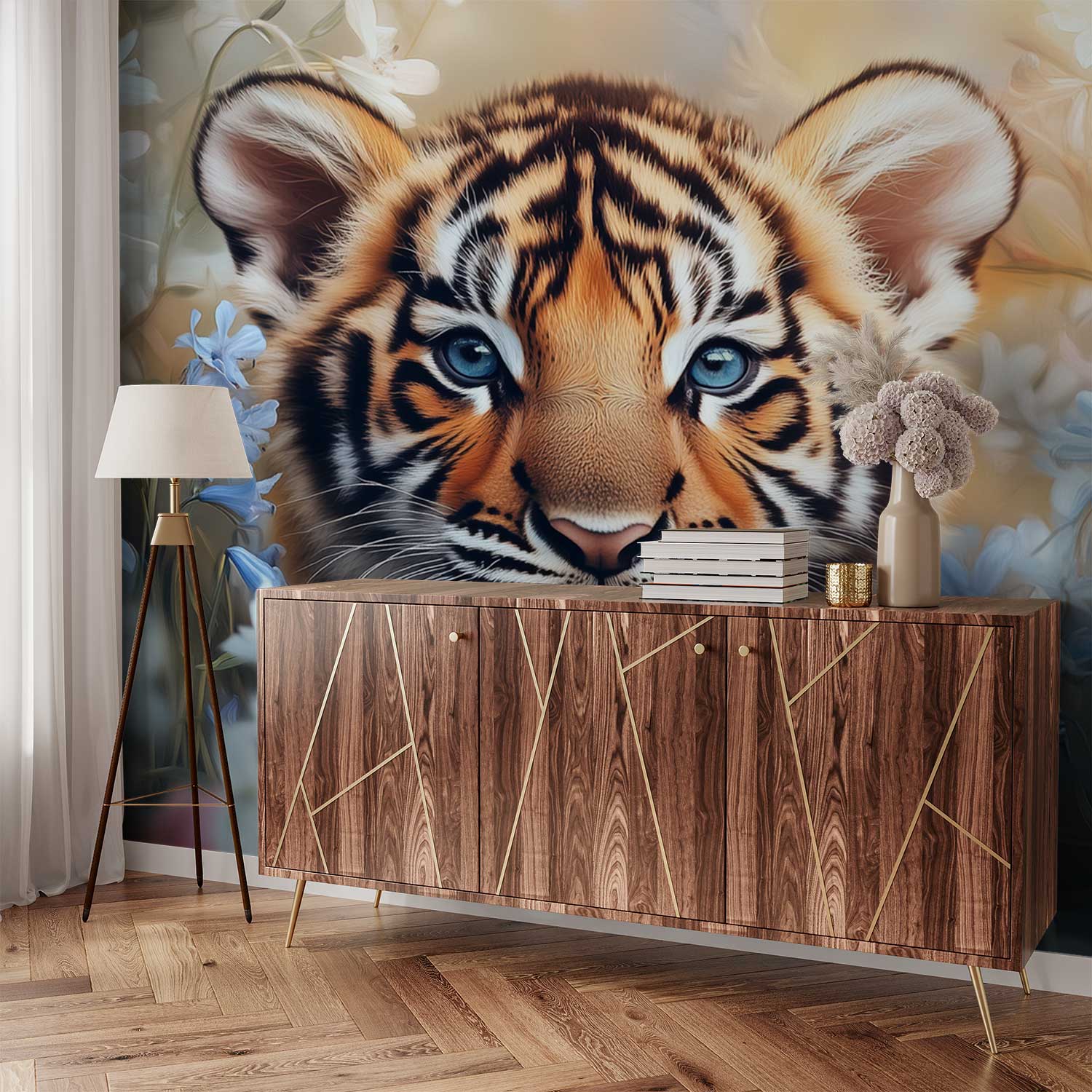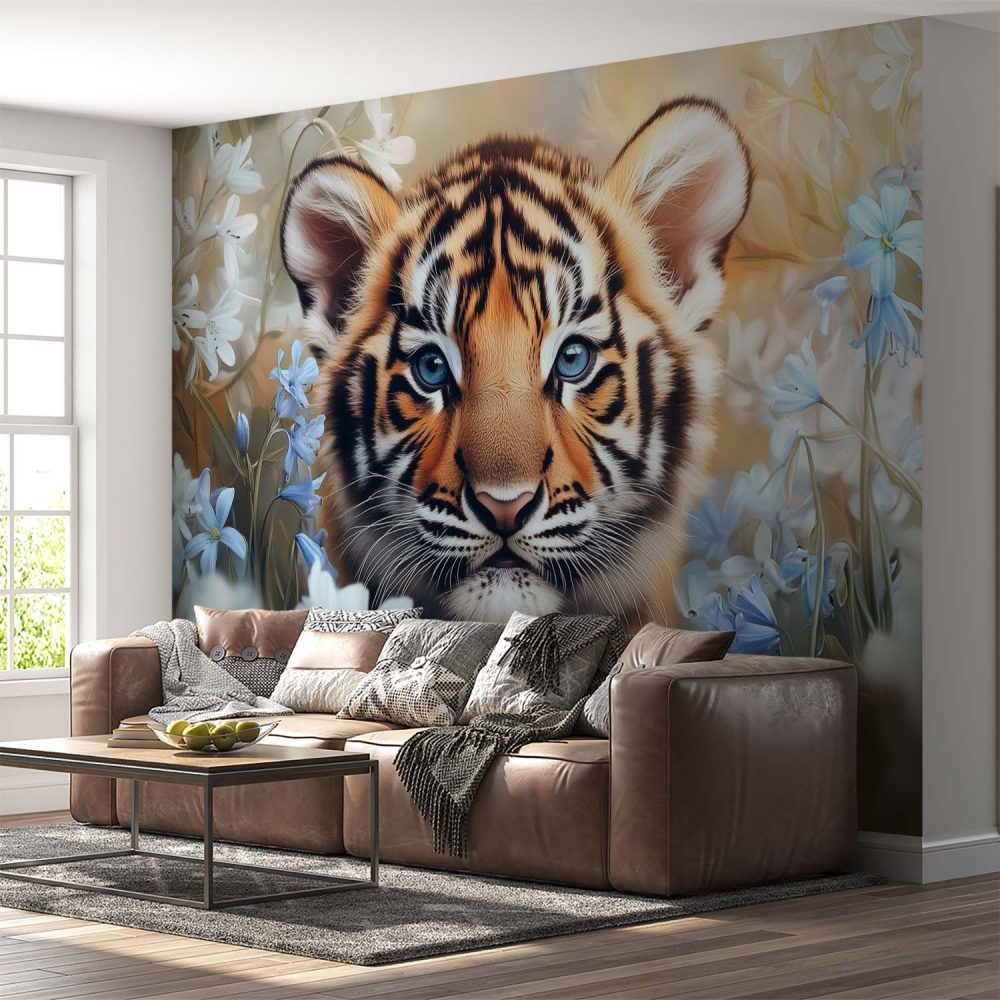 Speelse tijgerwelp in bloemen behang