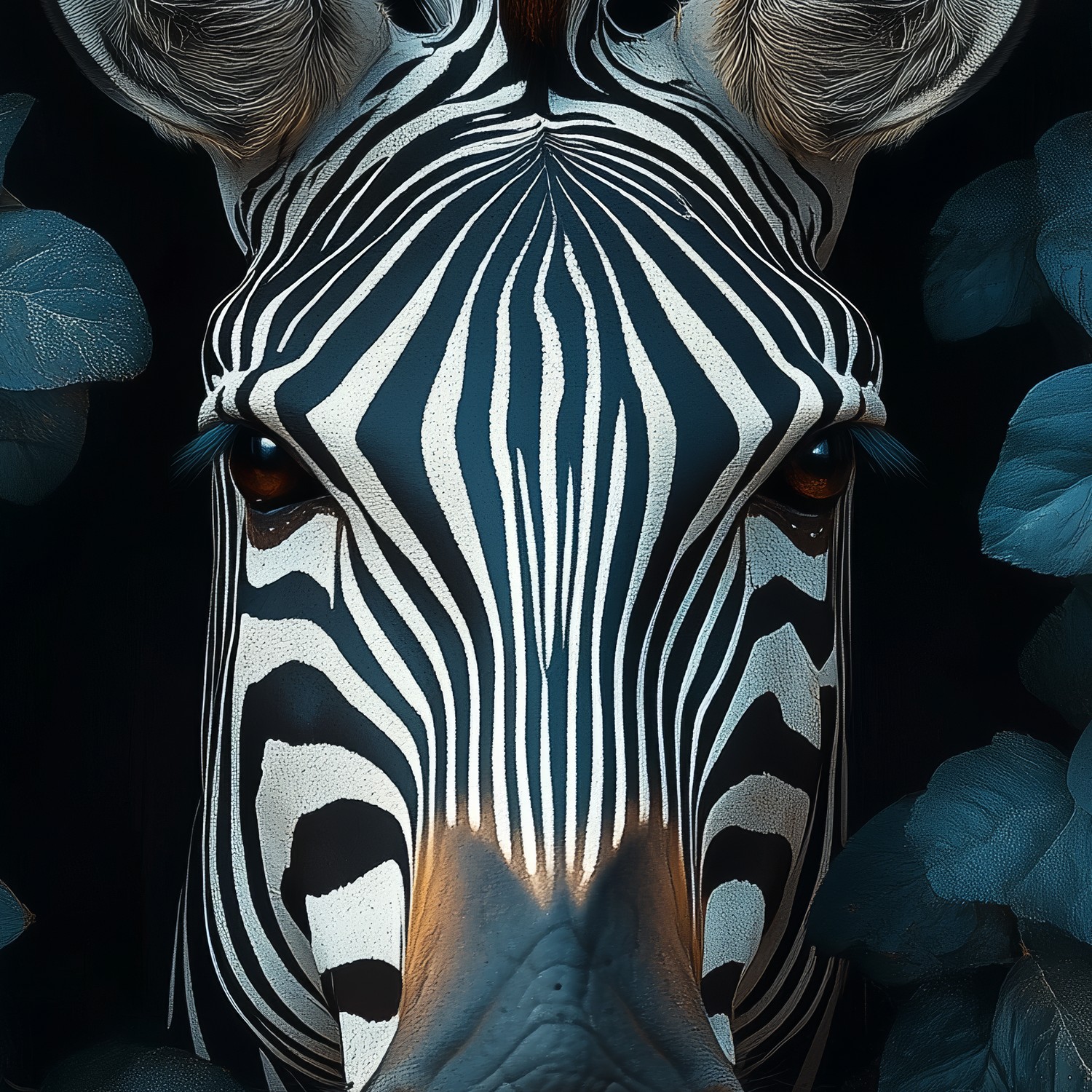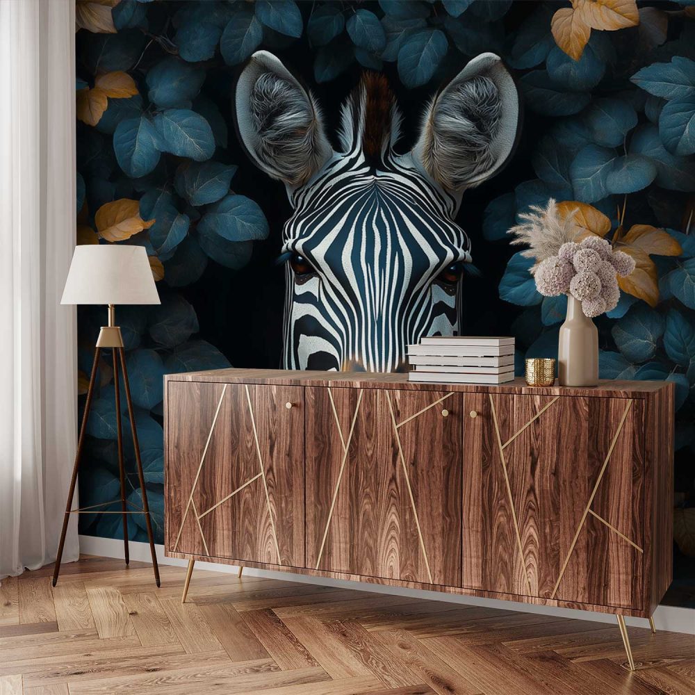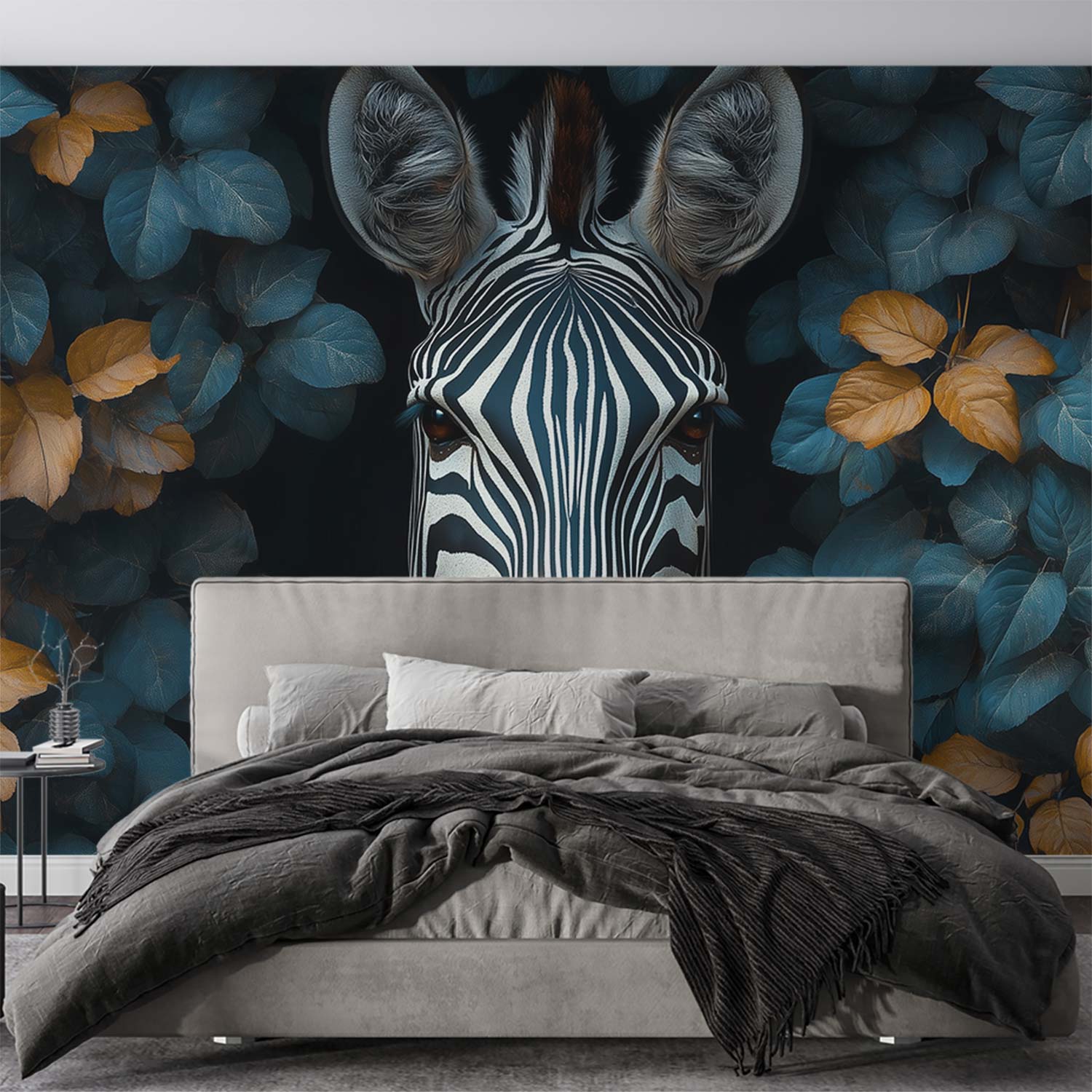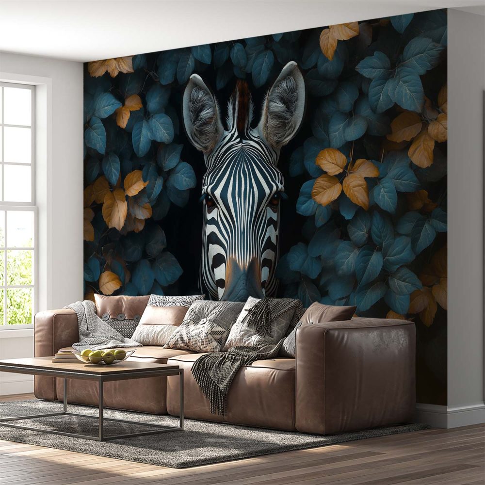 Terug naar collectie / Behang / Speelse zebra tussen kleurrijk blad behang