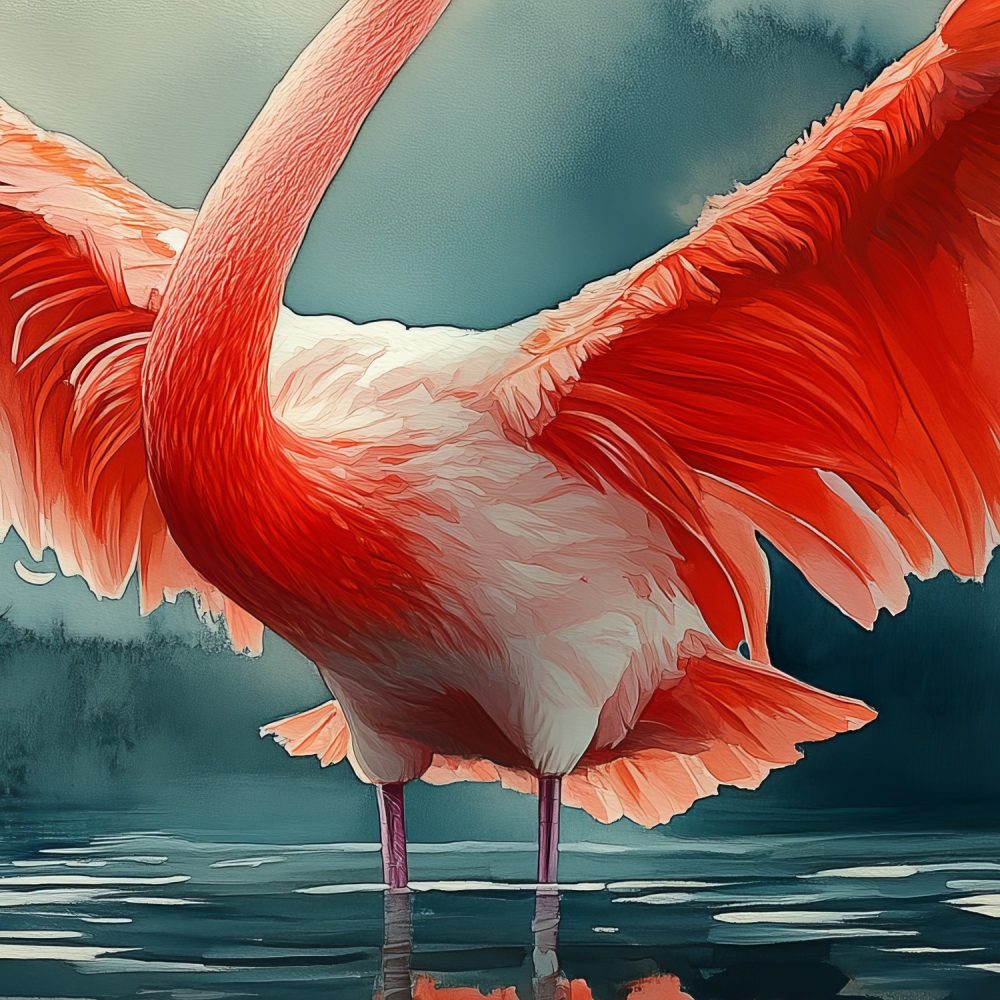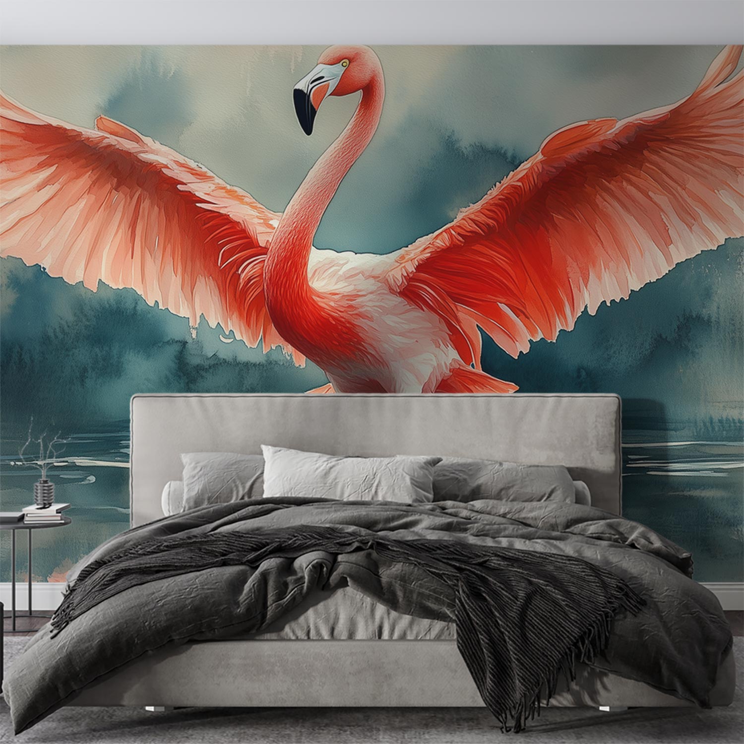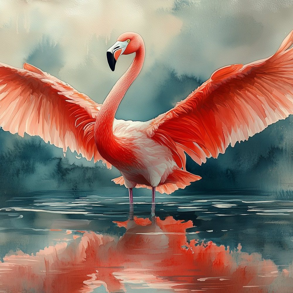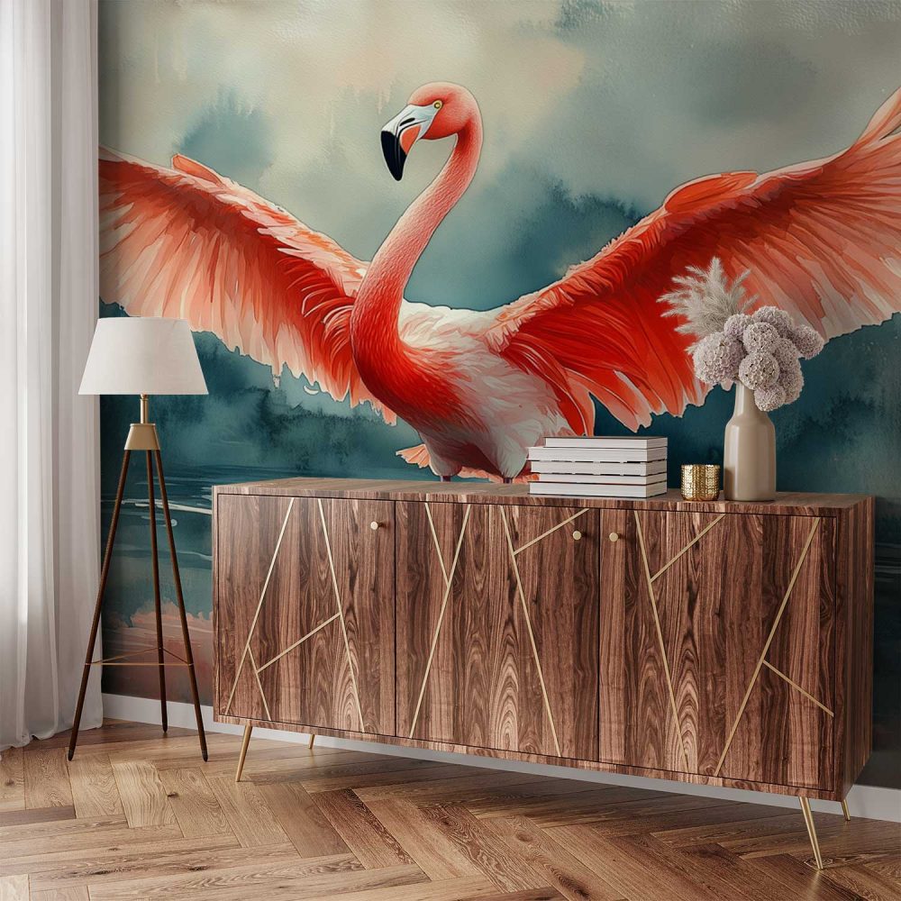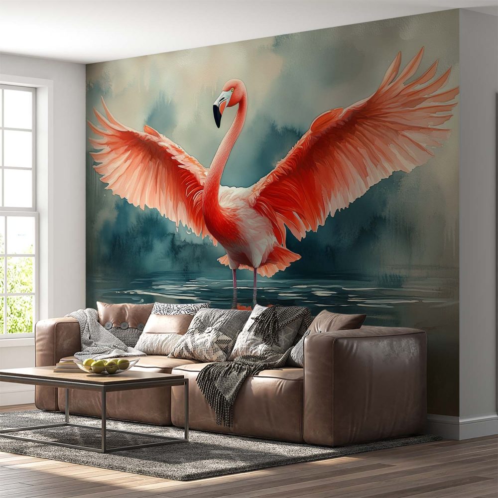 Spreidvleugelige flamingo in water behang