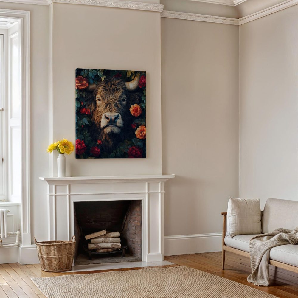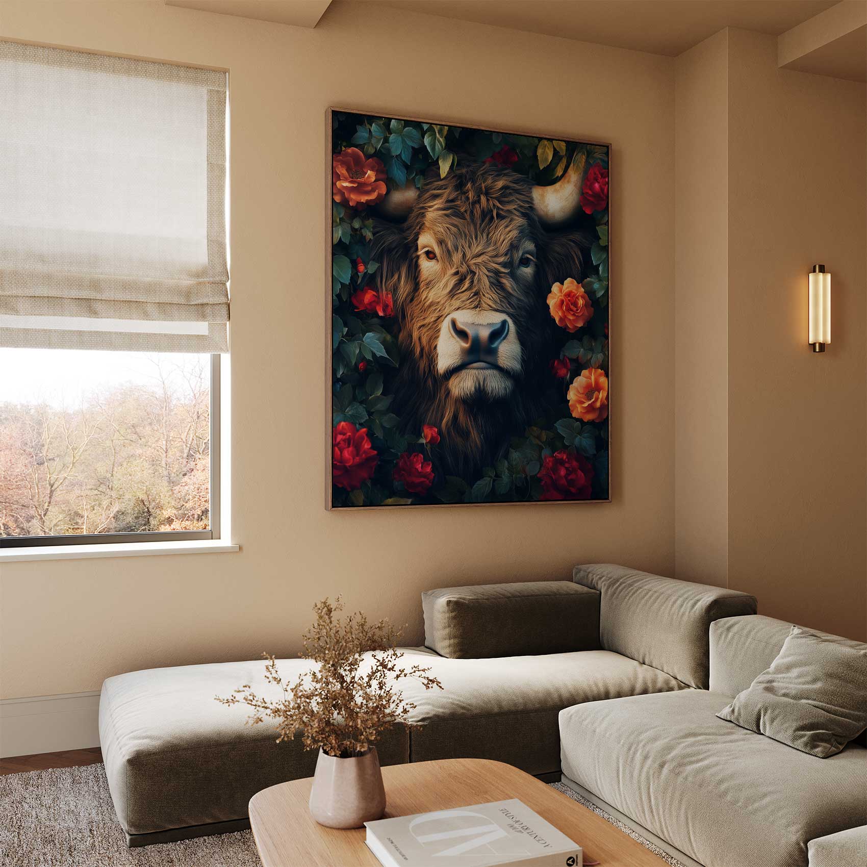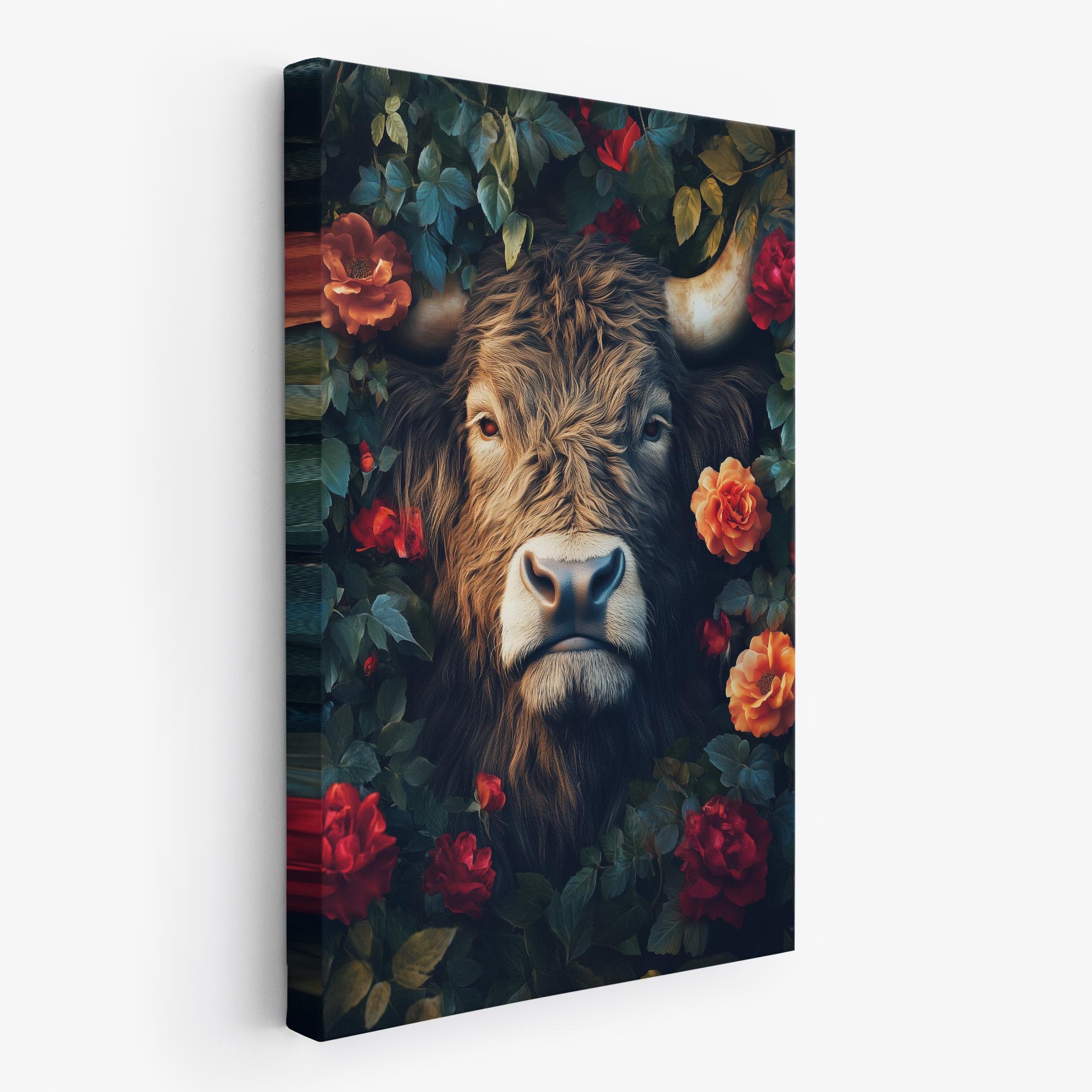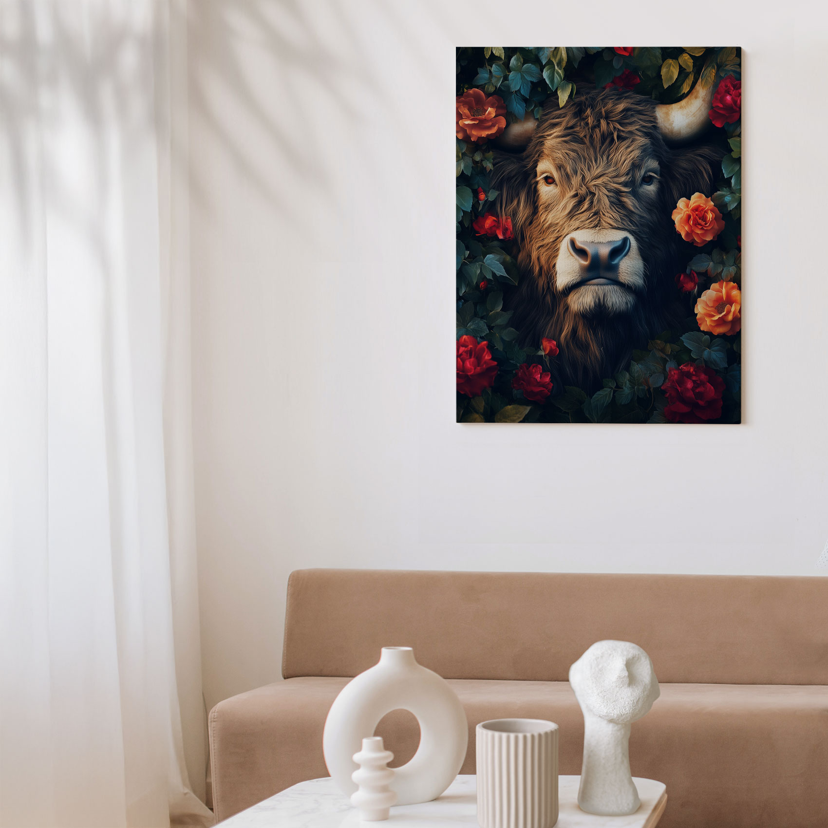Terug naar collectie / Schilderijen / Bloemen Schilderij / Stierenkop tussen kleurrijke bloemen