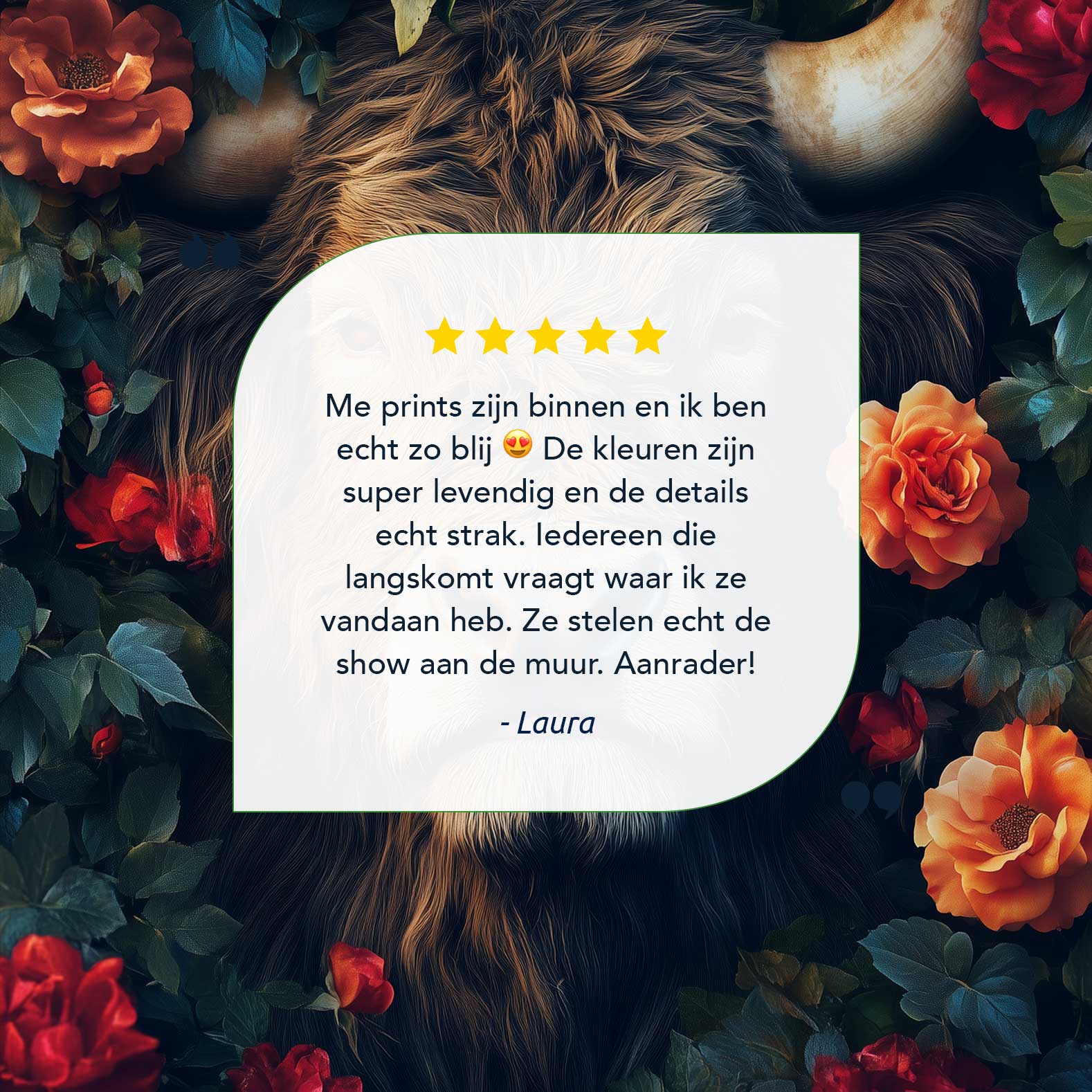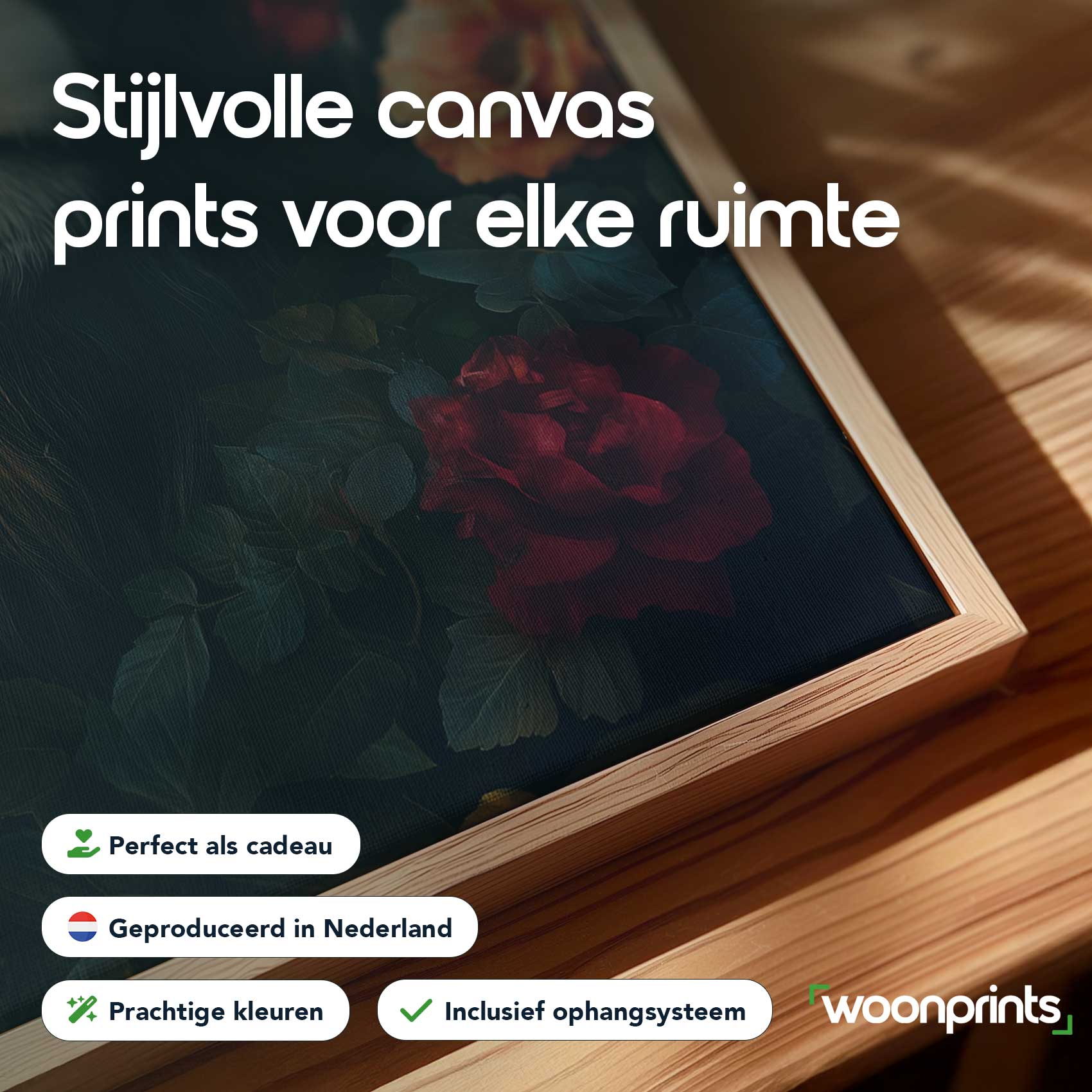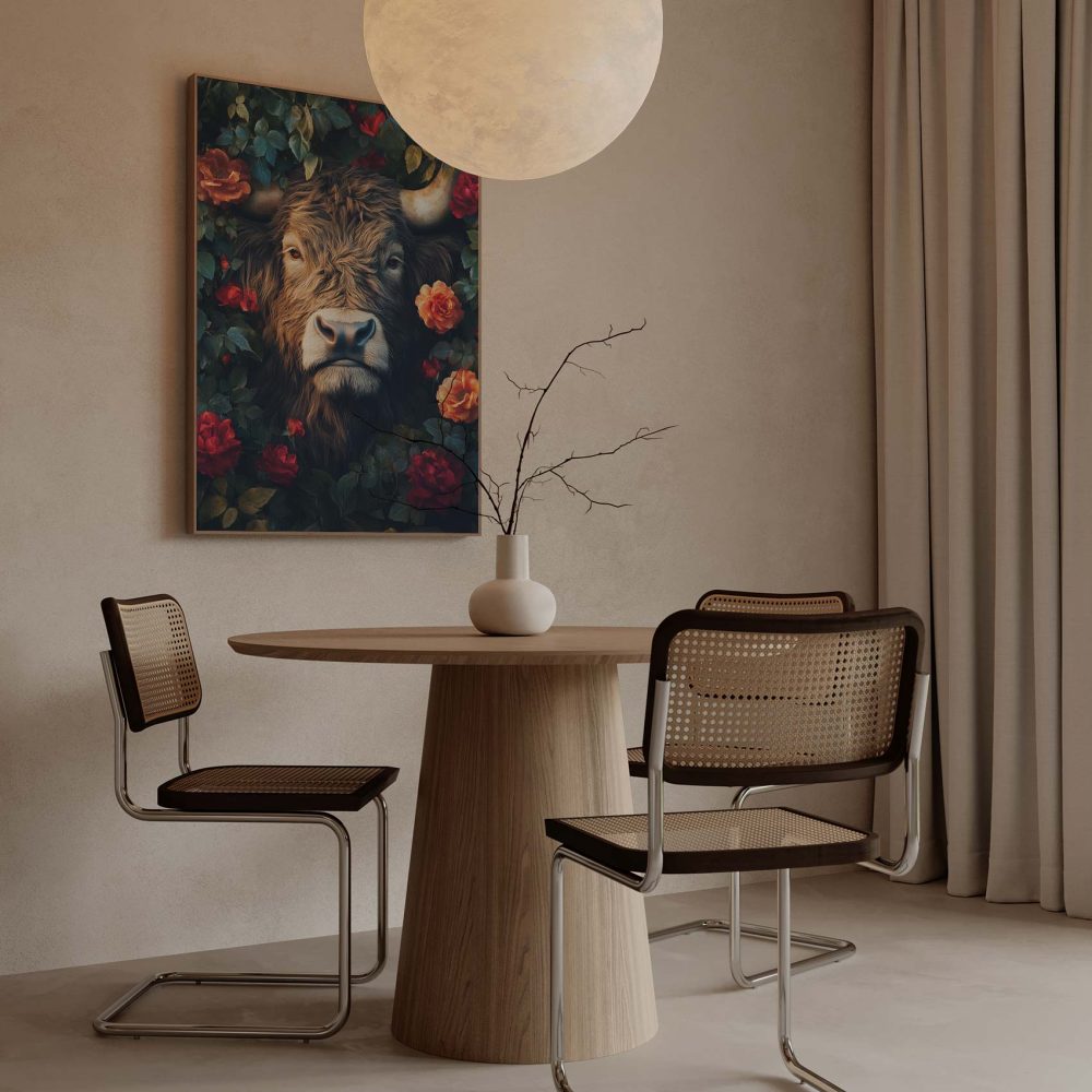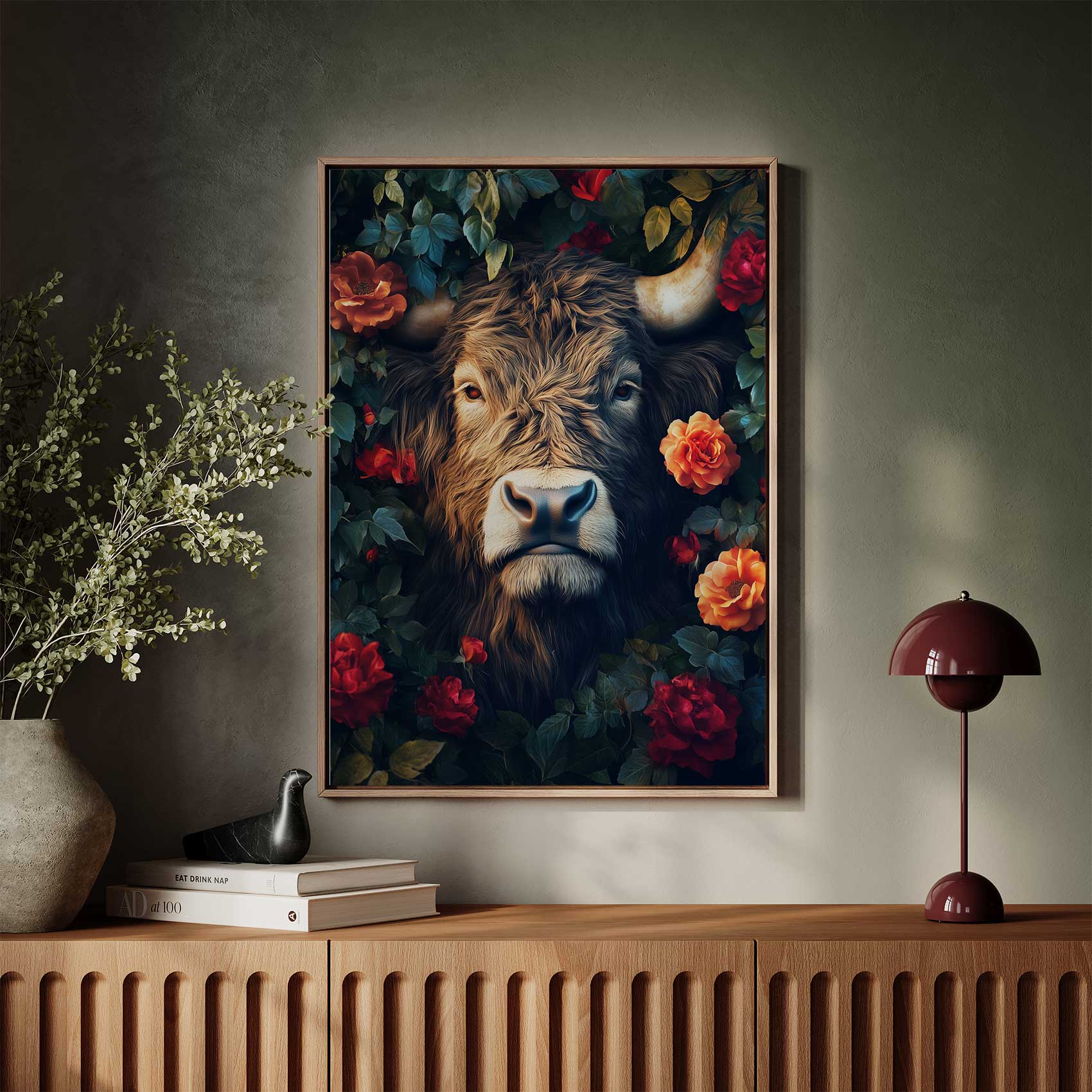 Terug naar collectie / Schilderijen / Bloemen Schilderij / Stierenkop tussen kleurrijke bloemen