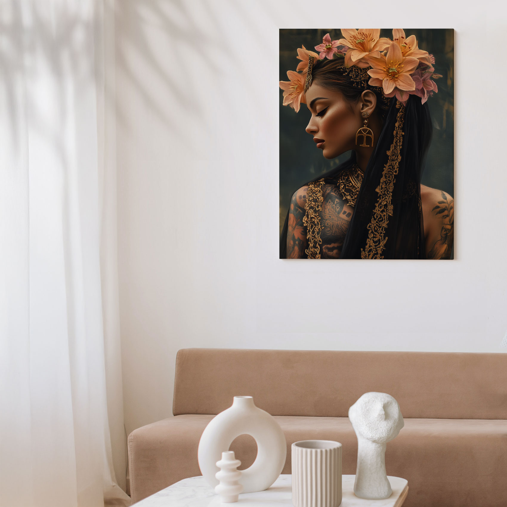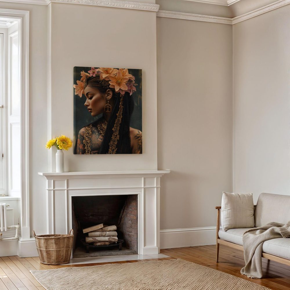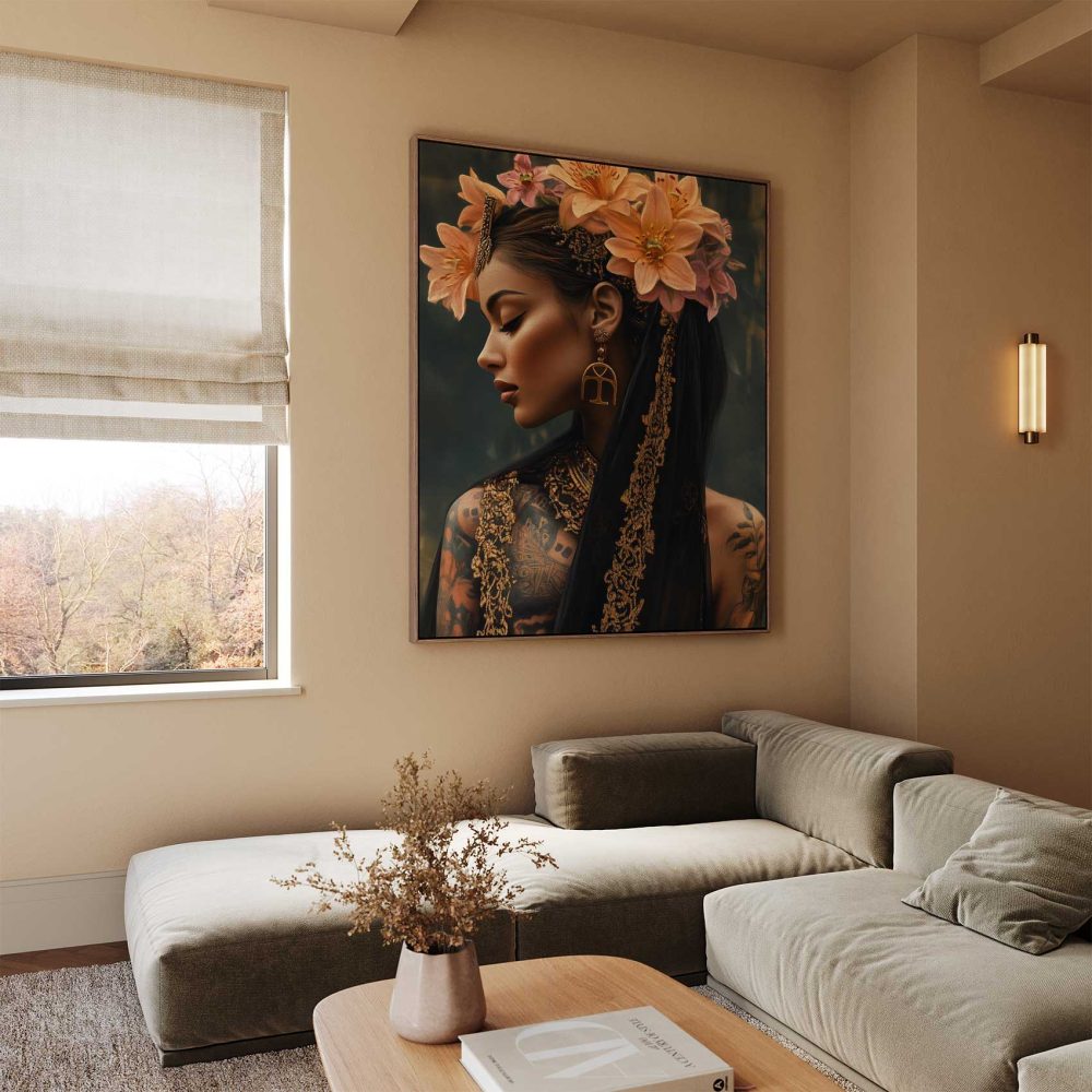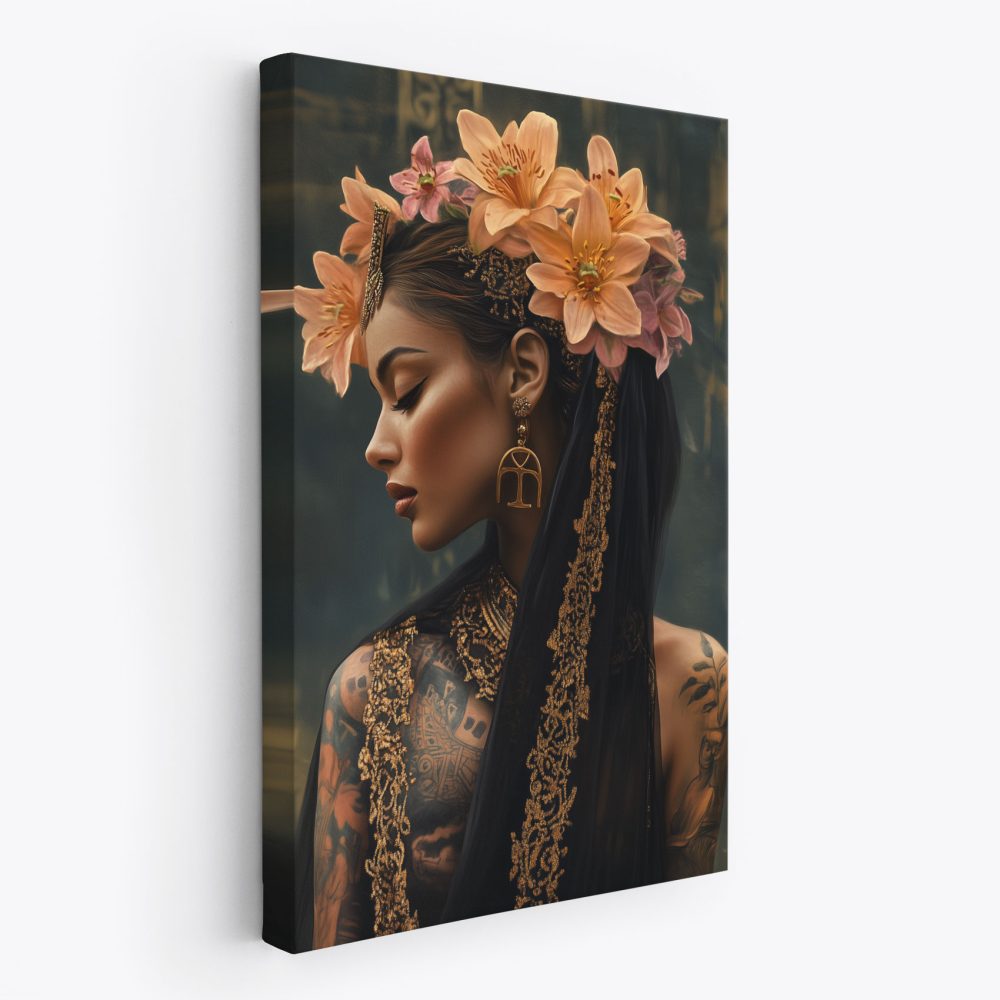 Terug naar collectie / Schilderijen / Bloemen Schilderij / Tattoo dame met bloemenkroon