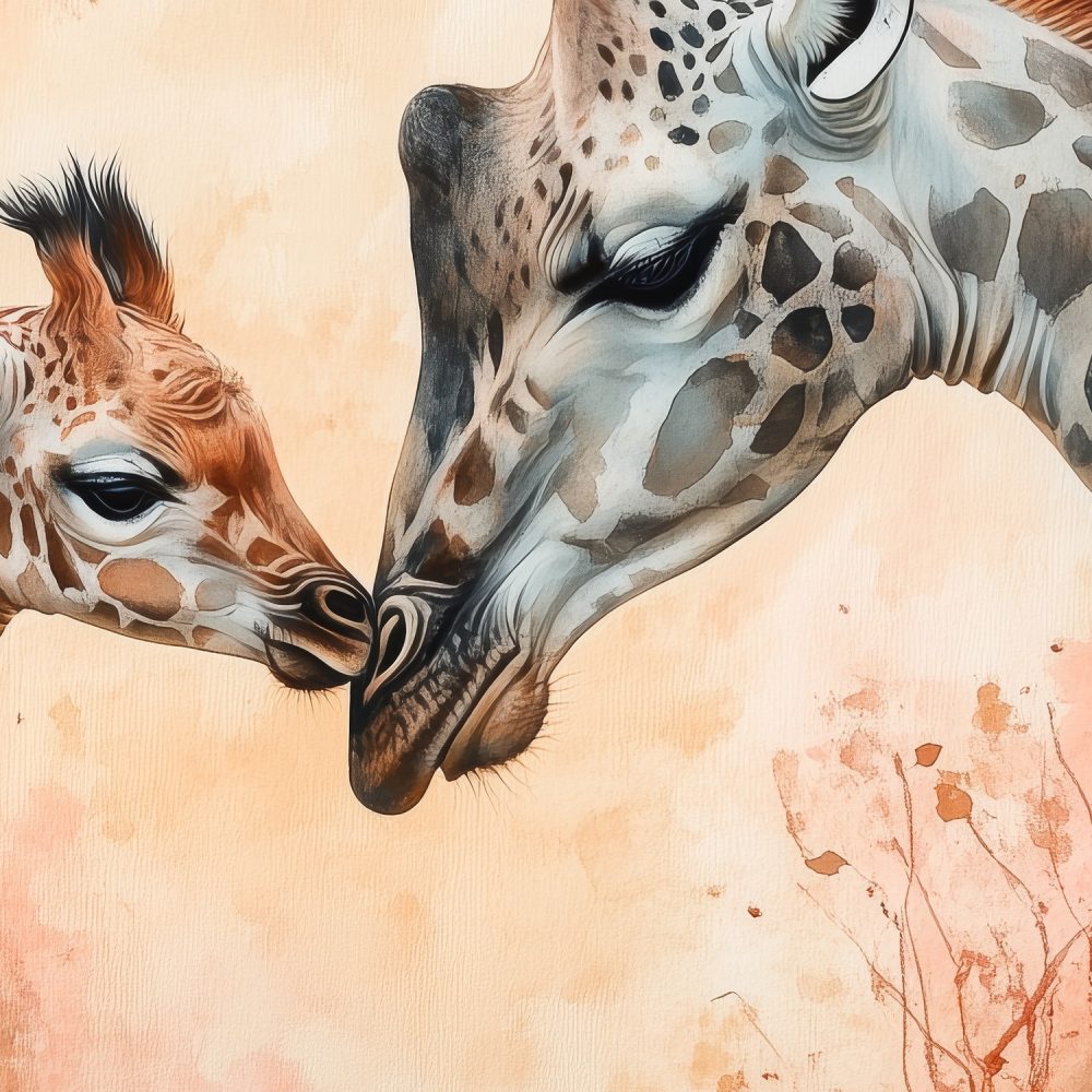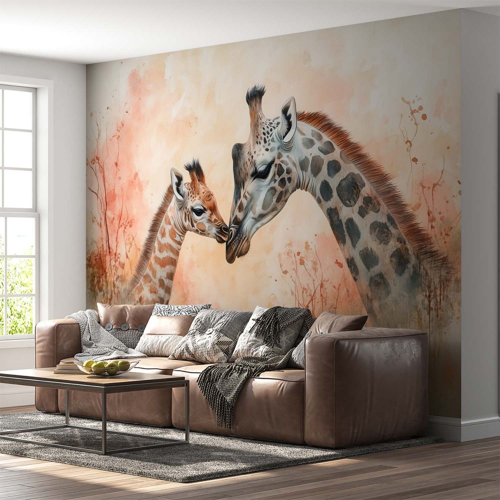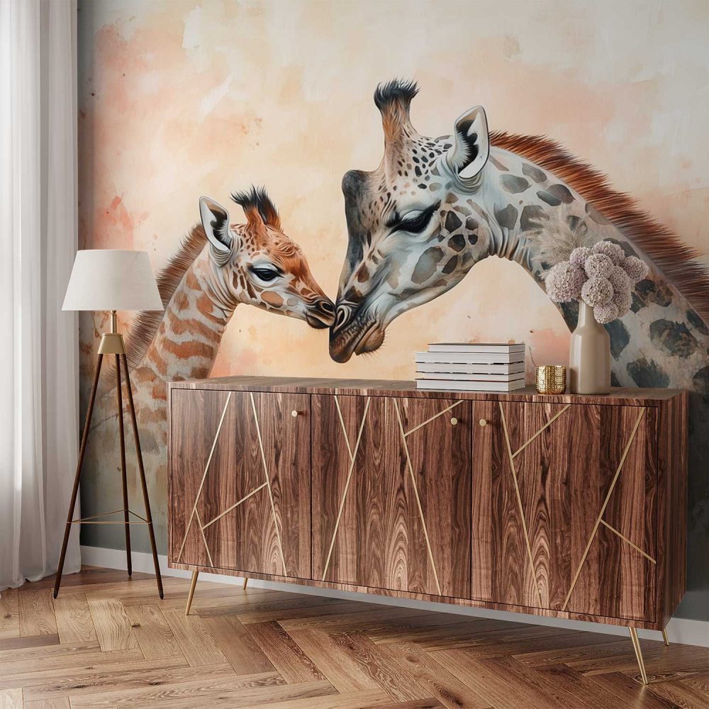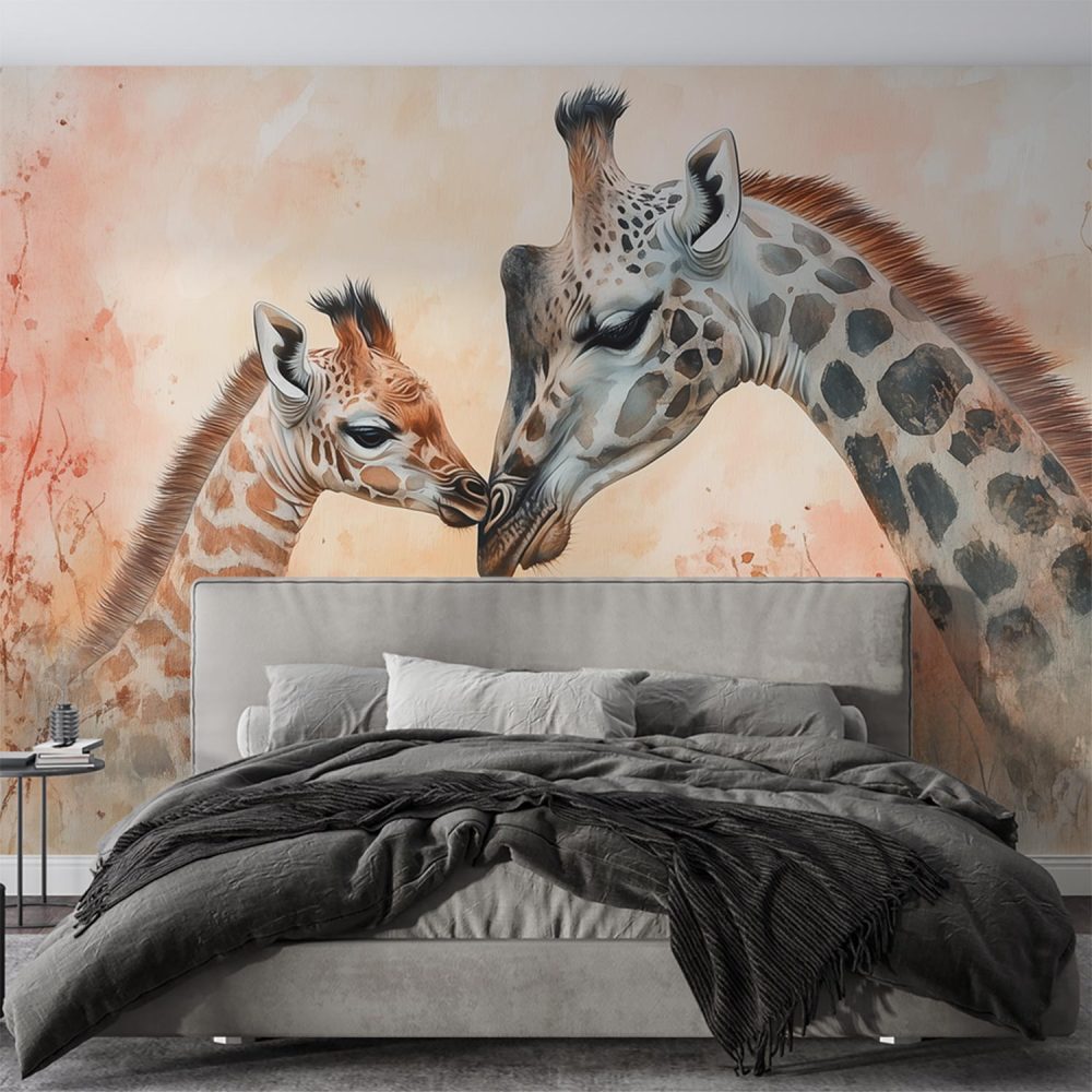 Teder giraffe moeder-kind moment behang