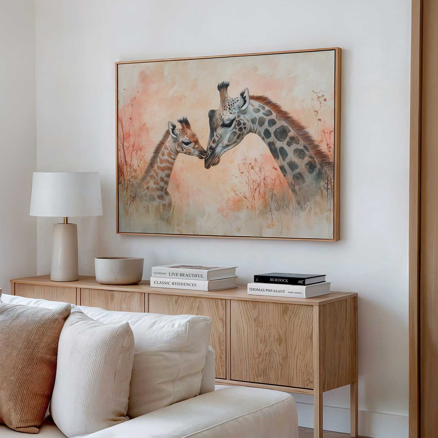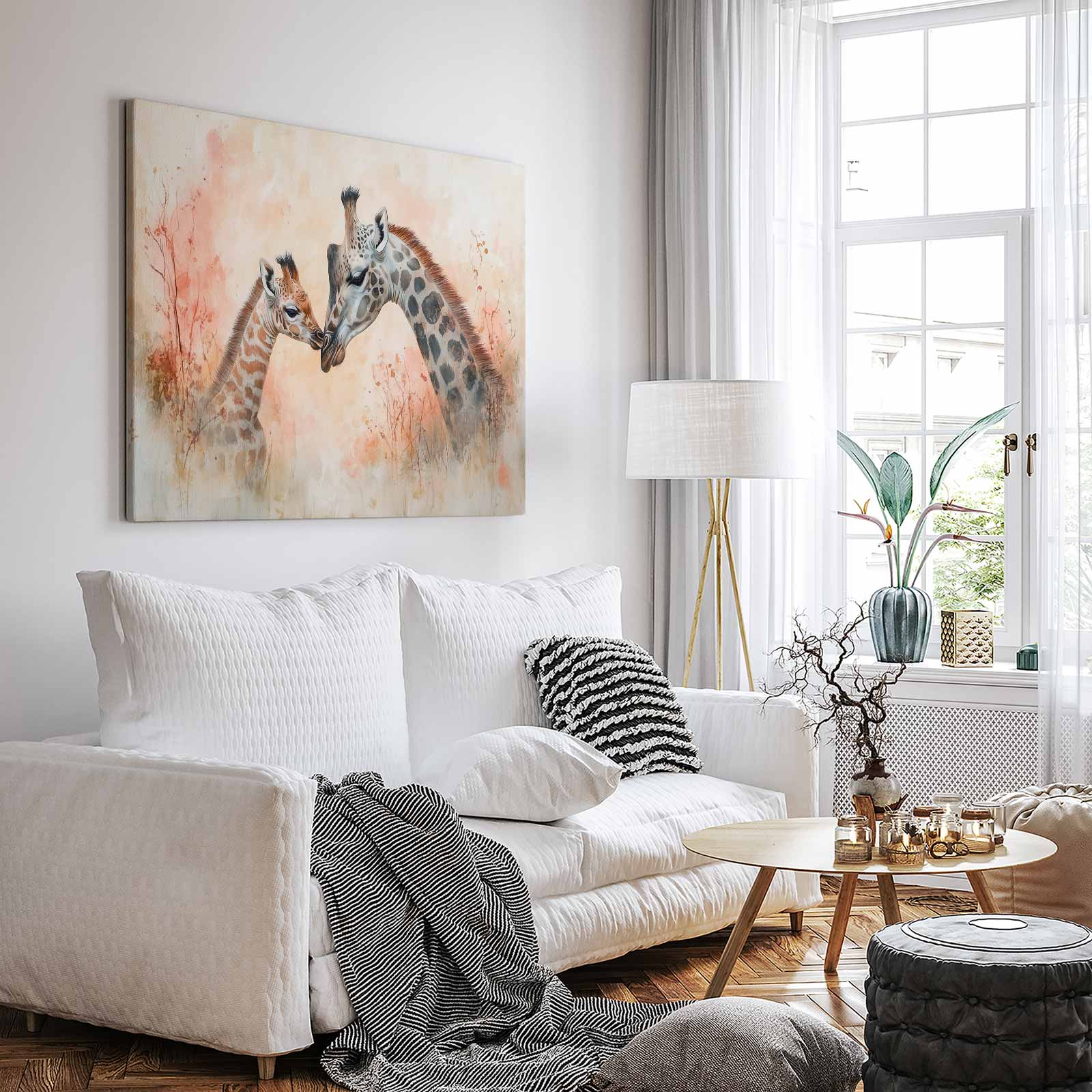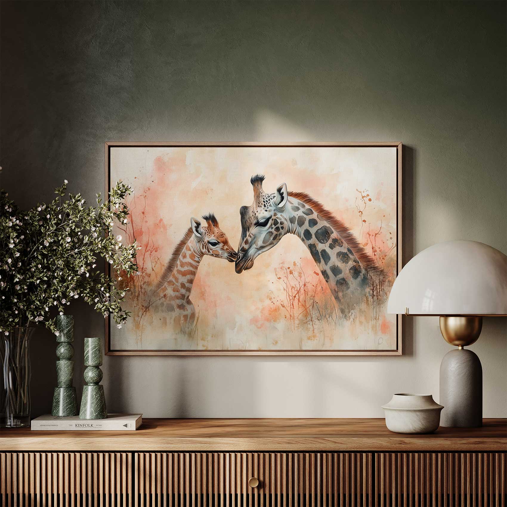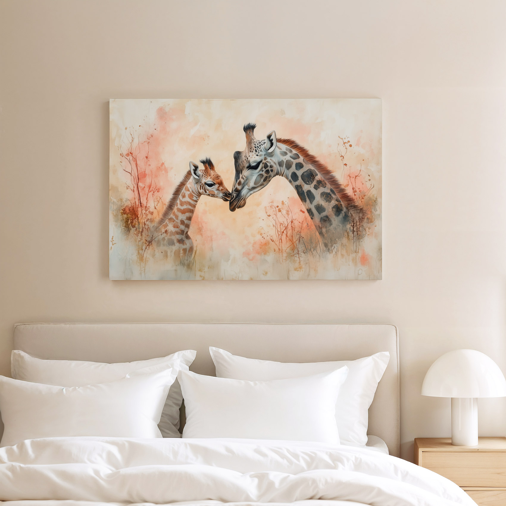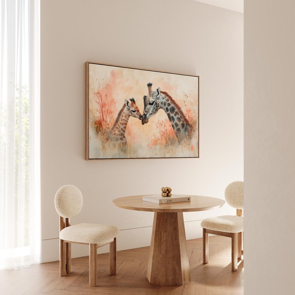 Teder moeder-kind giraffen schilderij