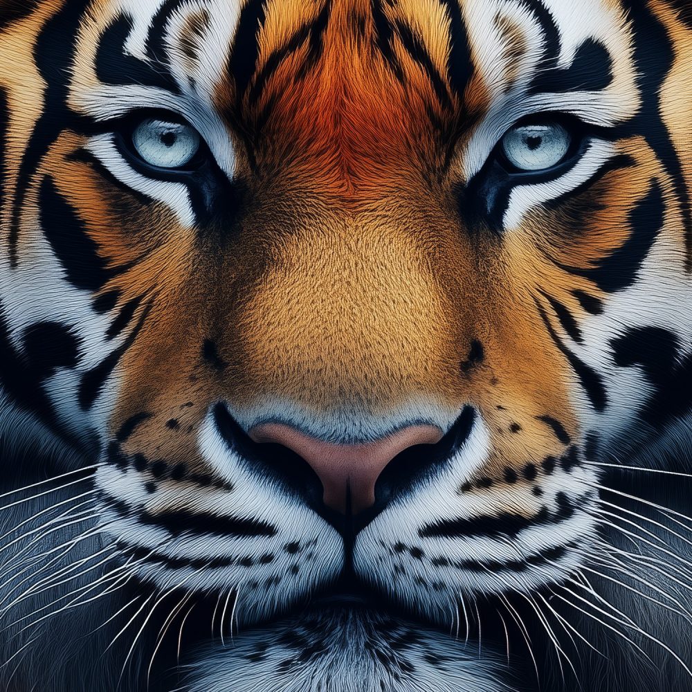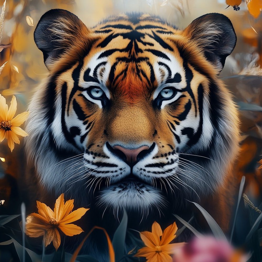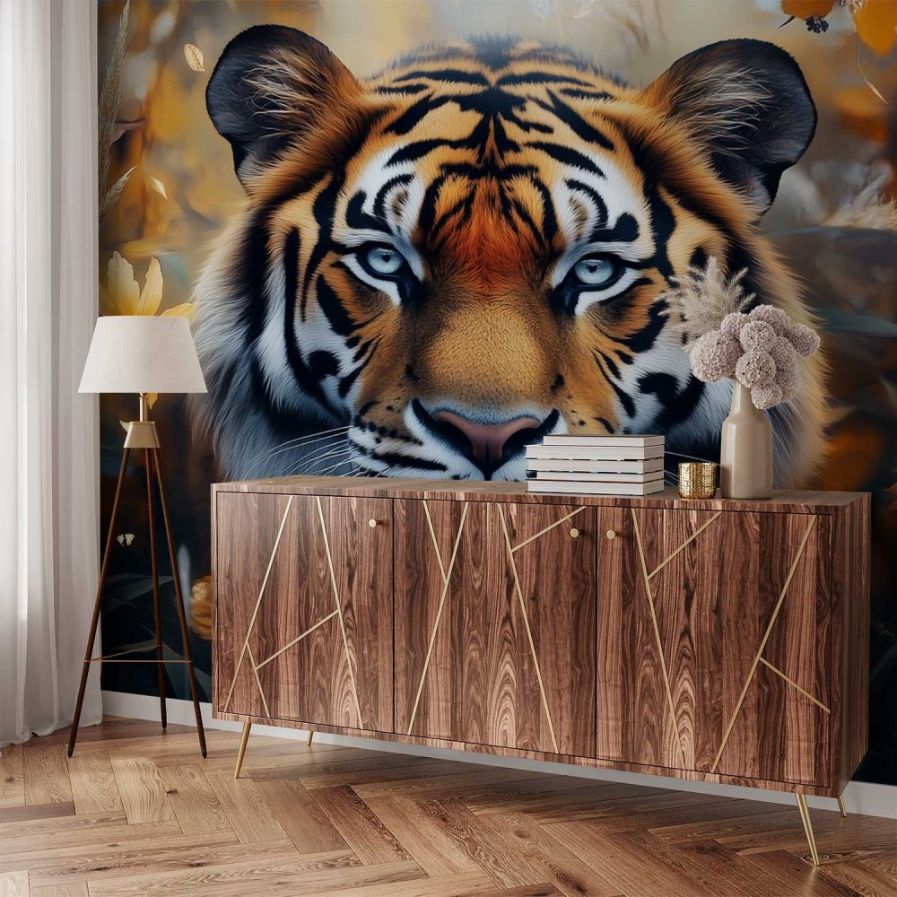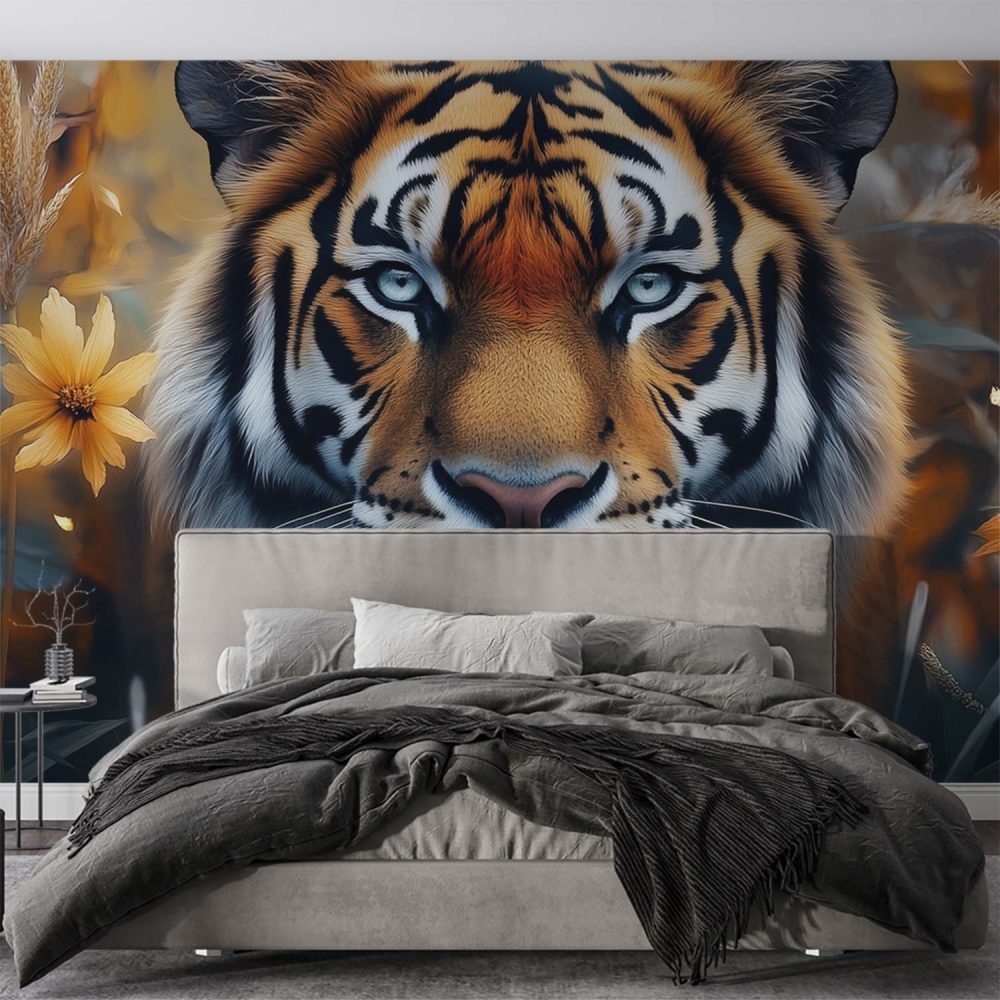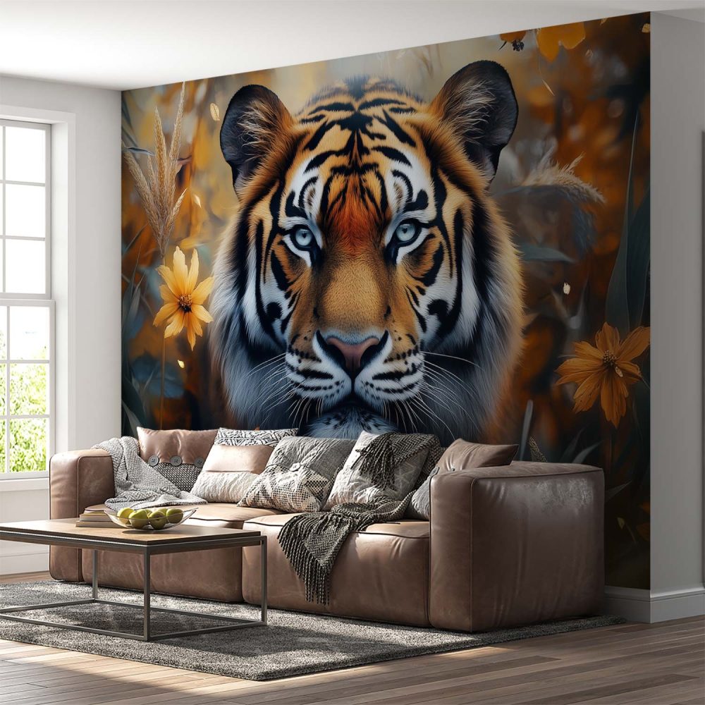 Tijger in bloeiende natuur behang