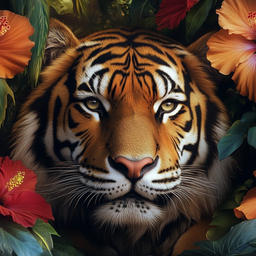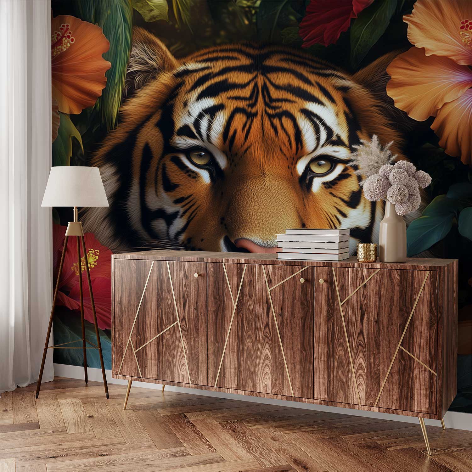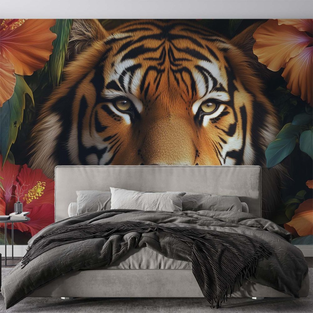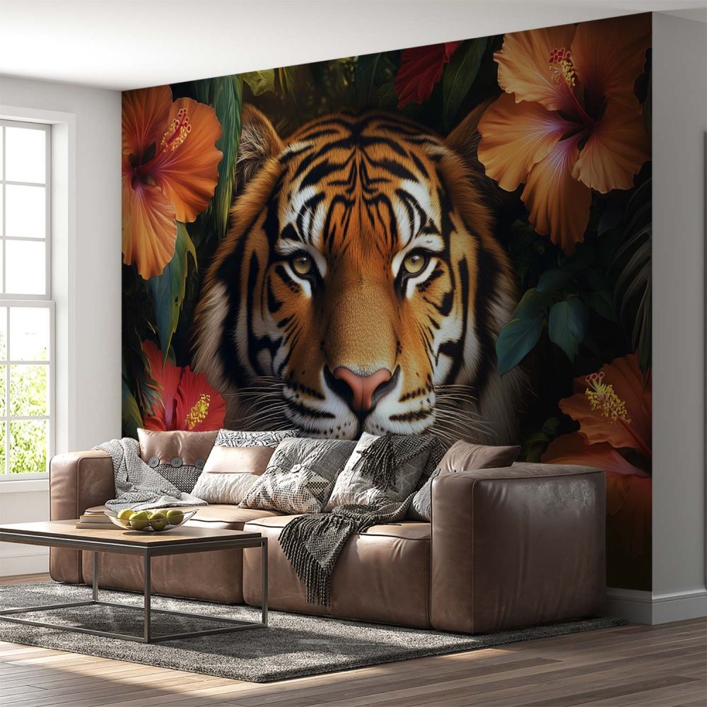 Tijger in kleurrijke bloemenpracht behang